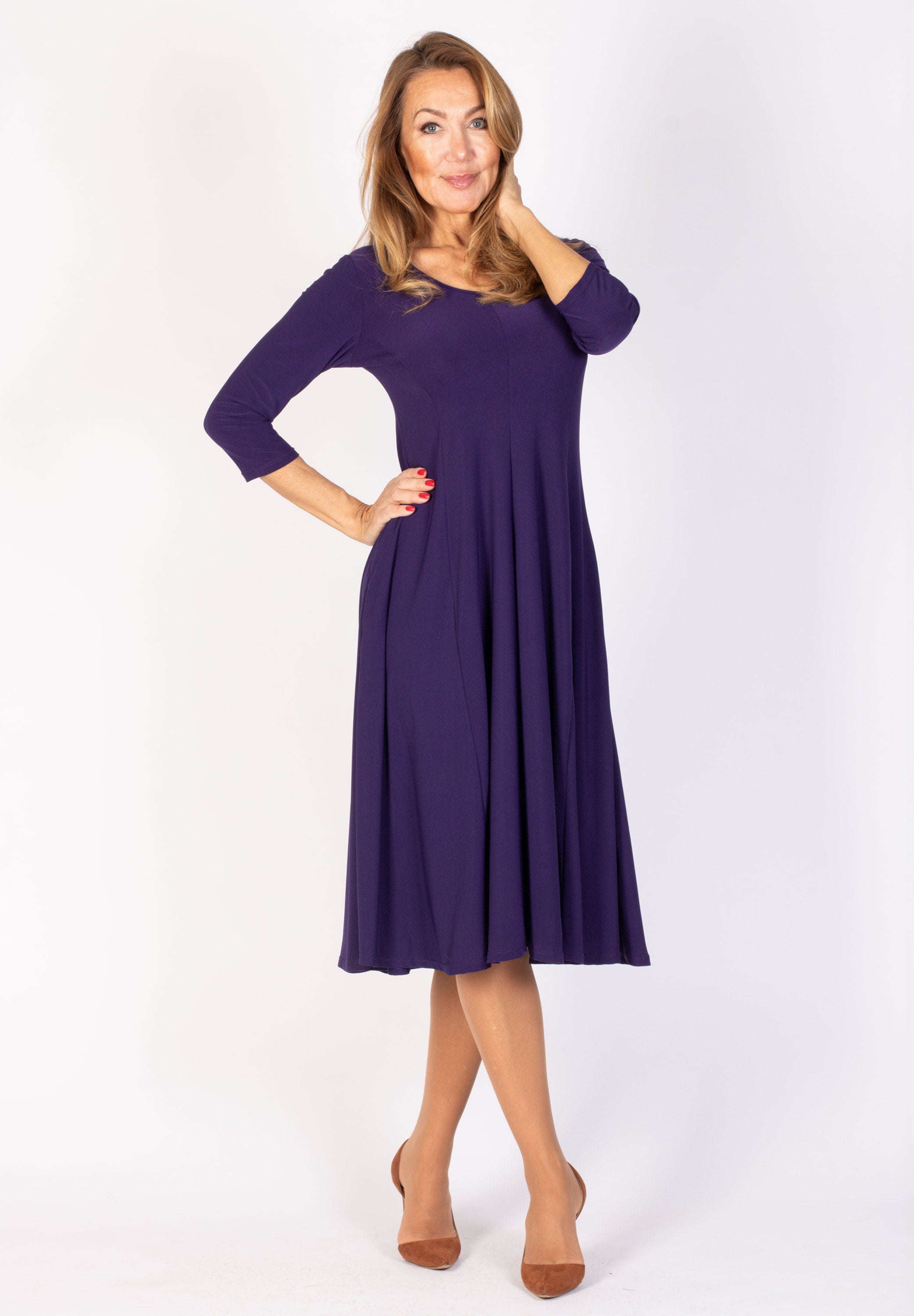 Klänningen har en figurnära överdel som sedan släpper i midjan som skapar ett fint fall. Vadlång a-linjeformad kjol med fickor i sidan. V-ringning samt trekvarts-ärm-