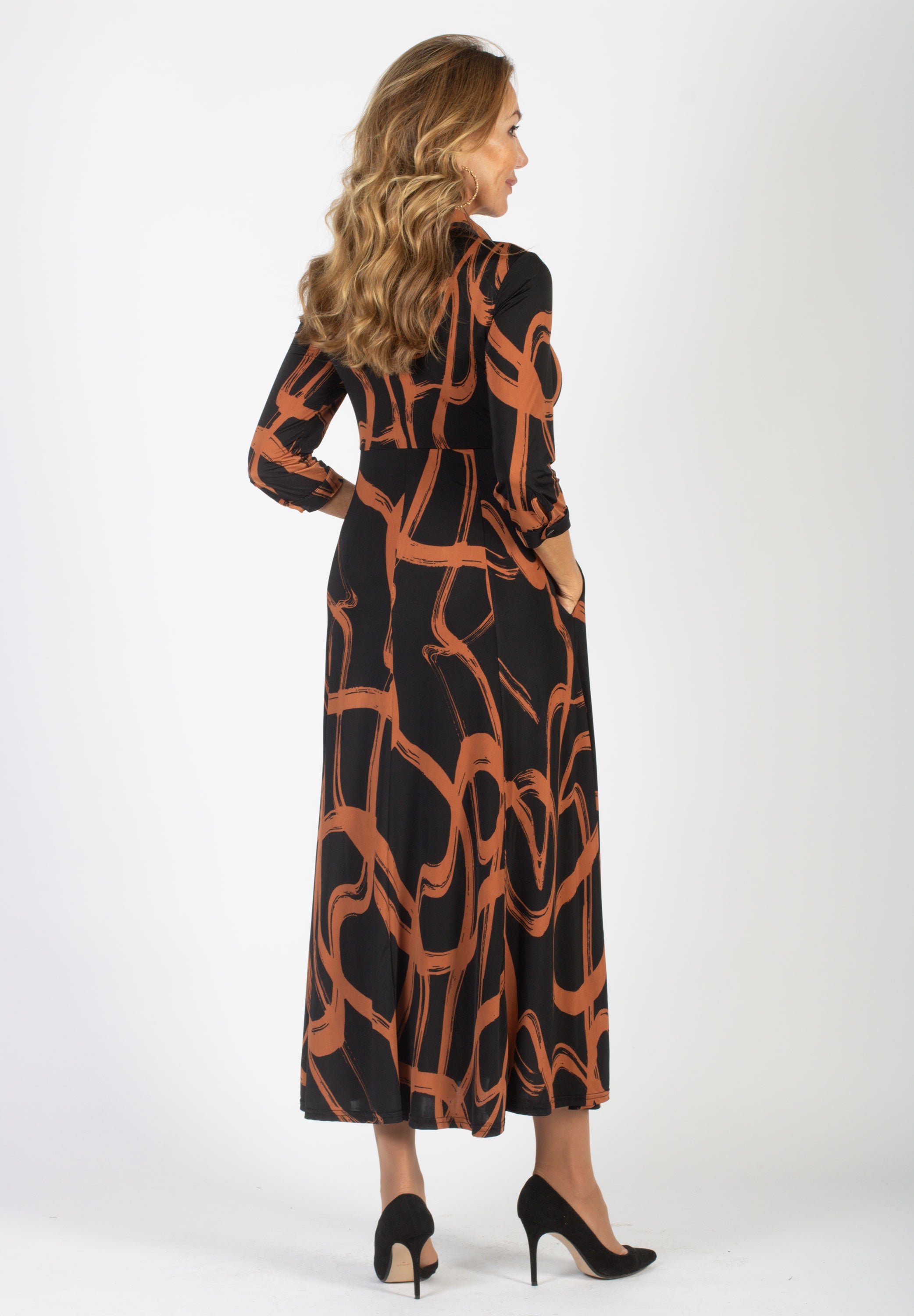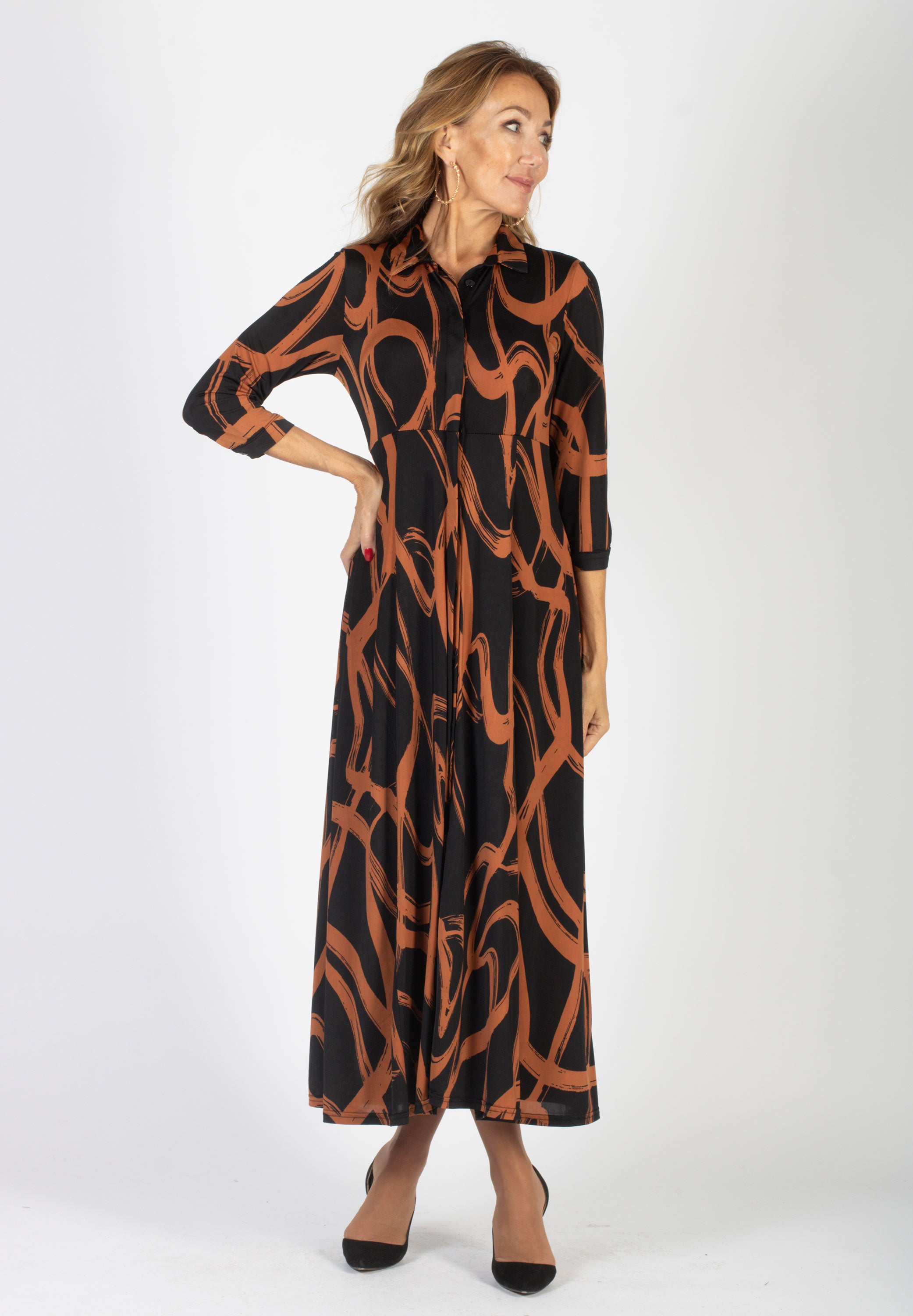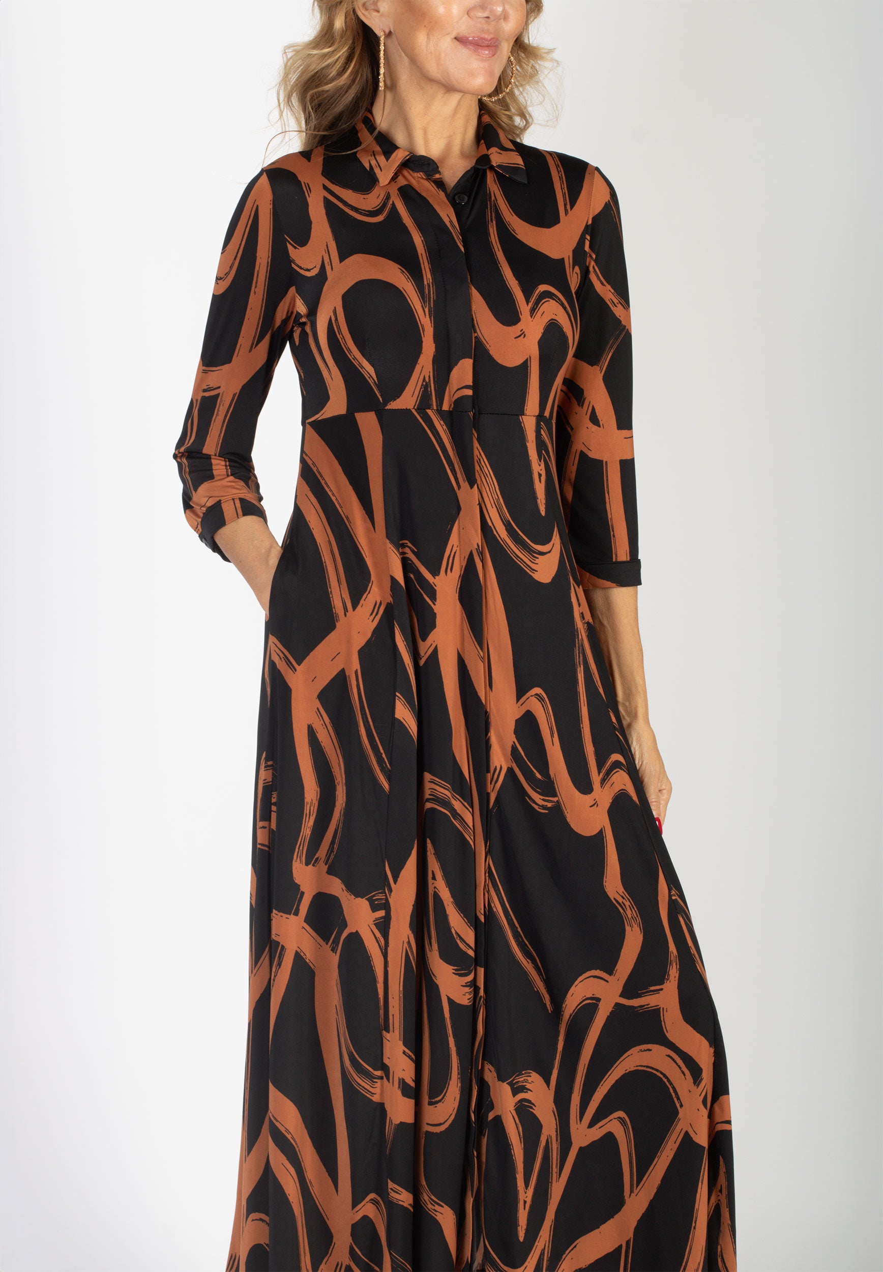 Lång skjortklänning med dold knäppning. Avskuren vid midja med utställd kjol med fickor. Snygg att bära både stängd och öppen.