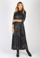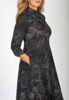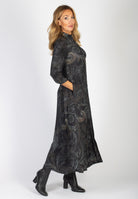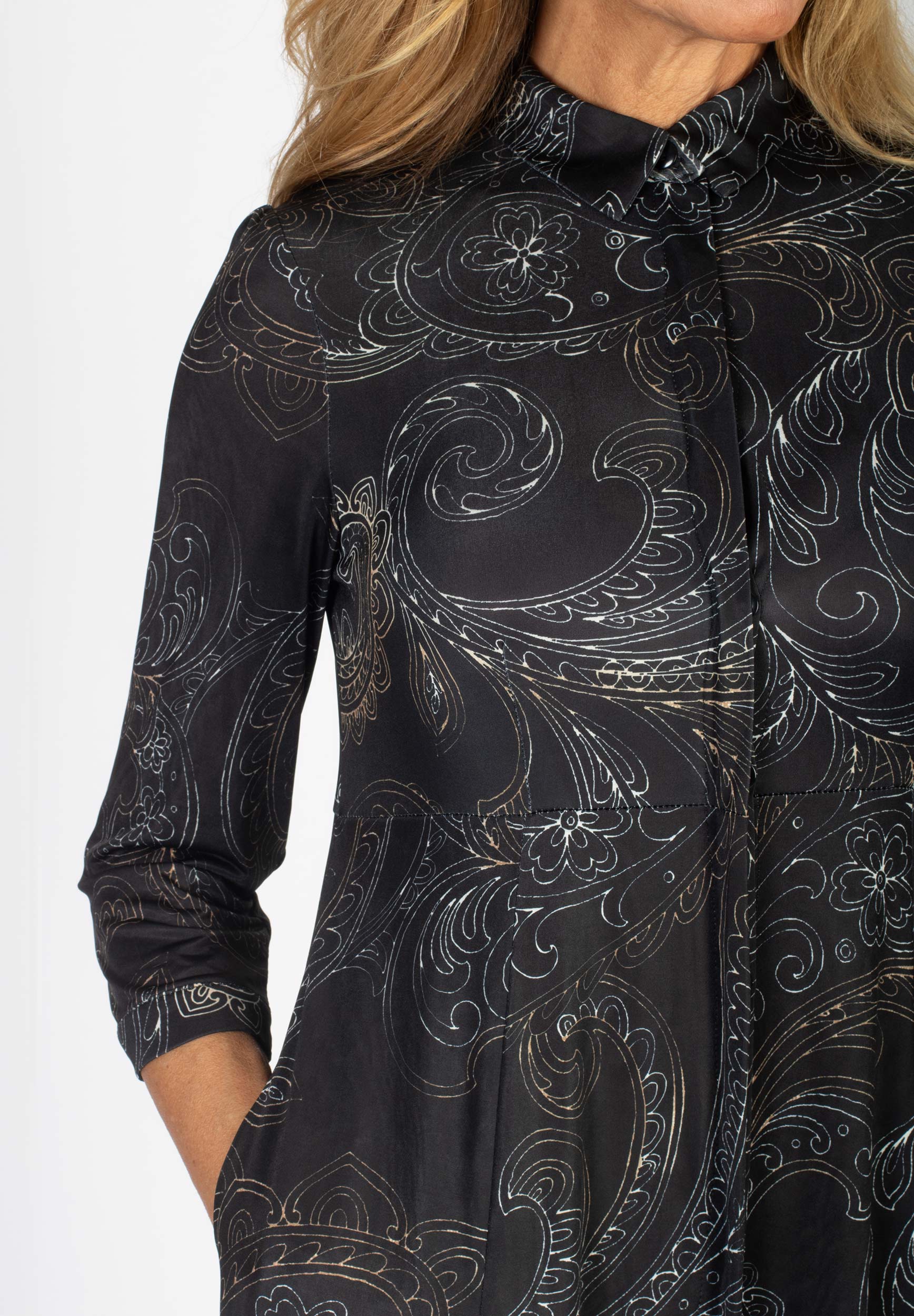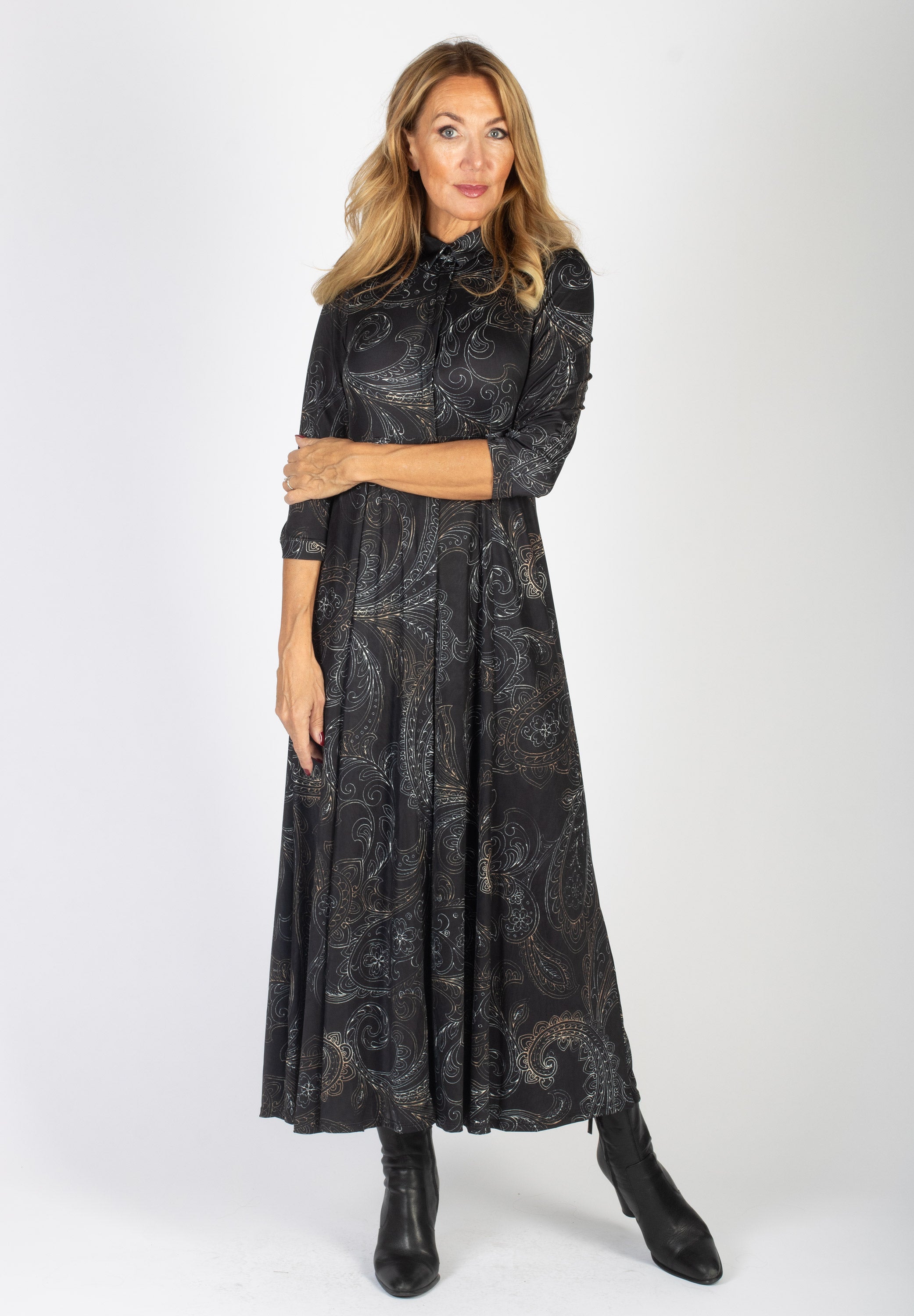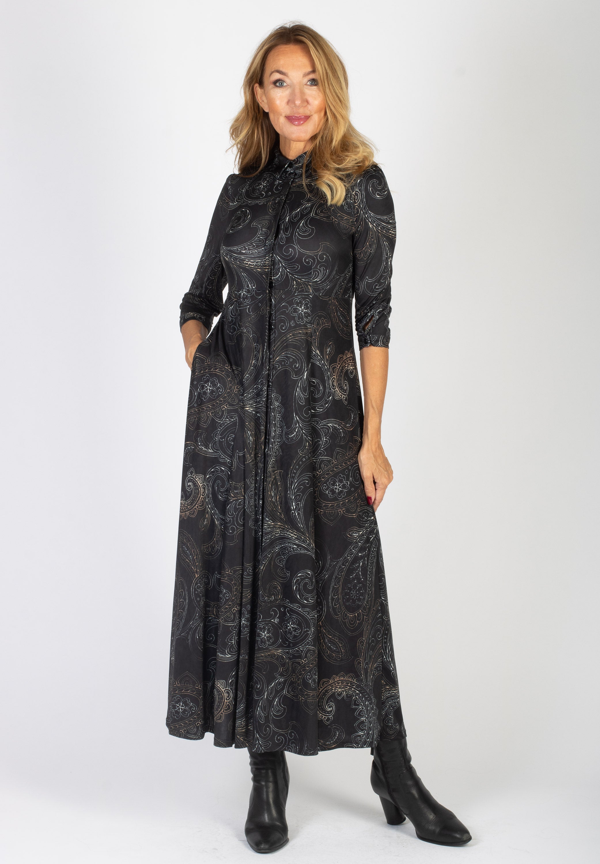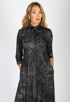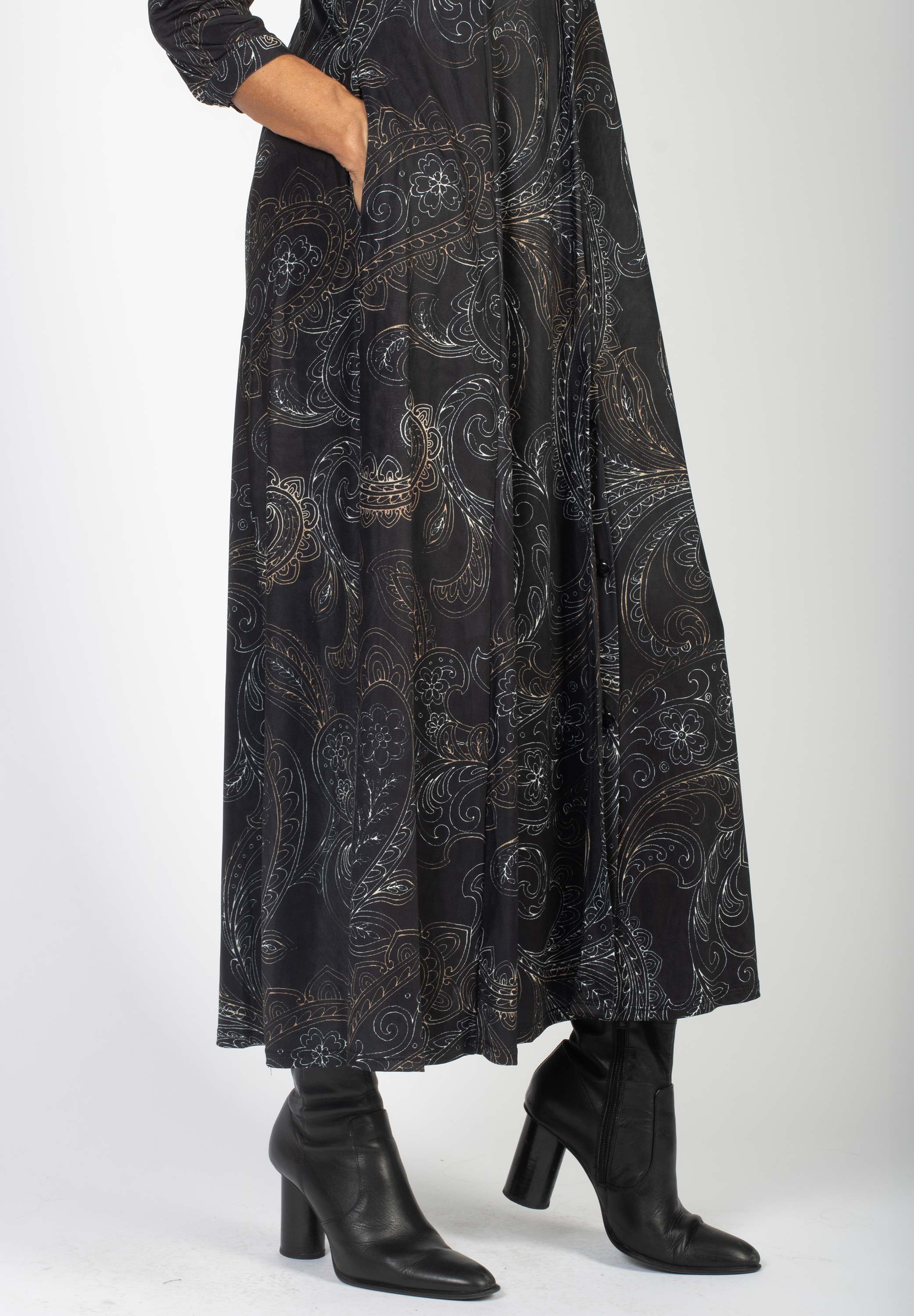 Lång svart skjortklänning med stort paisleymönster.