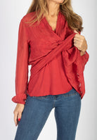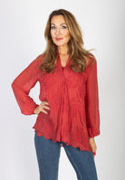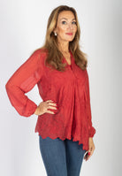 V-ringad blus med broderade detaljer. Blusen är lätt transparent och levereras med ett matchande underlinne för en bekväm och täckande passform. Lång ärm med resår i ärmslutet.