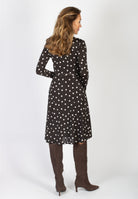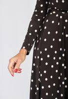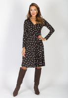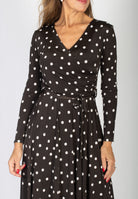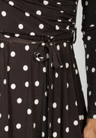 Klänningen har en figurnära draperad överdel som går i omlott. V-ringning och lång ärm. Klänningen är avskuren i midjan med en vid kjol. Avtagbart matchande skärp i midjan.