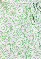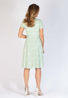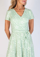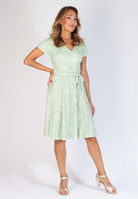 Klänningen har en figurnära draperad överdel som går i omlott. V-ringning och kort ärm. Klänningen är avskuren i midjan med en vid kjol. Avtagbart matchande skärp i midjan.