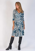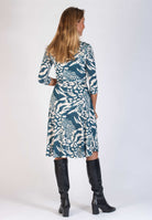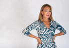 Klänningen har en figurnära draperad överdel som går i omlott. V-ringning och trekvarts-ärm. Klänningen är avskuren i midjan med en vid kjol. Avtagbart matchande skärp i midjan.