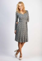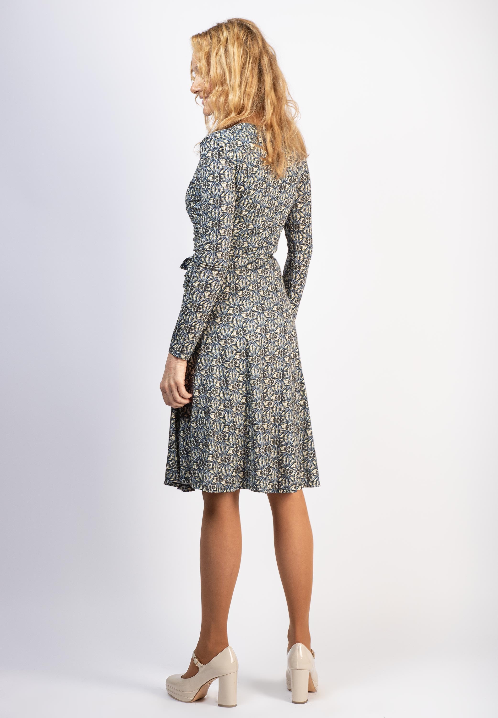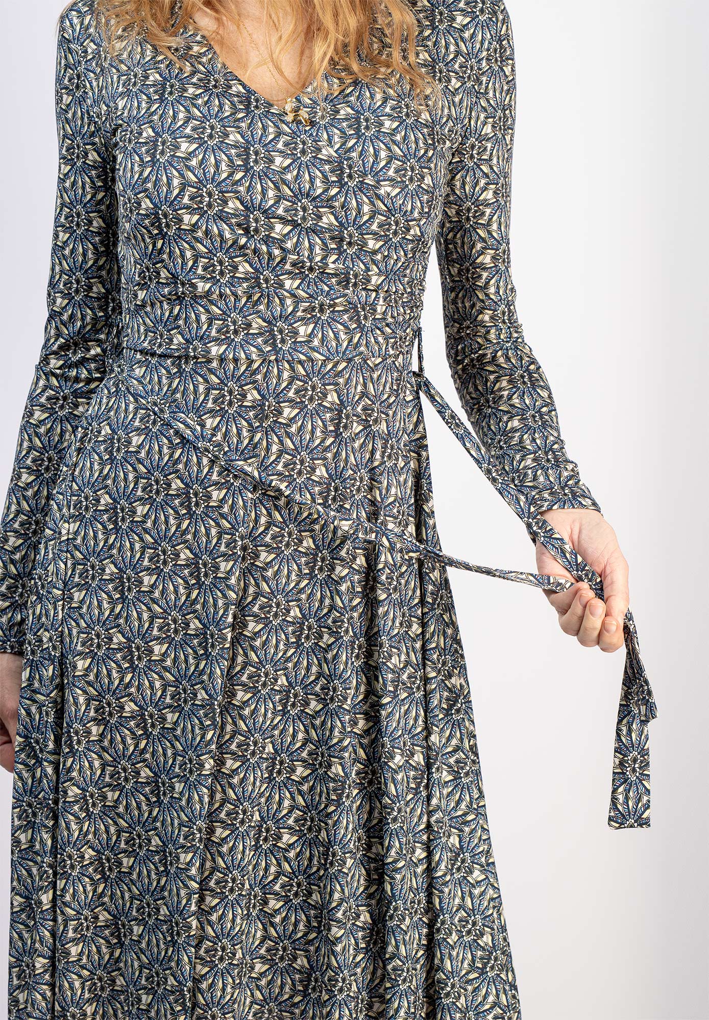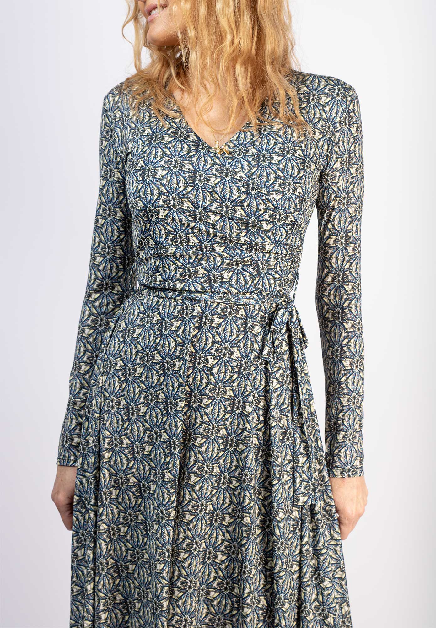 Blå midiklänning med mönster i gul och grönt.