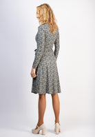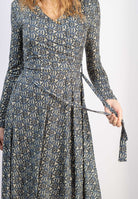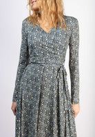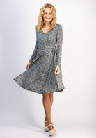 Klänningen har en figurnära draperad överdel som går i omlott. V-ringning och lång ärm. Klänningen är avskuren i midjan med en vid kjol. Avtagbart matchande skärp i midjan.