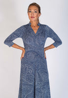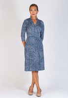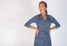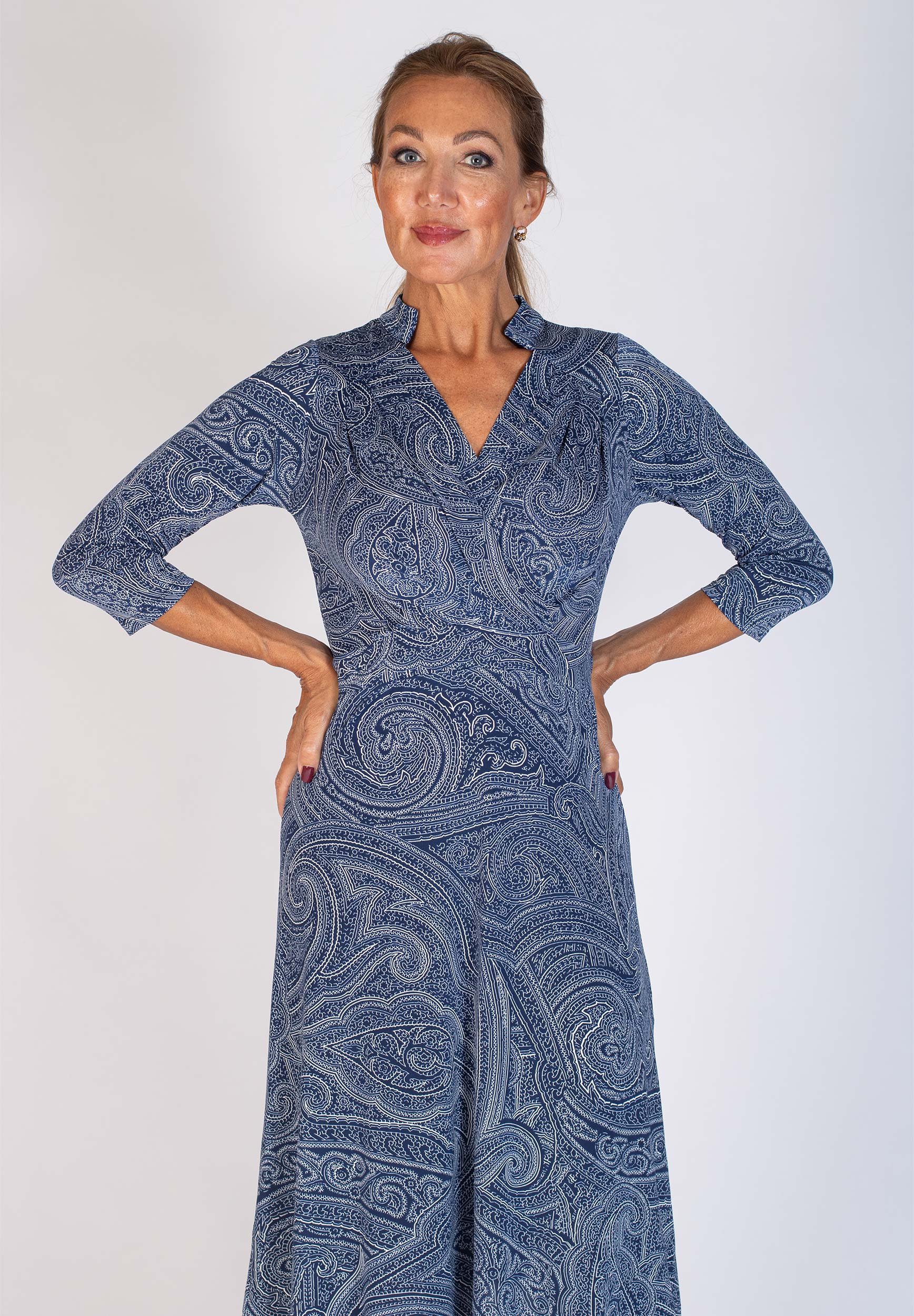 Klänningen har en figurnära överdel som ger en smickrande siluett och trekvarts-ärm. V-ringning med en stående krage. Avskuren i midjan med ett smalt band som knyts bak i ryggen.