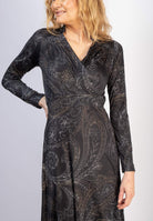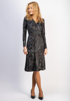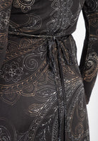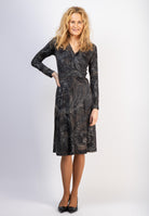 Klänningen har en figurnära överdel som ger en smickrande siluett och lång ärm. V-ringning med en stående krage. Avskuren i midjan med ett smalt band som knyts bak i ryggen.