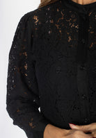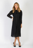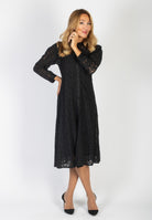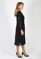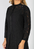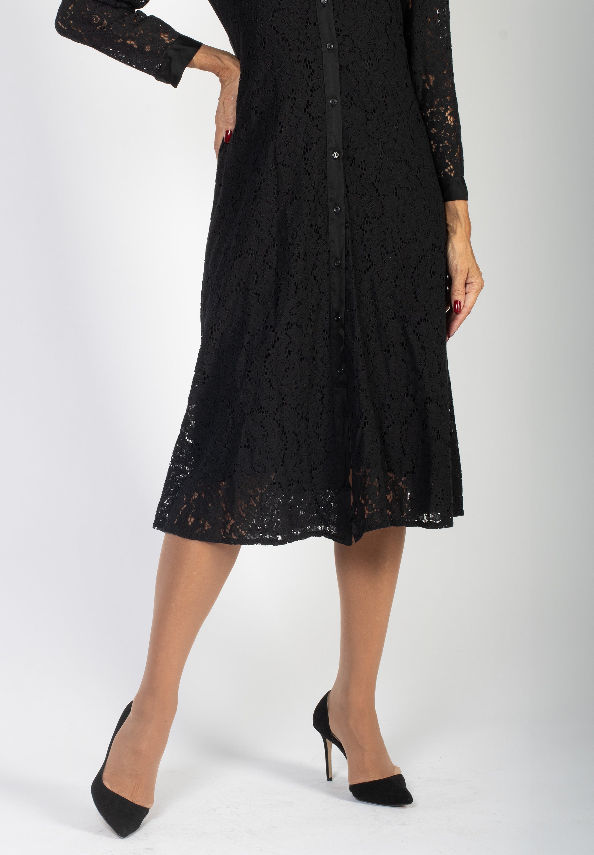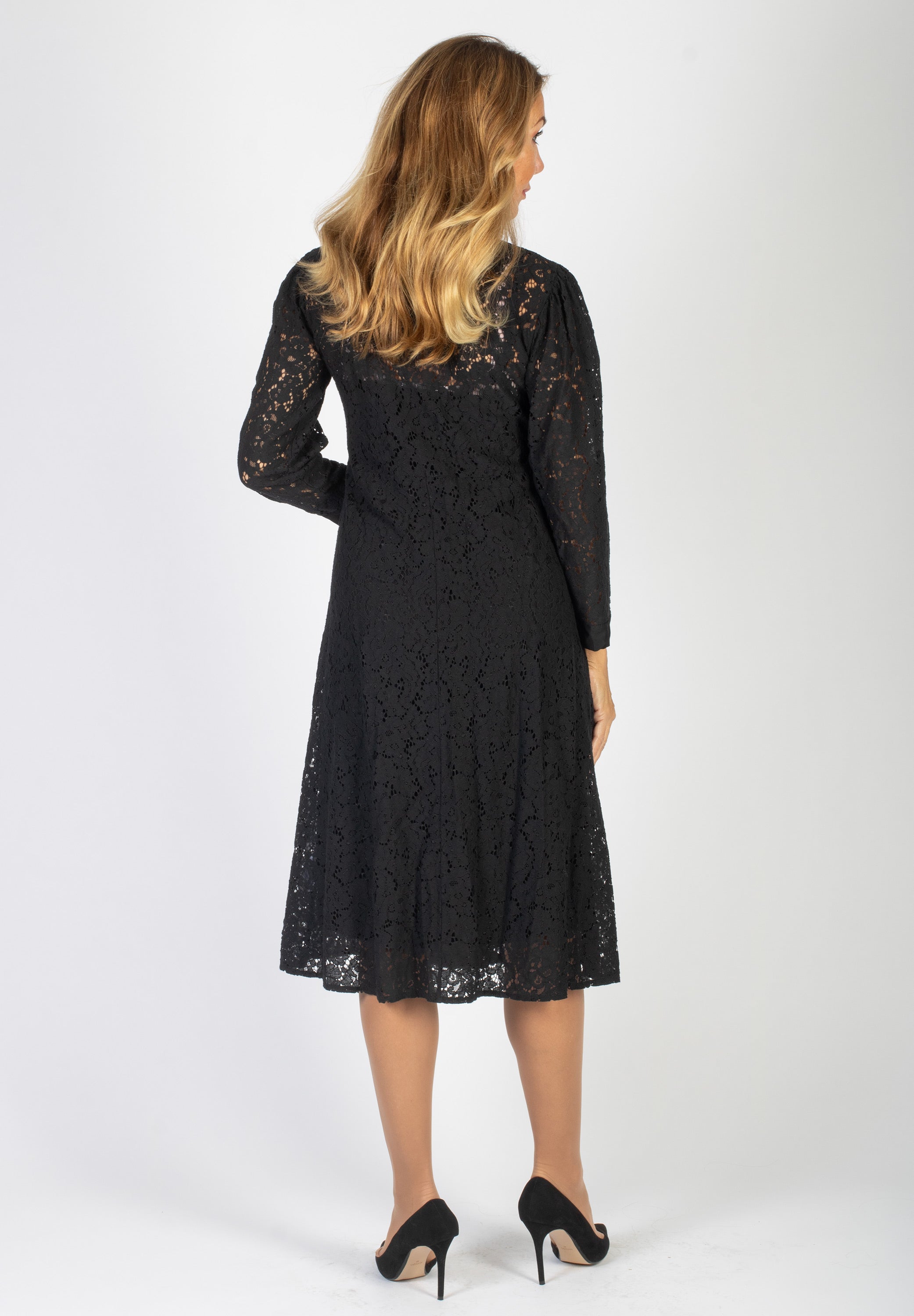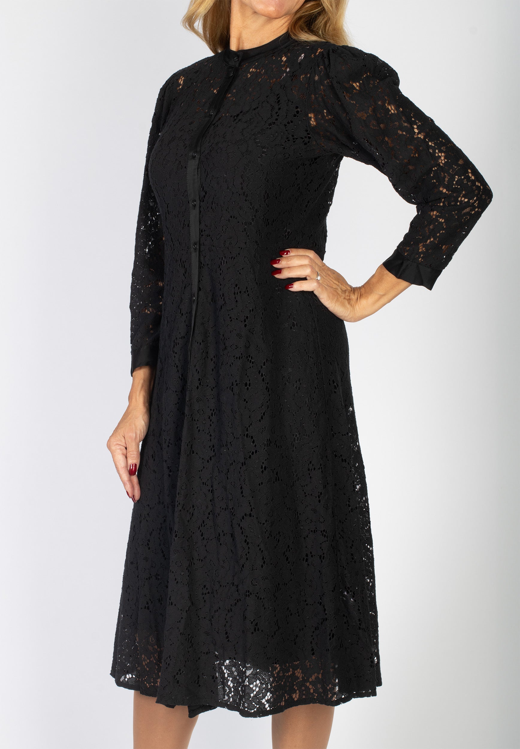 Spetsklänning med puffärm. Klänningen har långa ärmar och är tillverkad av ett spetsmaterial som ger en feminin och romantisk känsla. Framtill finns knappar längs hela längden av klänningen. Underklänning i matchande färg.