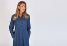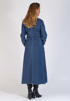 Blå maxiklänning i bomull med skjortkrage. Skön bomullsdenim med stretch. Klänningen har tryckknappar hela vägen och är avskuren i midjan med utställd kjol och fickor i sidorna. Lång ärm med tryckknapp i ärmslut.