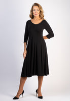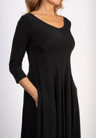Klänningen har en figurnära överdel som sedan släpper i midjan som skapar ett fint fall. Vadlång a-linjeformad kjol med fickor i sidan. V-ringning samt trekvarts-ärm