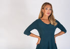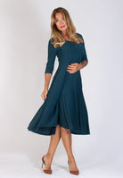 Klänningen har en figurnära överdel som sedan släpper i midjan som skapar ett fint fall. Vadlång a-linjeformad kjol med fickor i sidan. V-ringning samt trekvarts-ärm