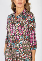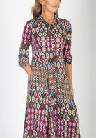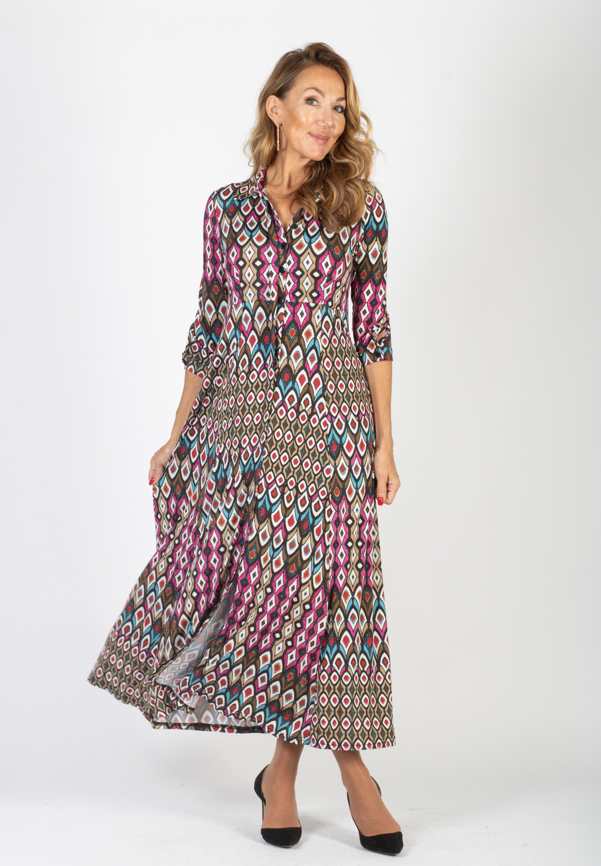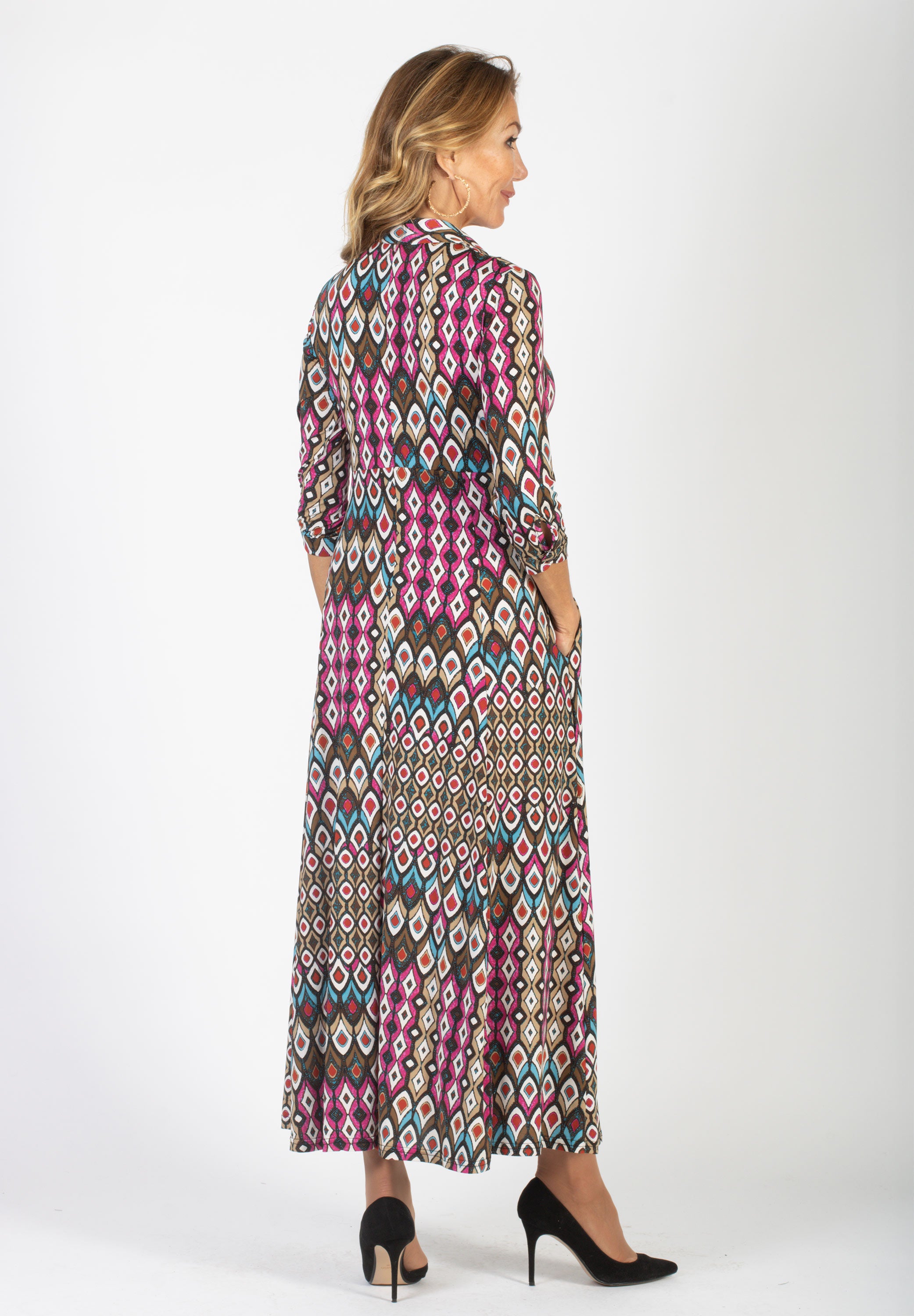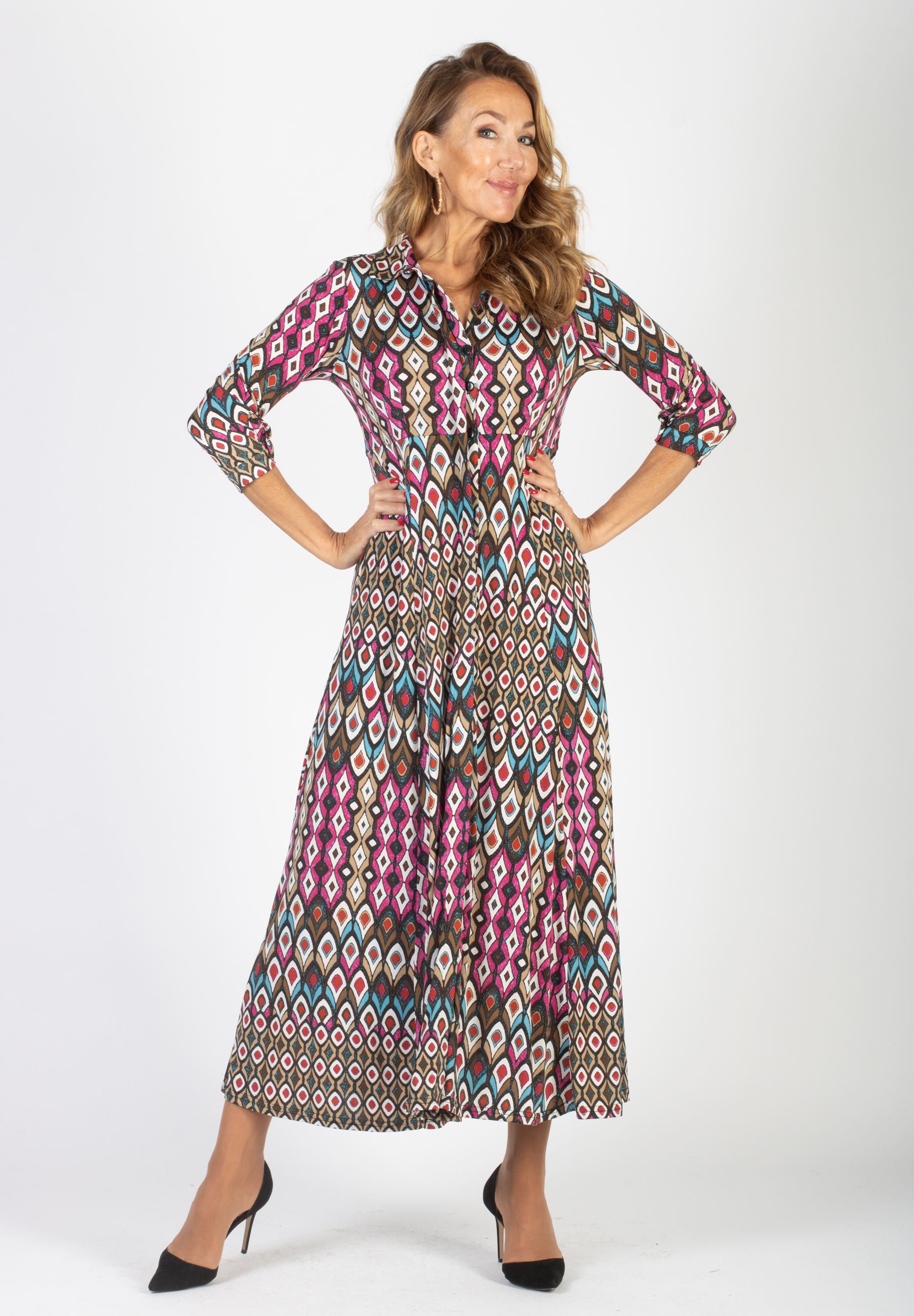 Lång skjortklänning med dold knäppning. Avskuren vid midja med utställd kjol med fickor. Snygg att bära både stängd och öppen.