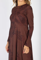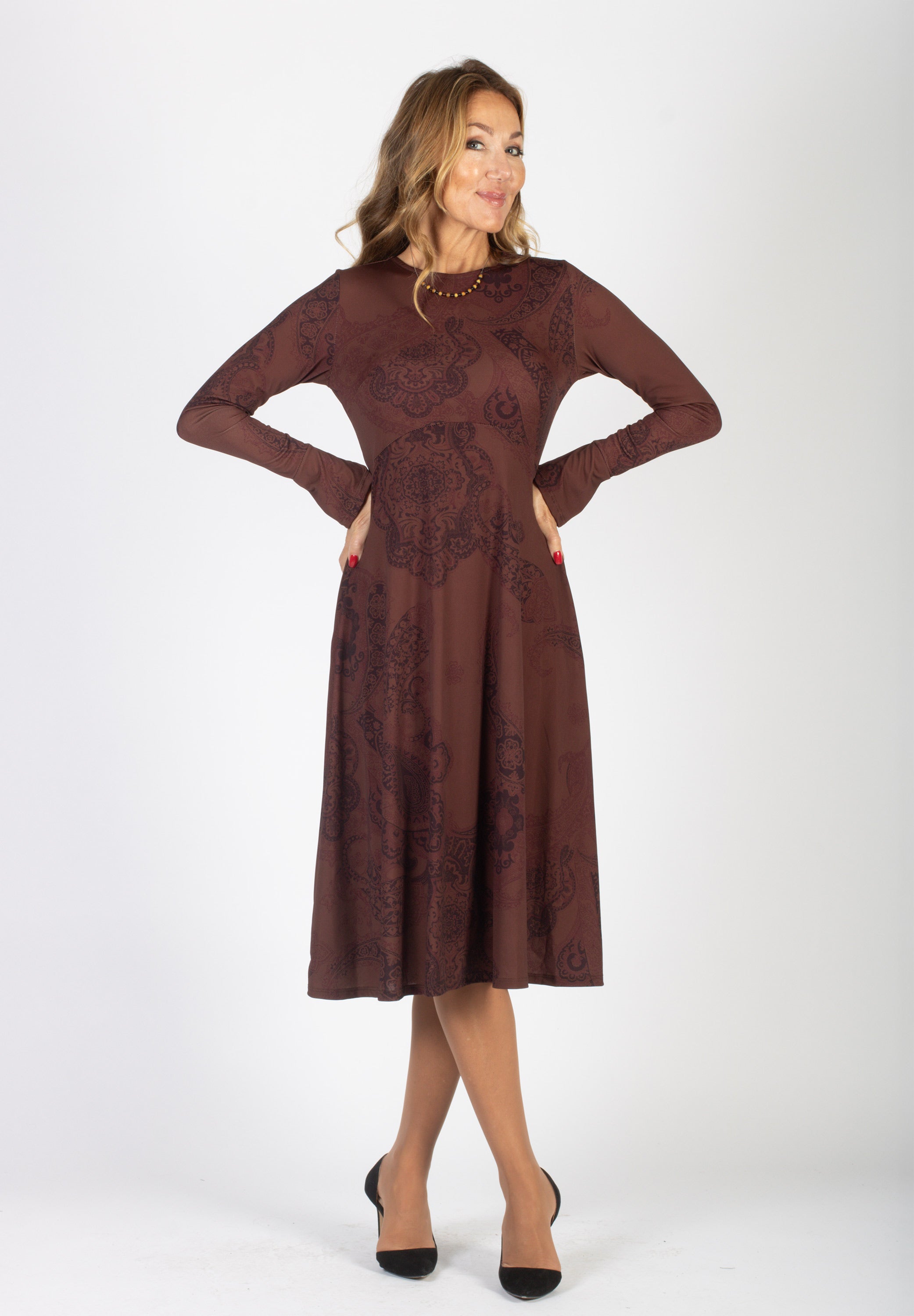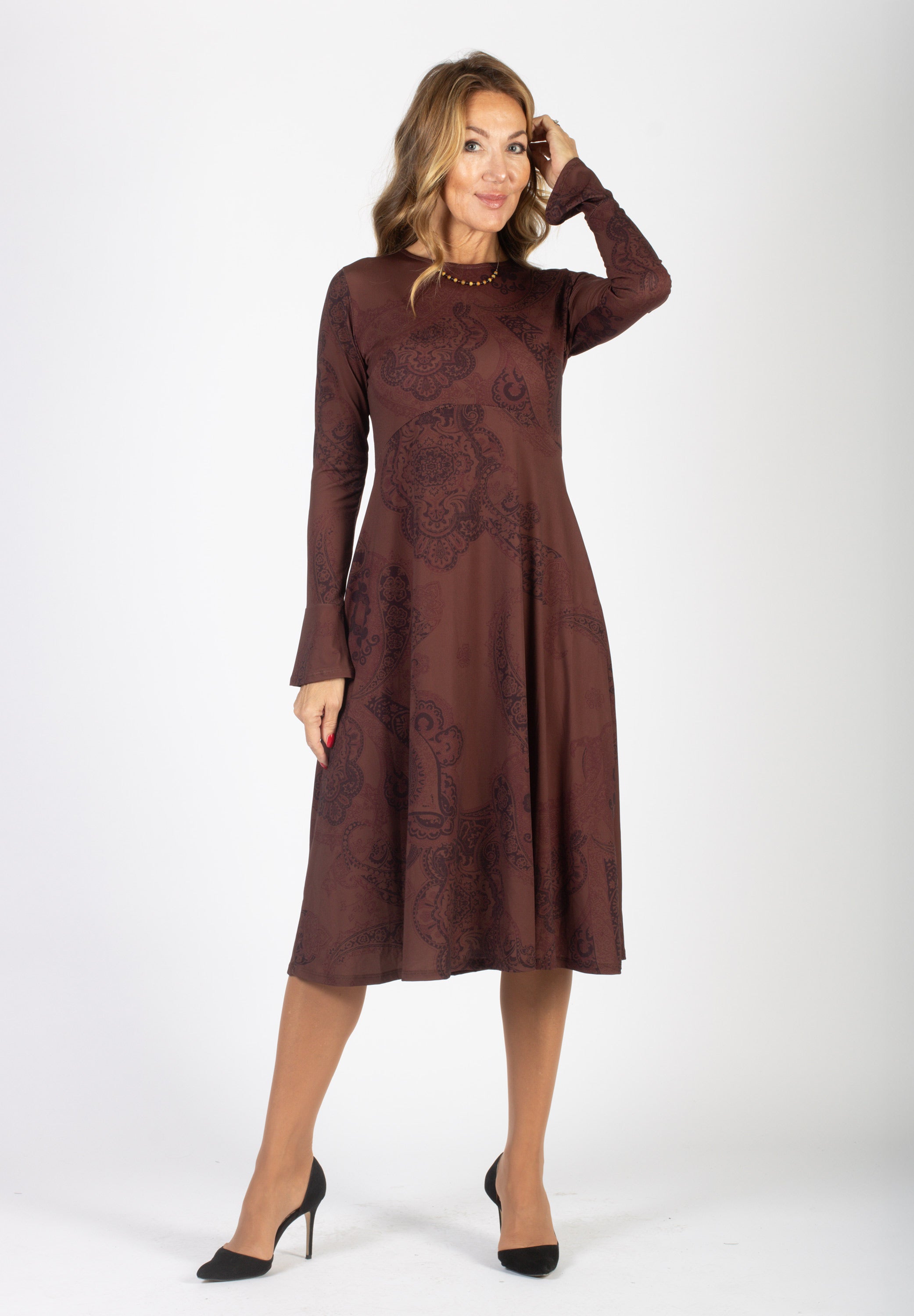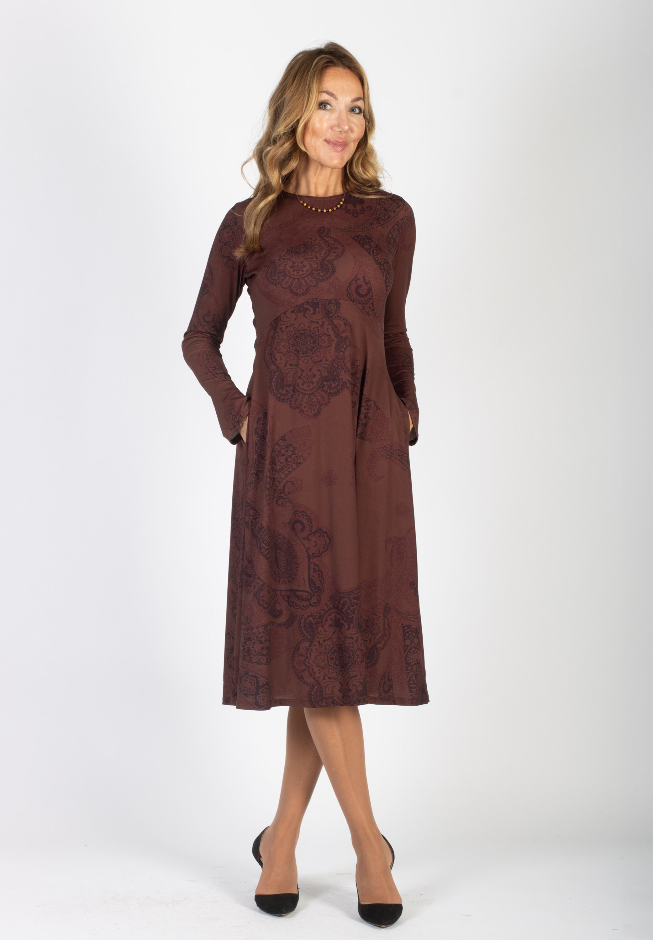 Klänningen har en figurnära överdel som sedan släpper i midjan som skapar ett fint fall. Vadlång a-linjeformad kjol med fickor i sidan. Lång ärm med trumpetavslut. Knapp i nacken.