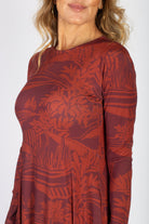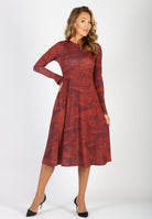 Klänningen har en figurnära överdel som sedan släpper i midjan som skapar ett fint fall. Vadlång a-linjeformad kjol med fickor i sidan. Lång ärm med trumpetavslut. Knapp i nacken.