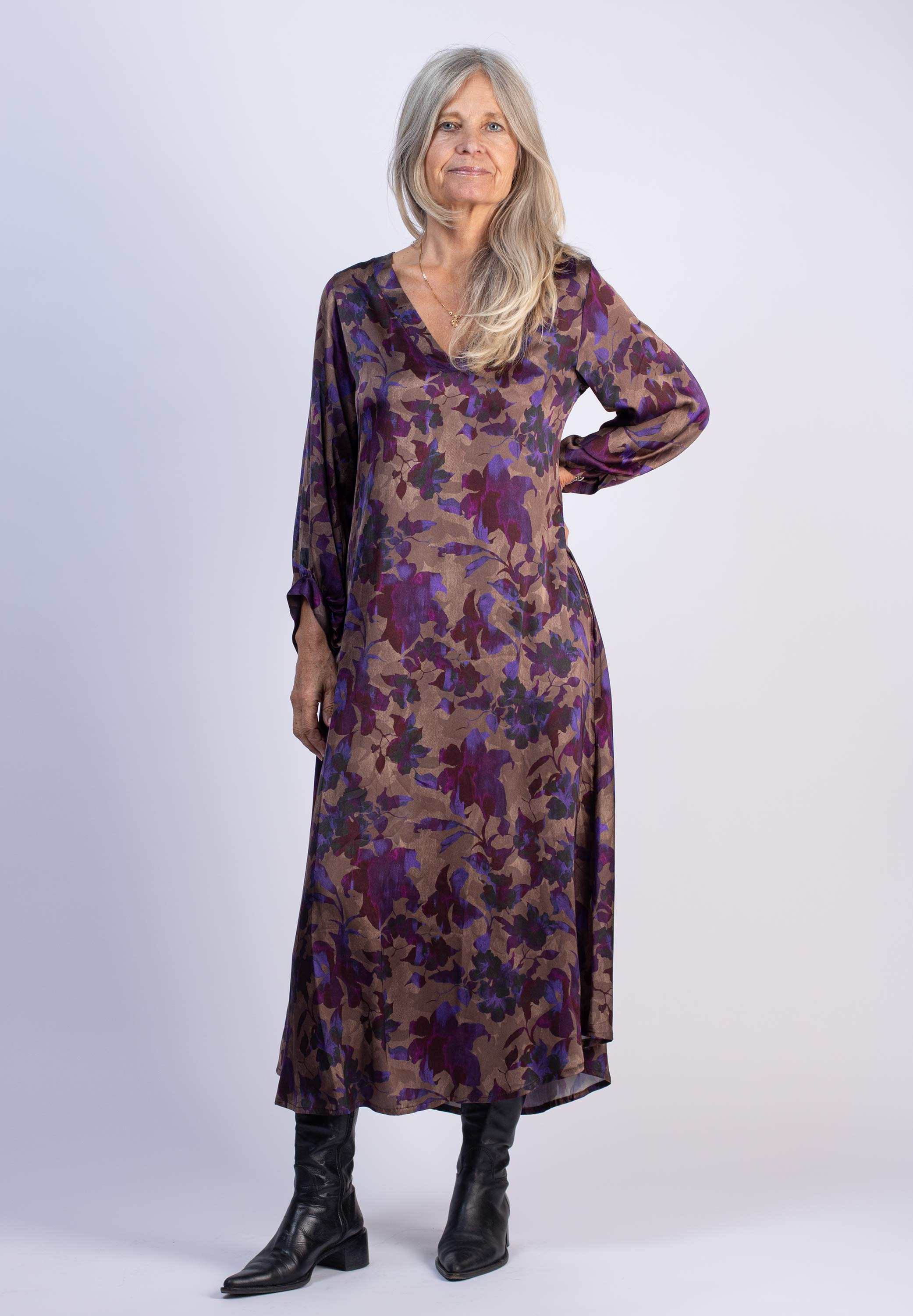 Klänningen är oversized och lätt a-linjeformad med v-ringning. Dolda fickor i bägge sidor. Ballongärm med manschett.