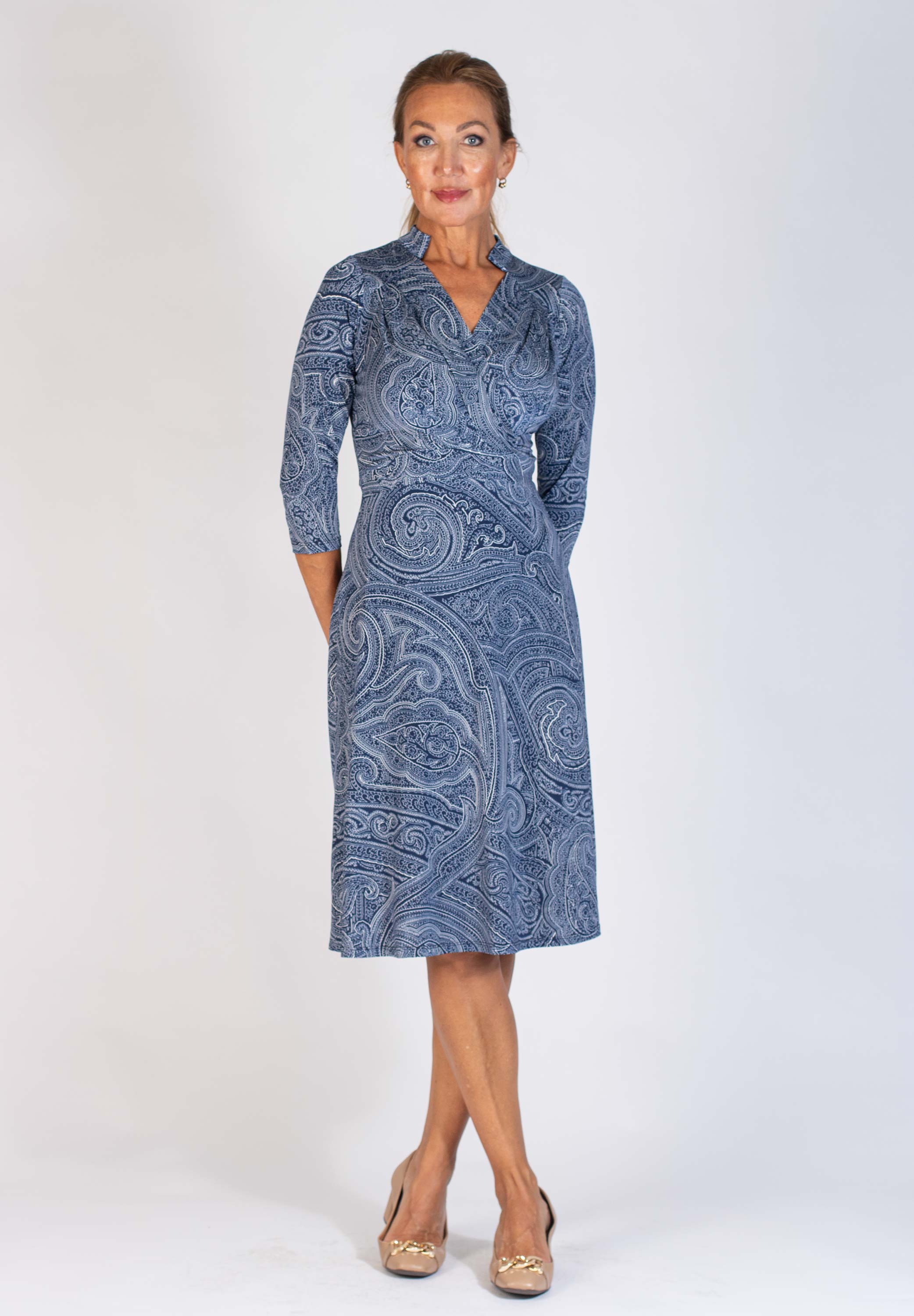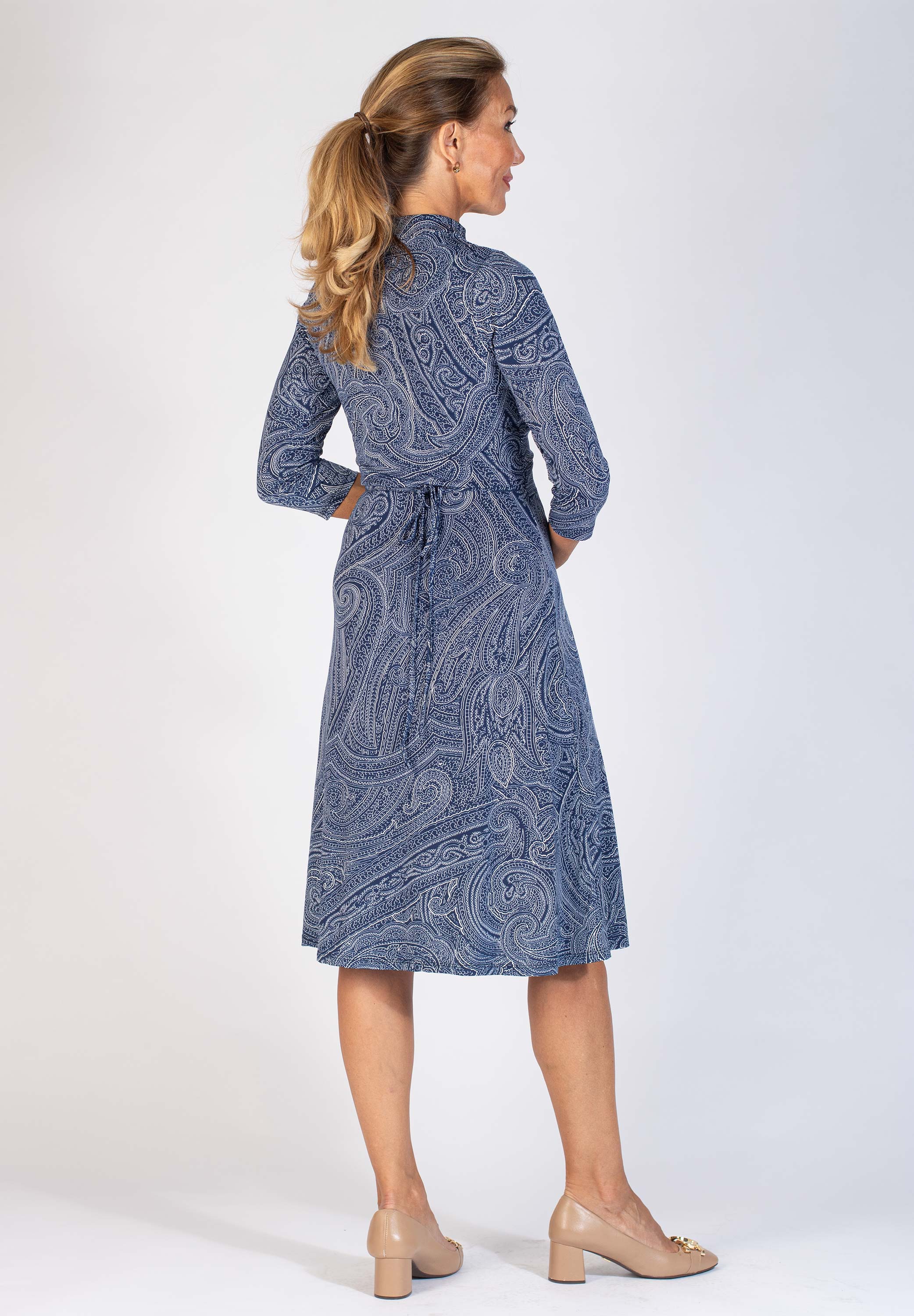 Klänningen har en figurnära överdel som ger en smickrande siluett och trekvarts-ärm. V-ringning med en stående krage. Avskuren i midjan med ett smalt band som knyts bak i ryggen.