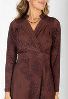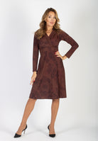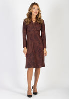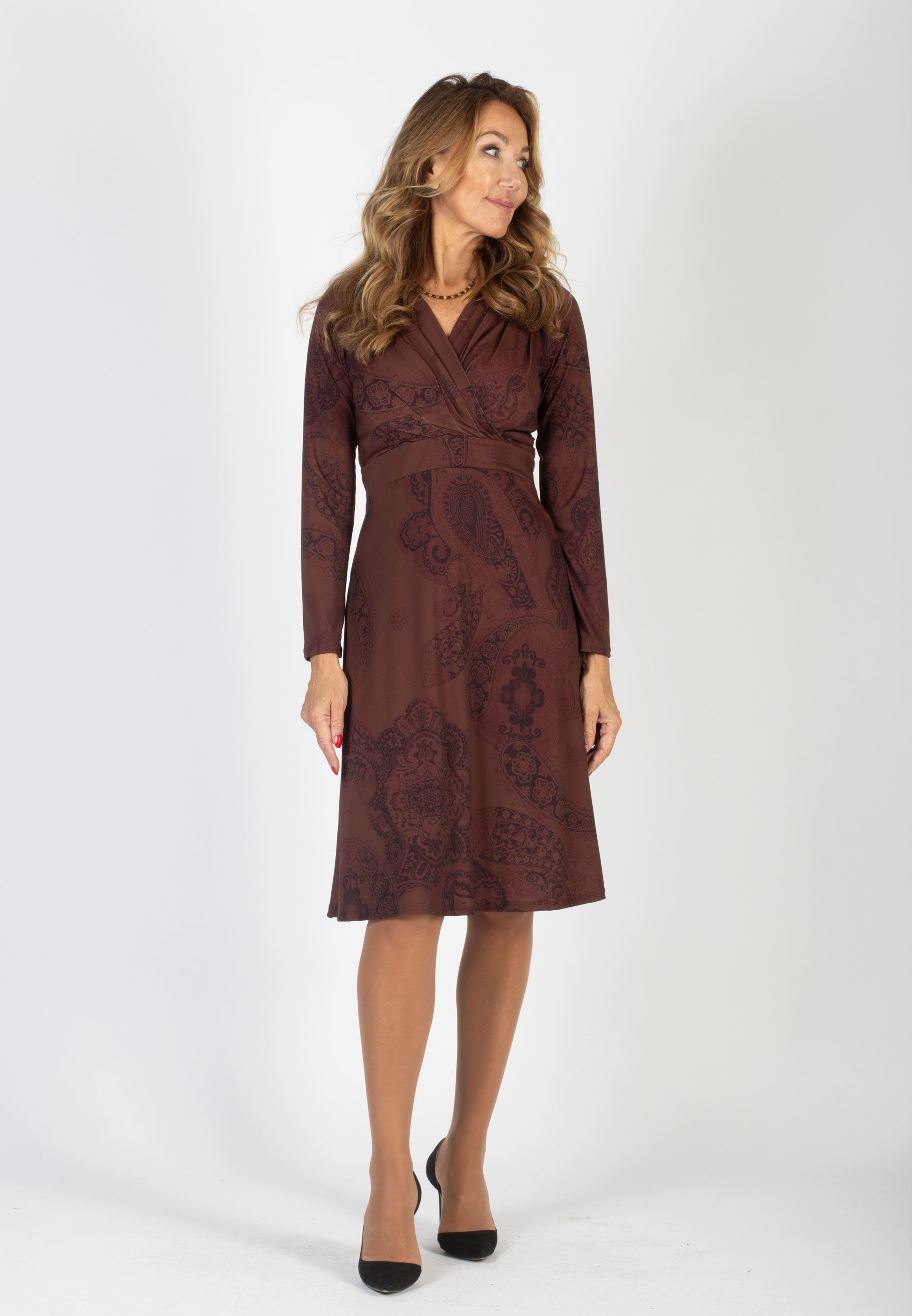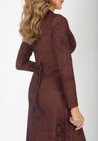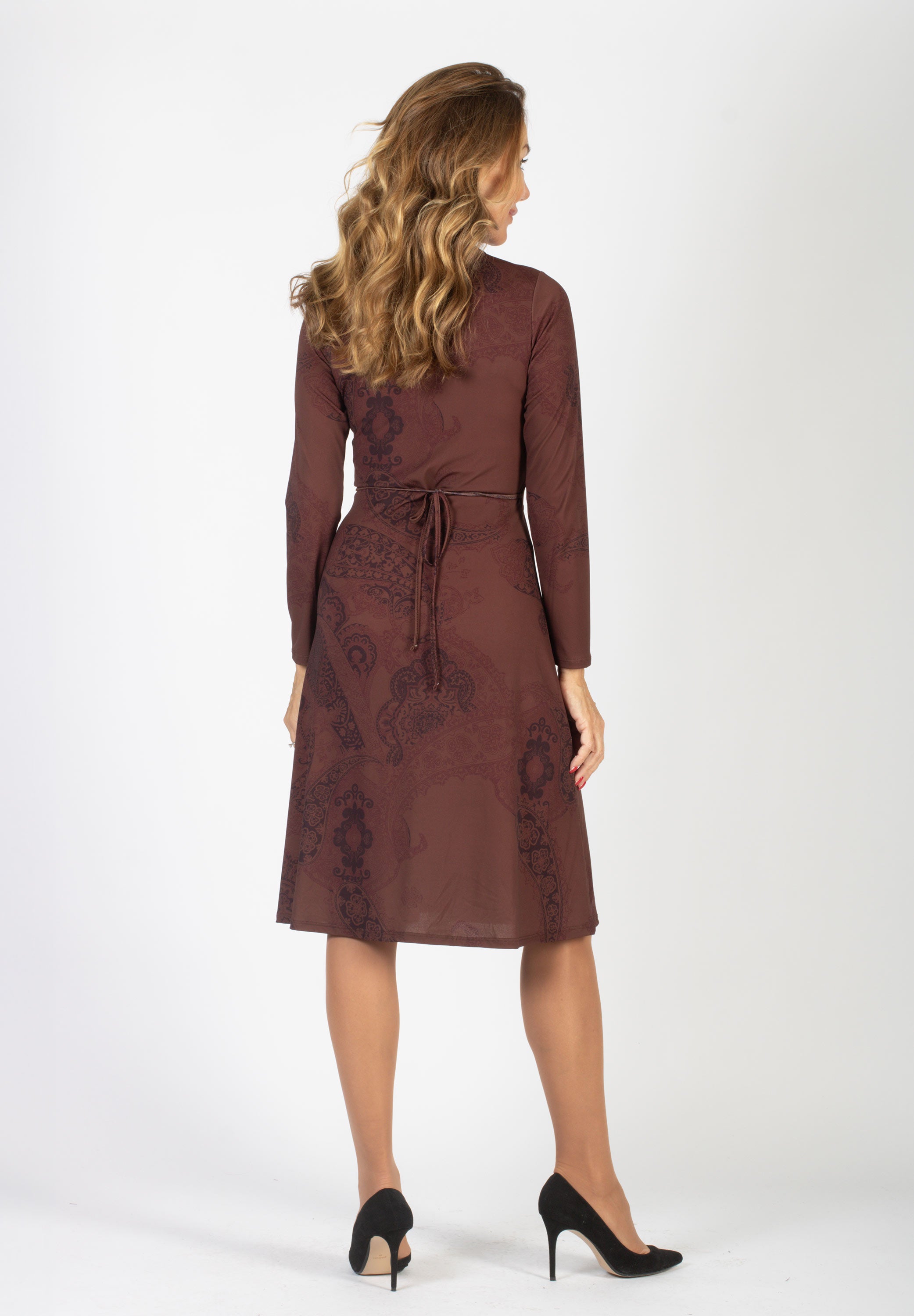 Klänningen har en figurnära överdel som ger en smickrande siluett och lång ärm. V-ringning med en stående krage. Avskuren i midjan med ett smalt band som knyts bak i ryggen.