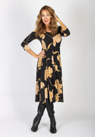 Klänningen har en figurnära överdel som sedan släpper i midjan som skapar ett fint fall. Vadlång a-linjeformad kjol med fickor i sidan. V-ringning samt trekvarts-ärm-