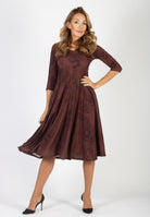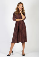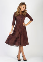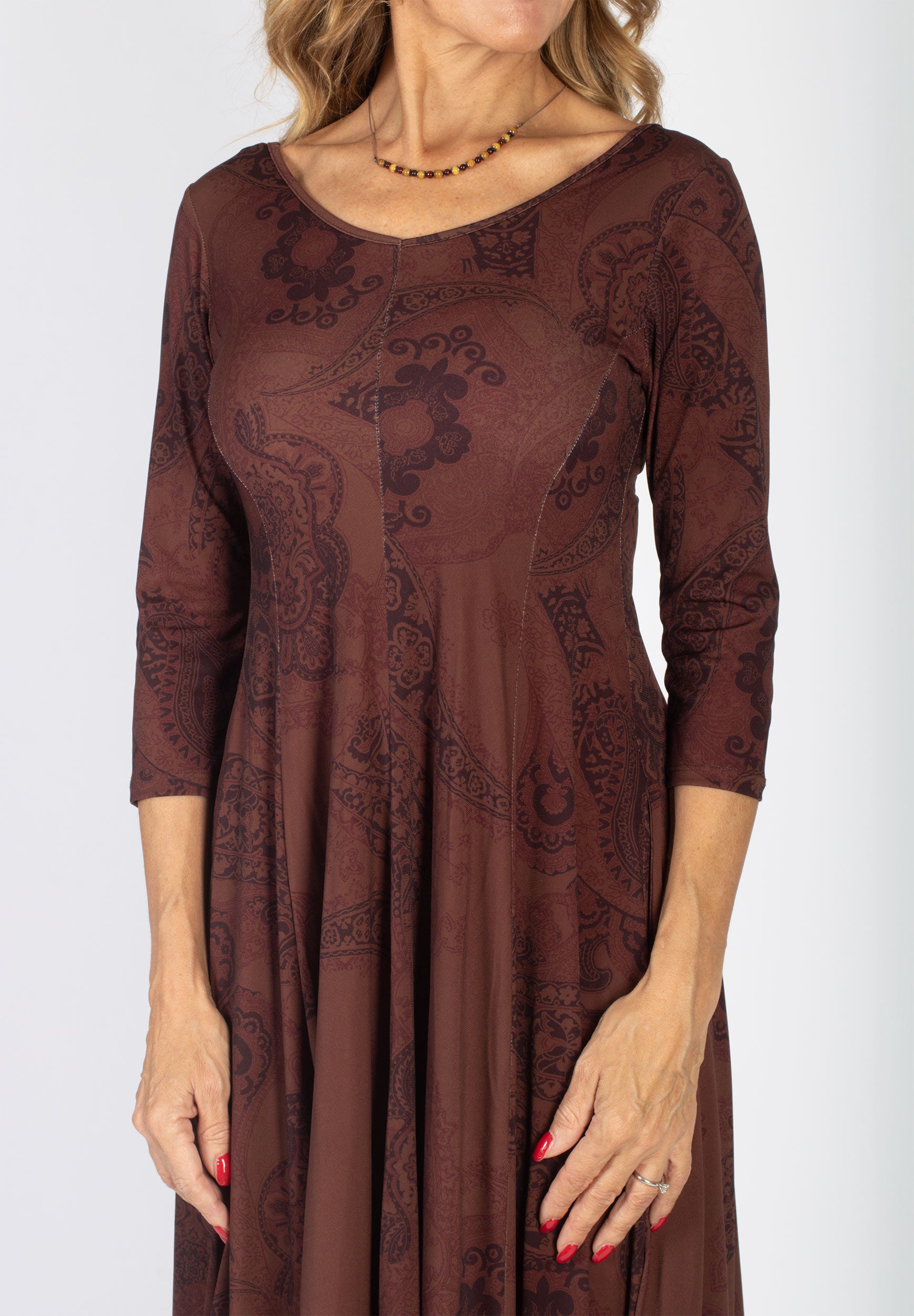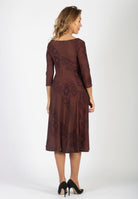 Klänningen har en figurnära överdel som sedan släpper i midjan som skapar ett fint fall. Vadlång a-linjeformad kjol med fickor i sidan. V-ringning samt trekvarts-ärm-