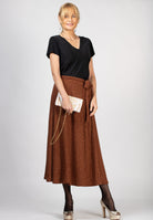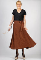 Kjolen är vad-lång med resår i midjan. Hällor i sidan med avtagbart knytband.