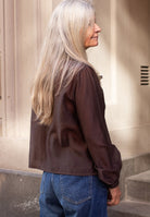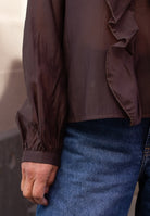 Brun blus kråsdetaljer och v-ringning. Lång ärm med manschett. Kort passform - passar bra till både kjol och byxa.