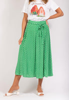 Grön midikjol med vita prickar med resår och skärp i midjan