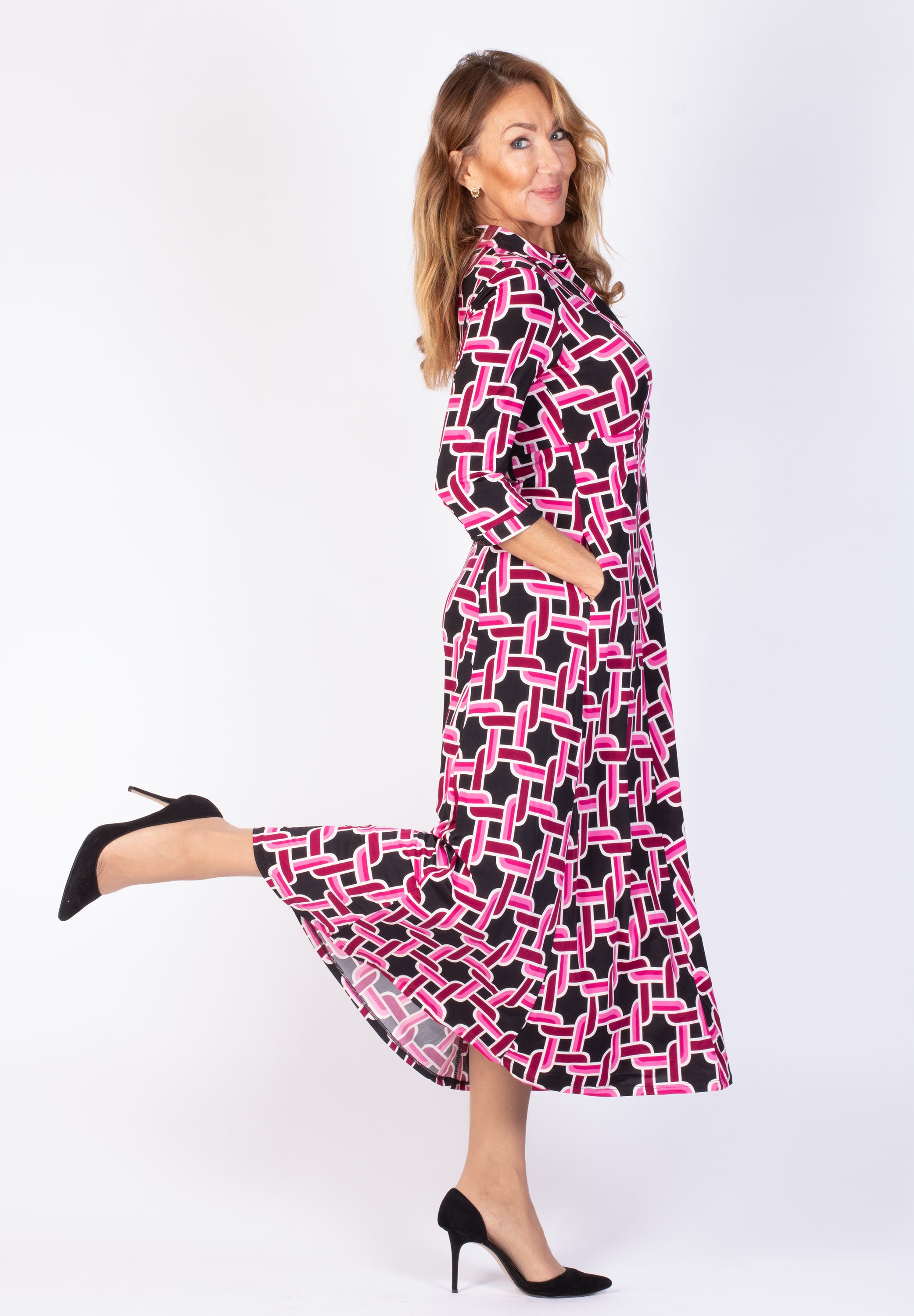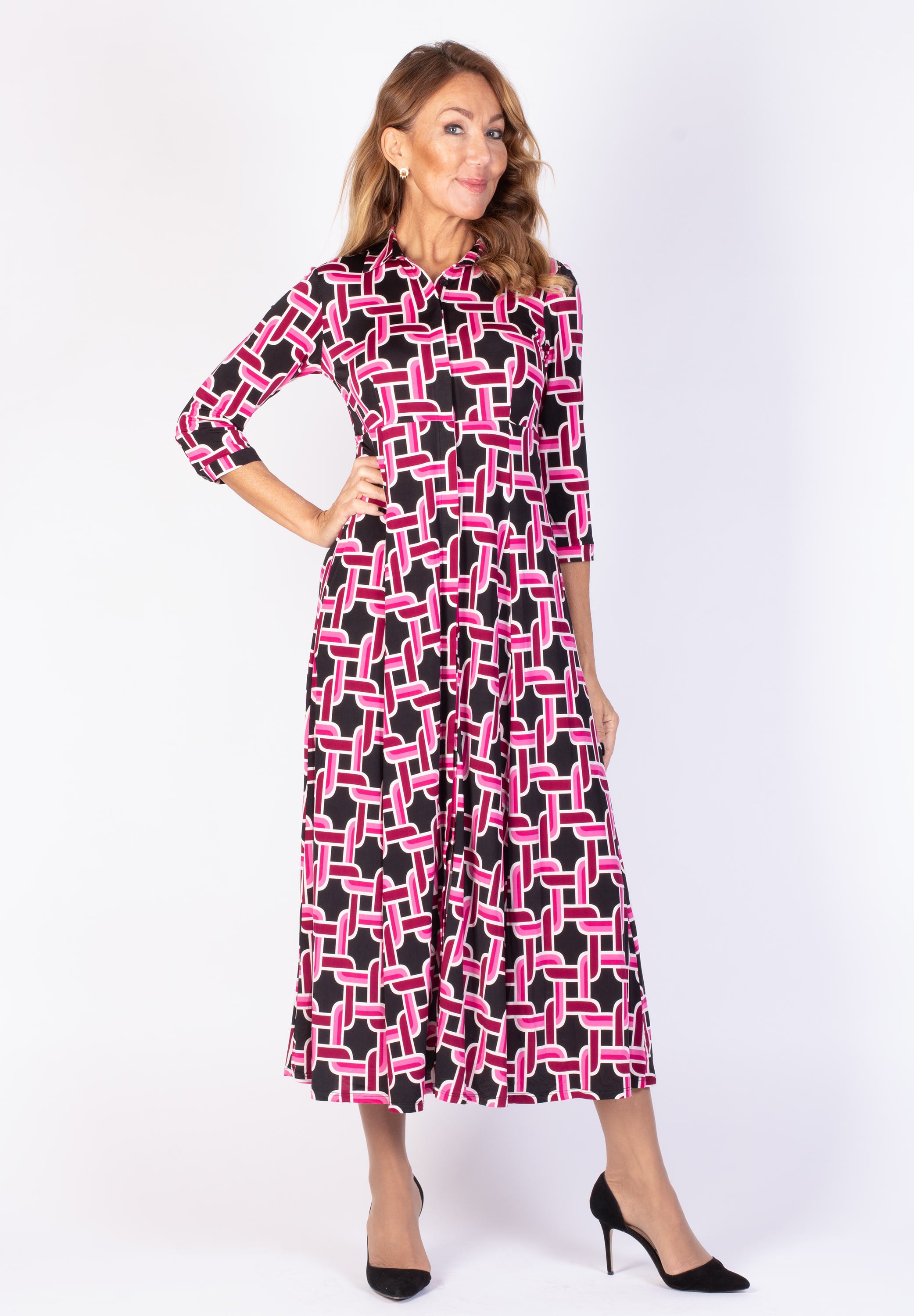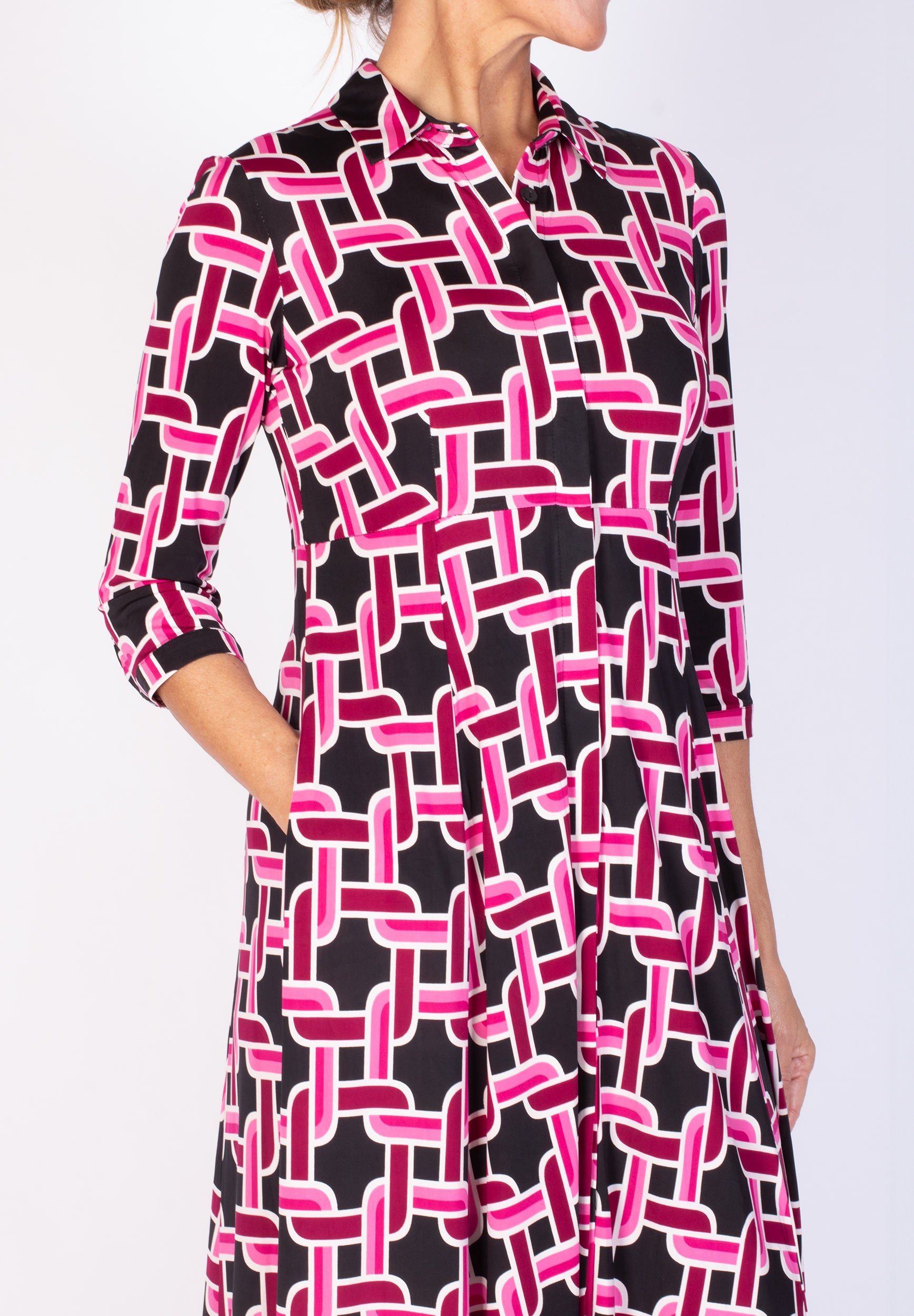Lång skjortklänning med dold knäppning. Avskuren vid midja med utställd kjol med fickor. Snygg att bära både stängd och öppen.