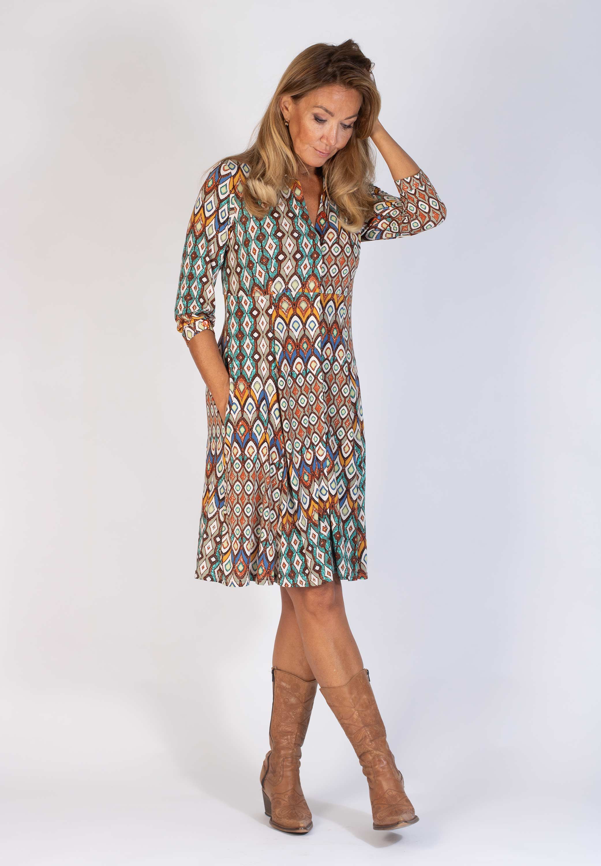 Kort skjortklänning med dold knäppning. Avskuren vid midja med utställd kjol med fickor. Snygg att bära både stängd och öppen.