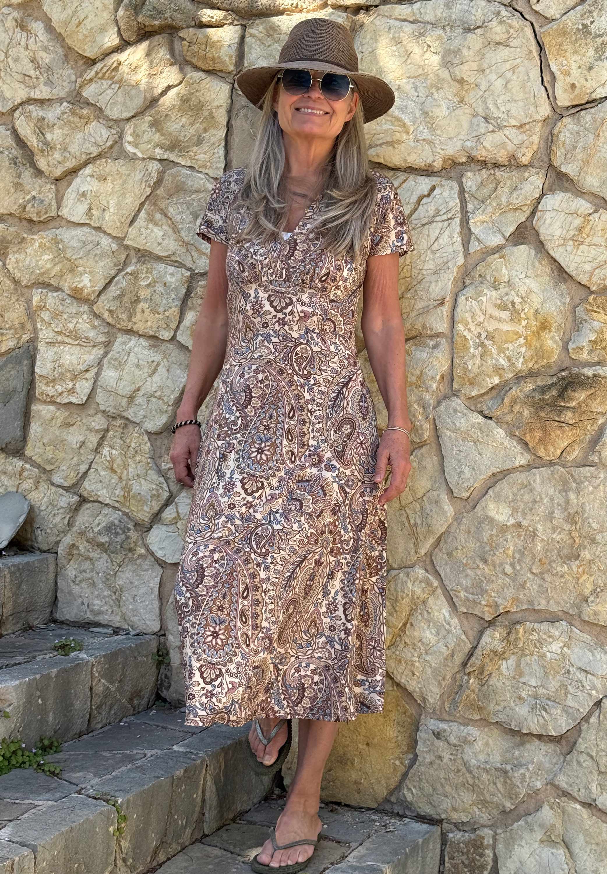 Freja är en midiklänning med V-ringning och formsydda kupor. Den är avskuren under bysten och har en kort holkärm.