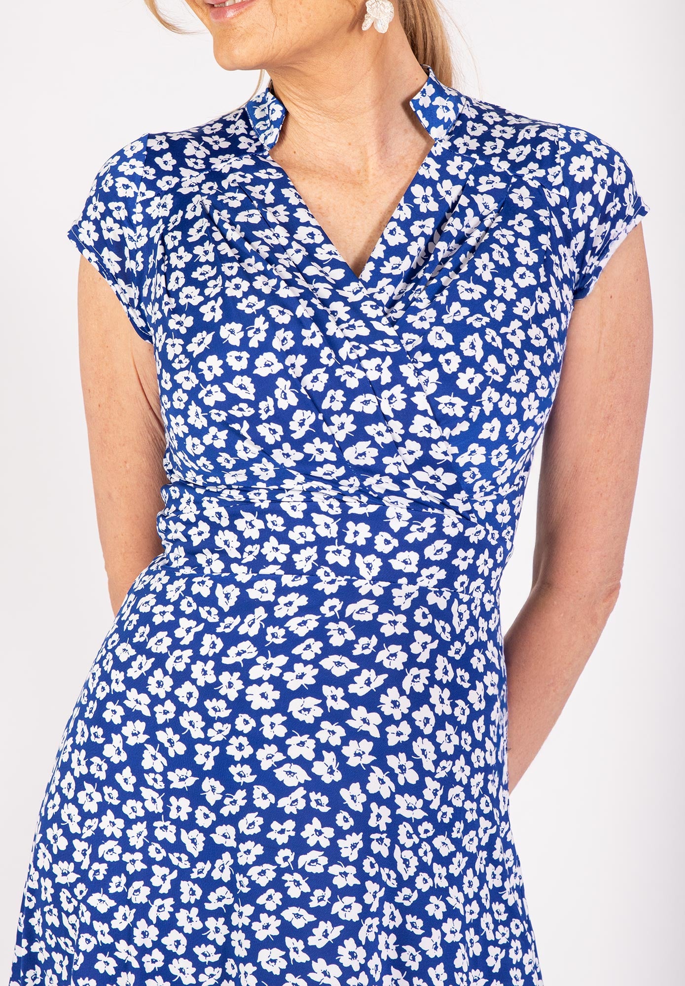 Klänningen har en figurnära överdel som ger en smickrande siluett och kort ärm. V-ringning med en stående krage. Avskuren i midjan med ett smalt band som knyts bak i ryggen.