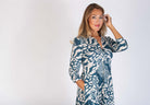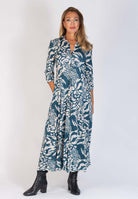 Lång skjortklänning med dold knäppning. Avskuren vid midja med utställd kjol med fickor. Snygg att bära både stängd och öppen.