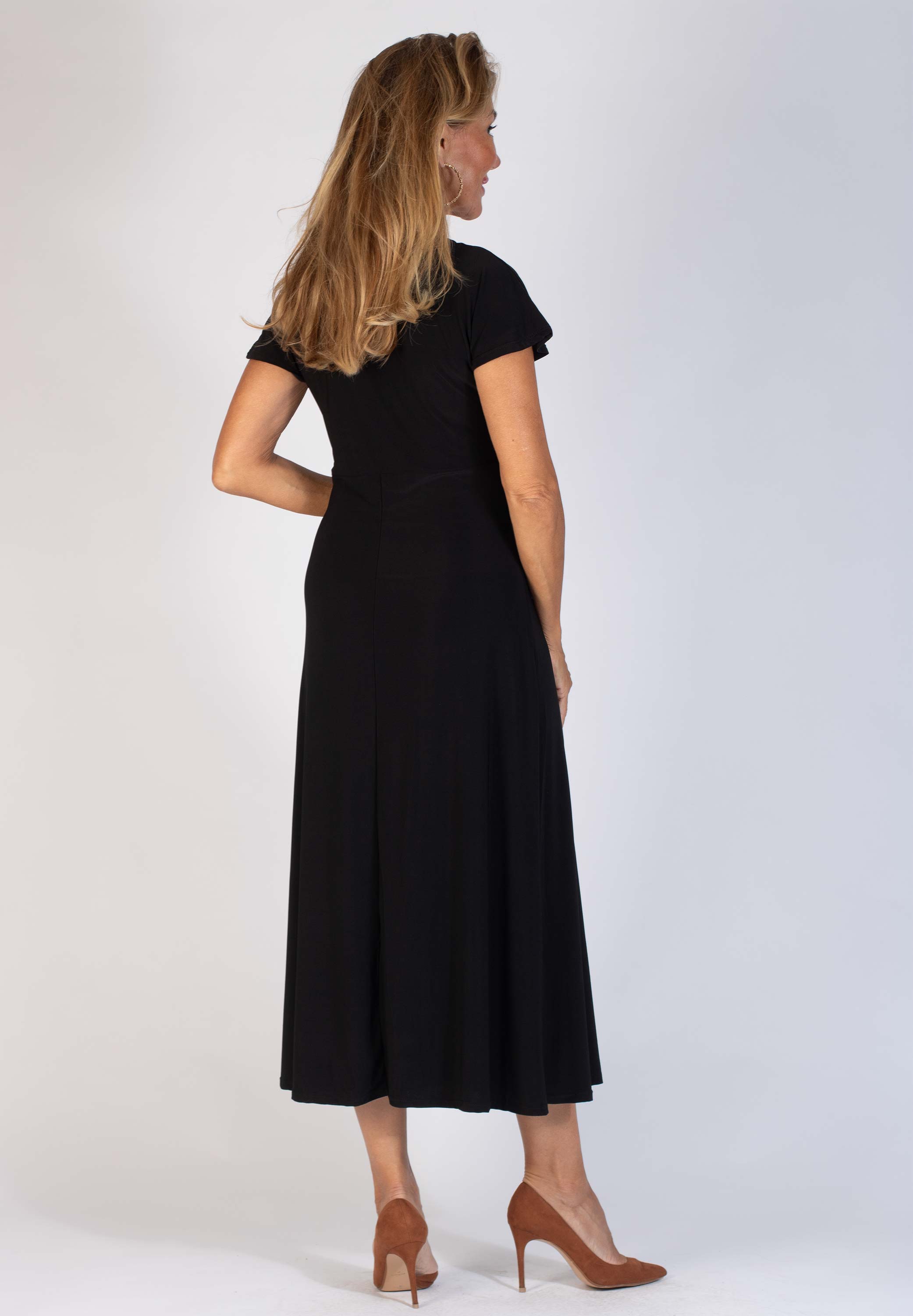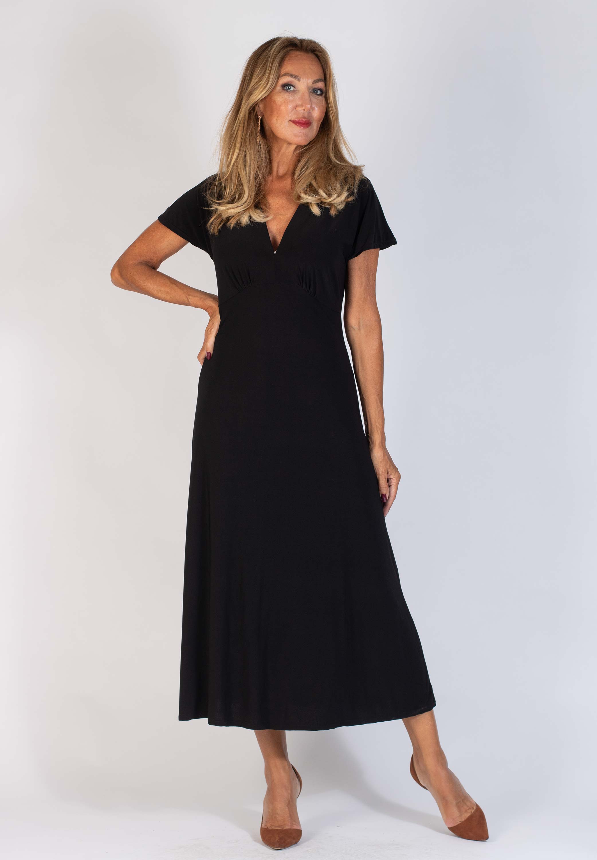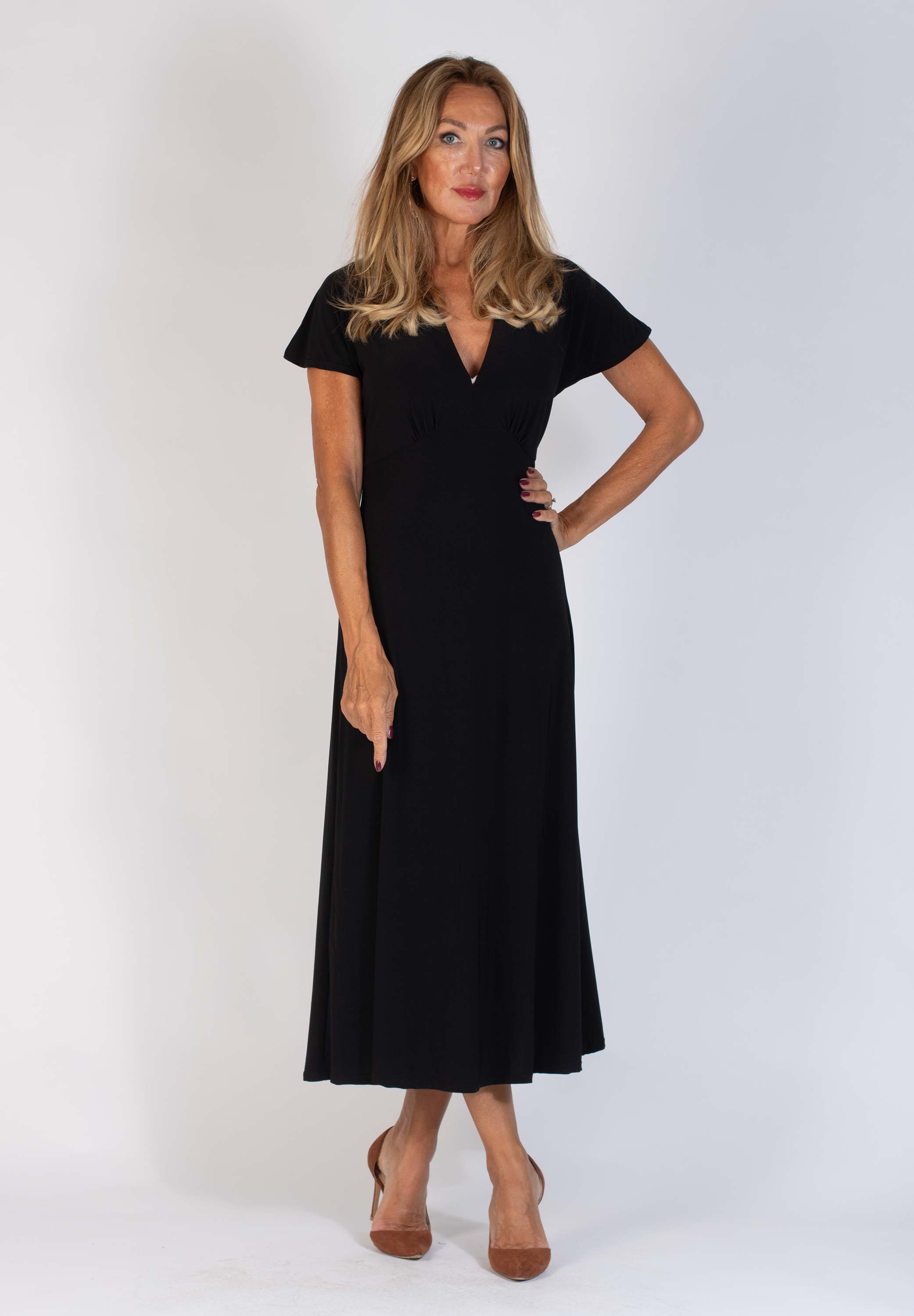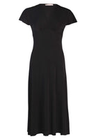 Freja är en midiklänning med V-ringning och formsydda kupor. Den är avskuren under bysten och har en kort holkärm.
