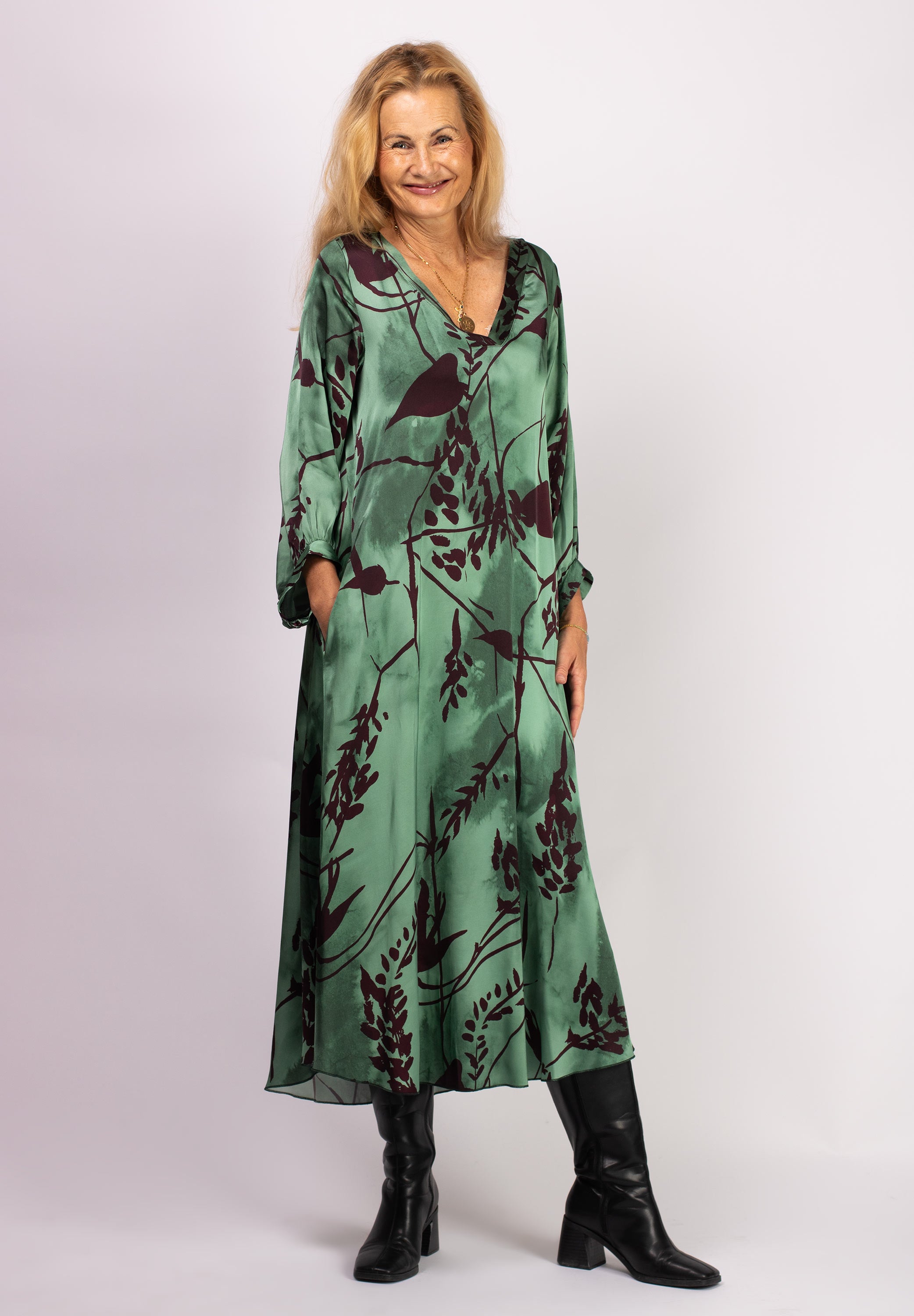 Klänningen är oversized och lätt a-linjeformad med v-ringning. Dolda fickor i bägge sidor. Ballongärm med manschett.