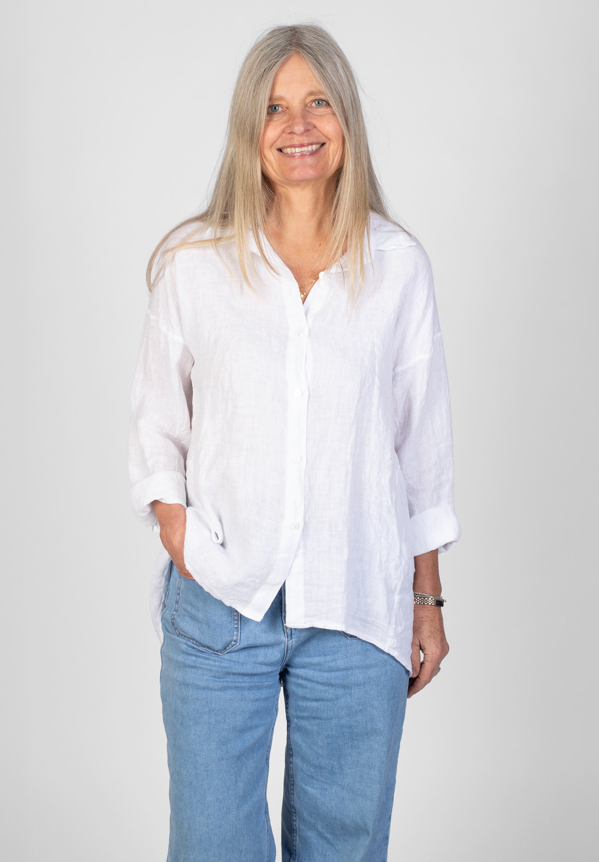 En klassisk skjorta i 100% linne – sval och enkel att styla. Den har en rak passform med krage, knappar framtill och långa ärmar som enkelt kan rullas upp för en mer avslappnad look.