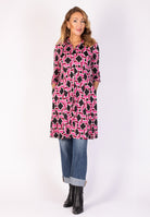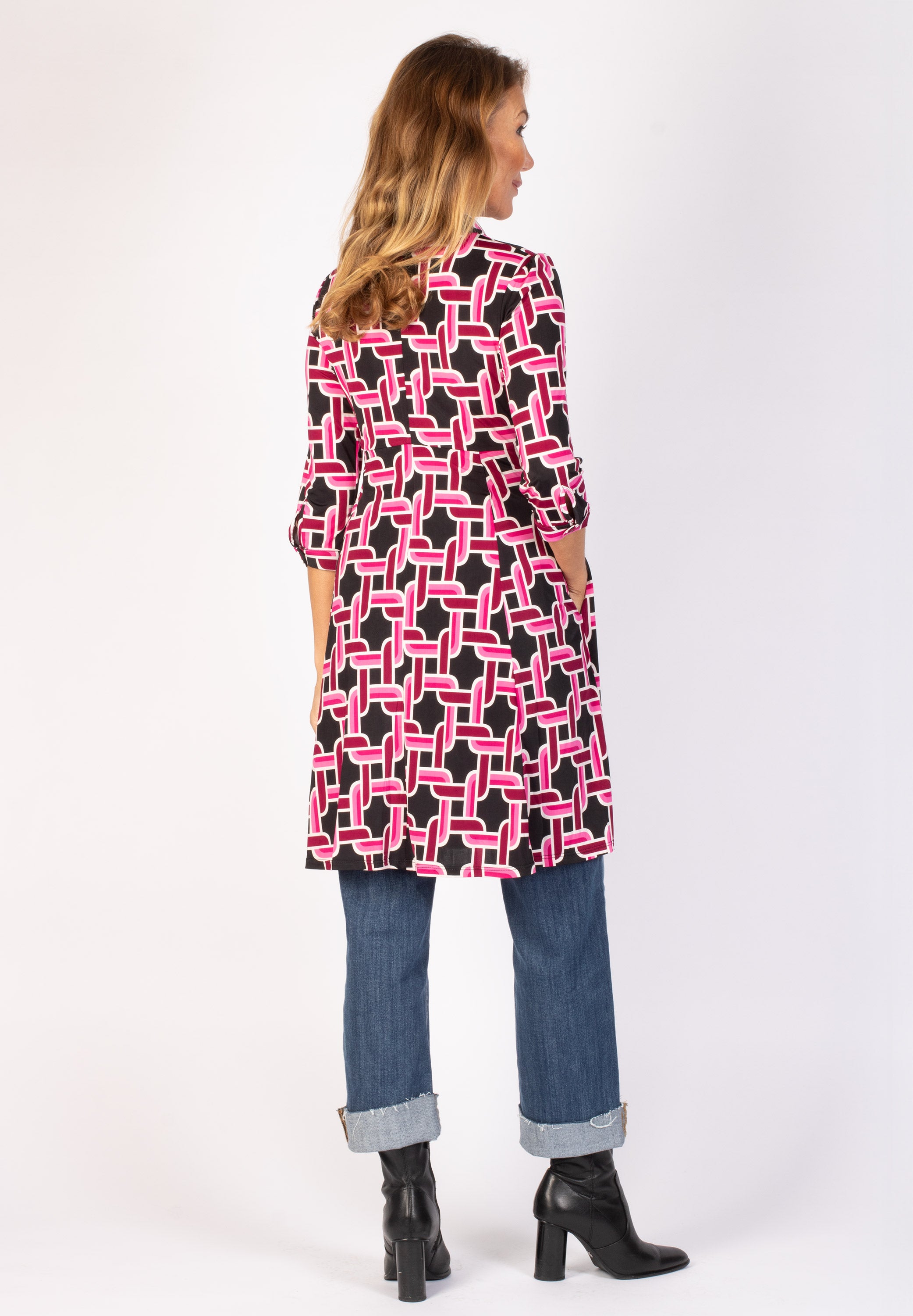 Kort skjortklänning med dold knäppning. Avskuren vid midja med utställd kjol med fickor. Snygg att bära både stängd och öppen.