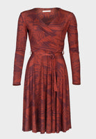 Klänningen har en figurnära draperad överdel som går i omlott. V-ringning och lång ärm. Klänningen är avskuren i midjan med en vid kjol. Avtagbart matchande skärp i midjan.