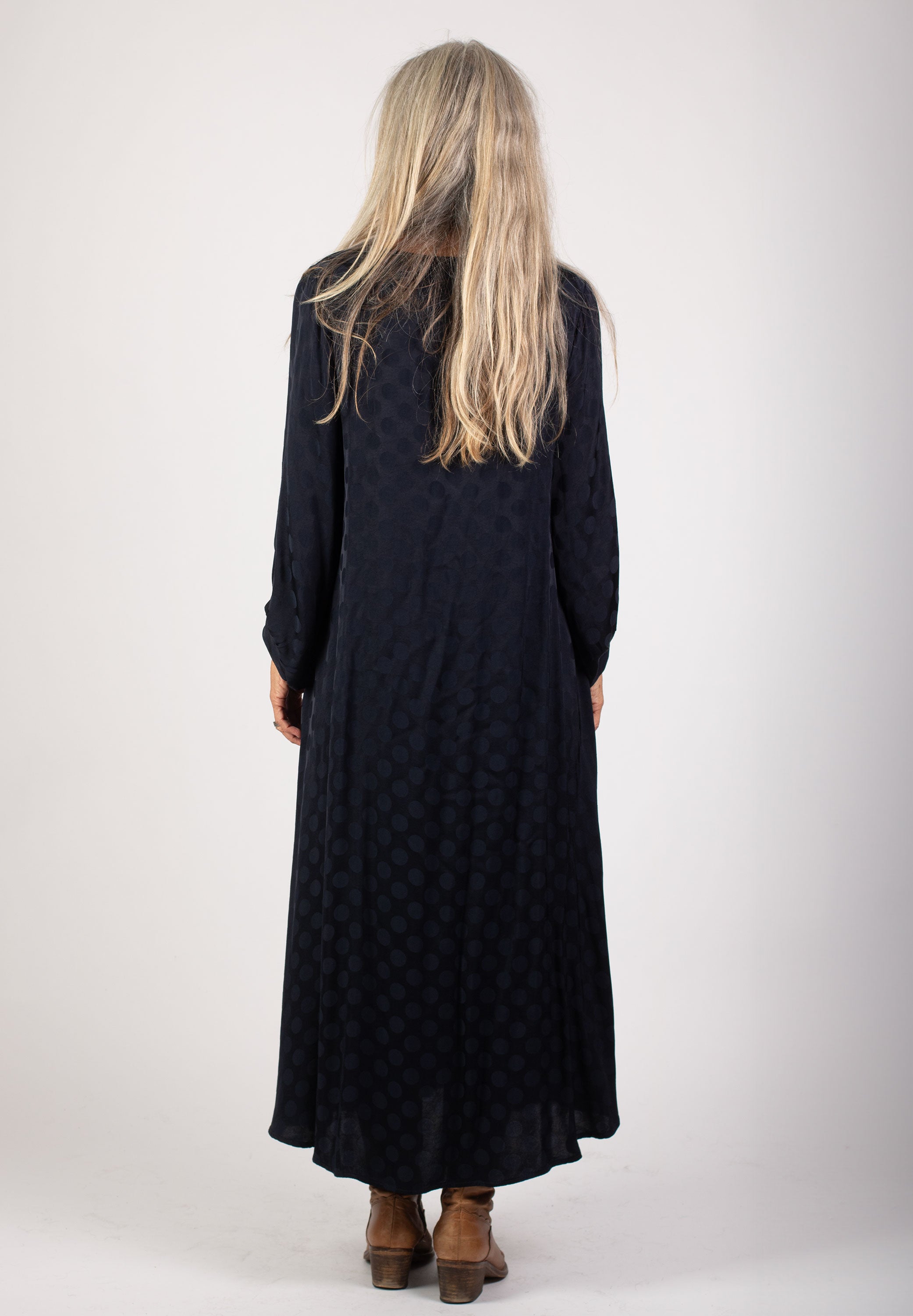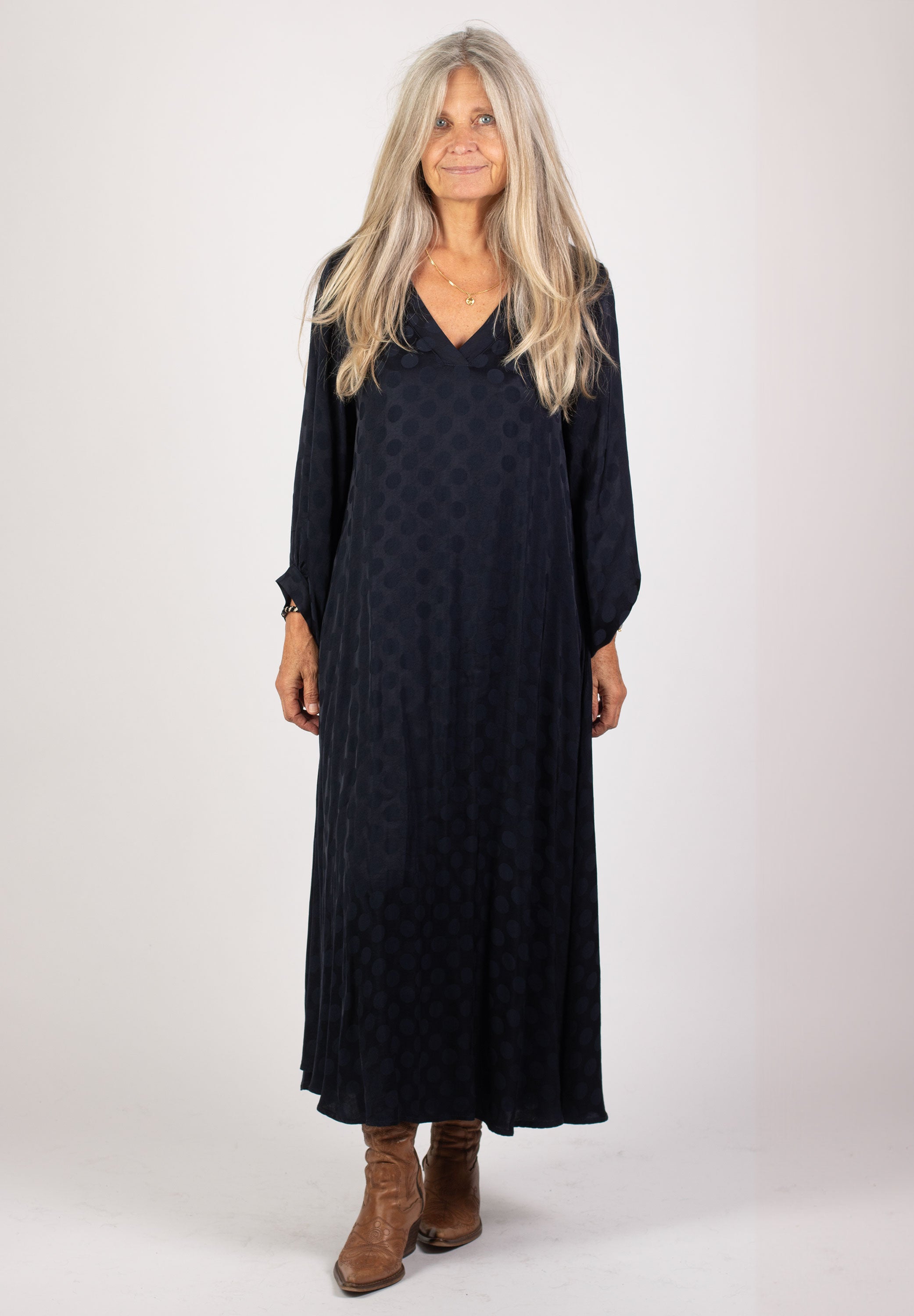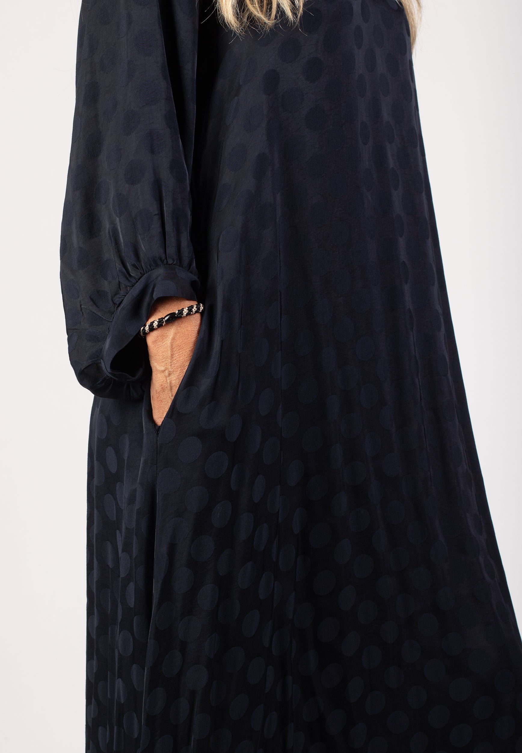 Klänningen är oversized och lätt a-linjeformad med v-ringning. Dolda fickor i bägge sidor. Ballongärm med manschett.