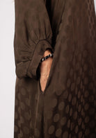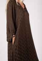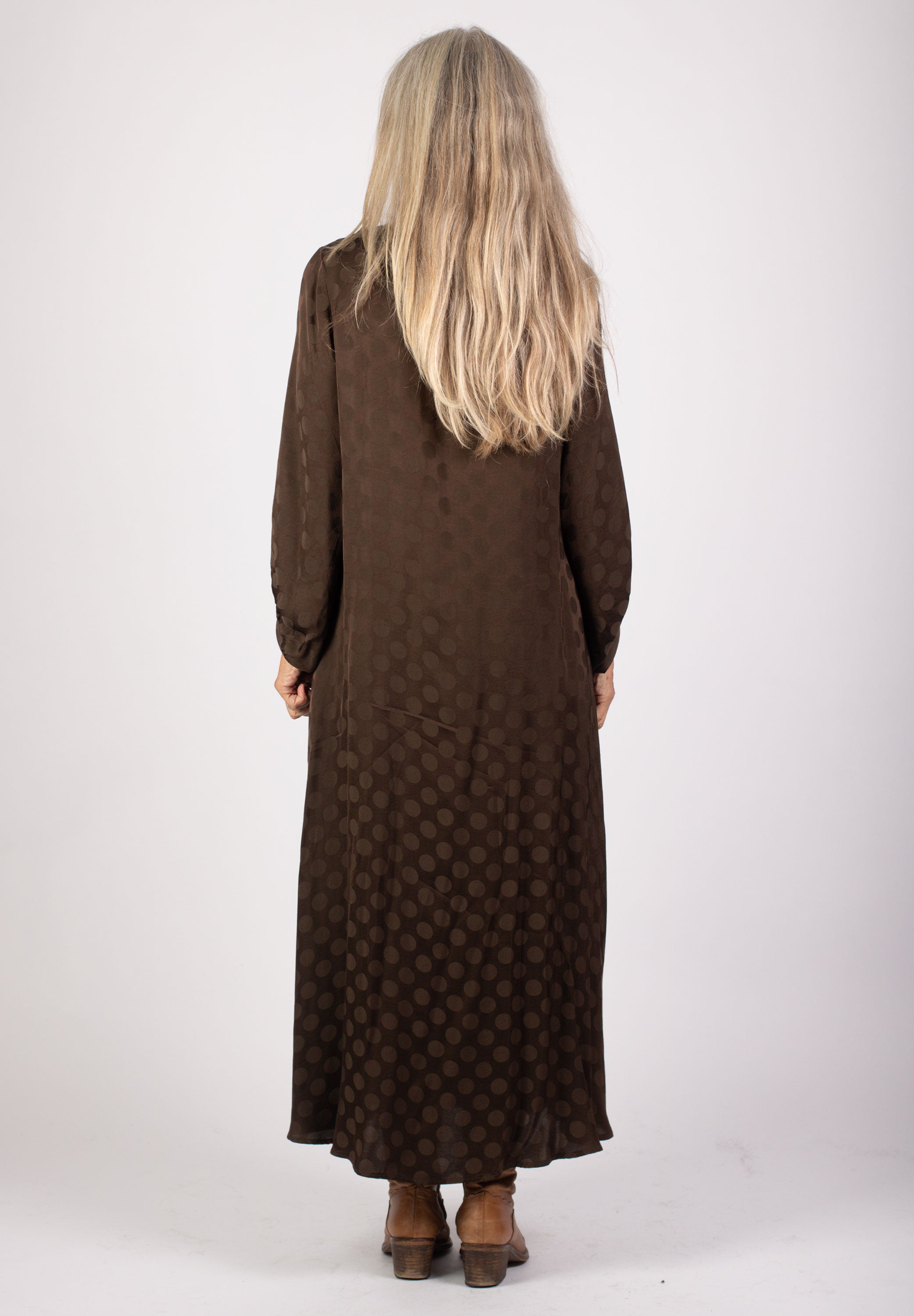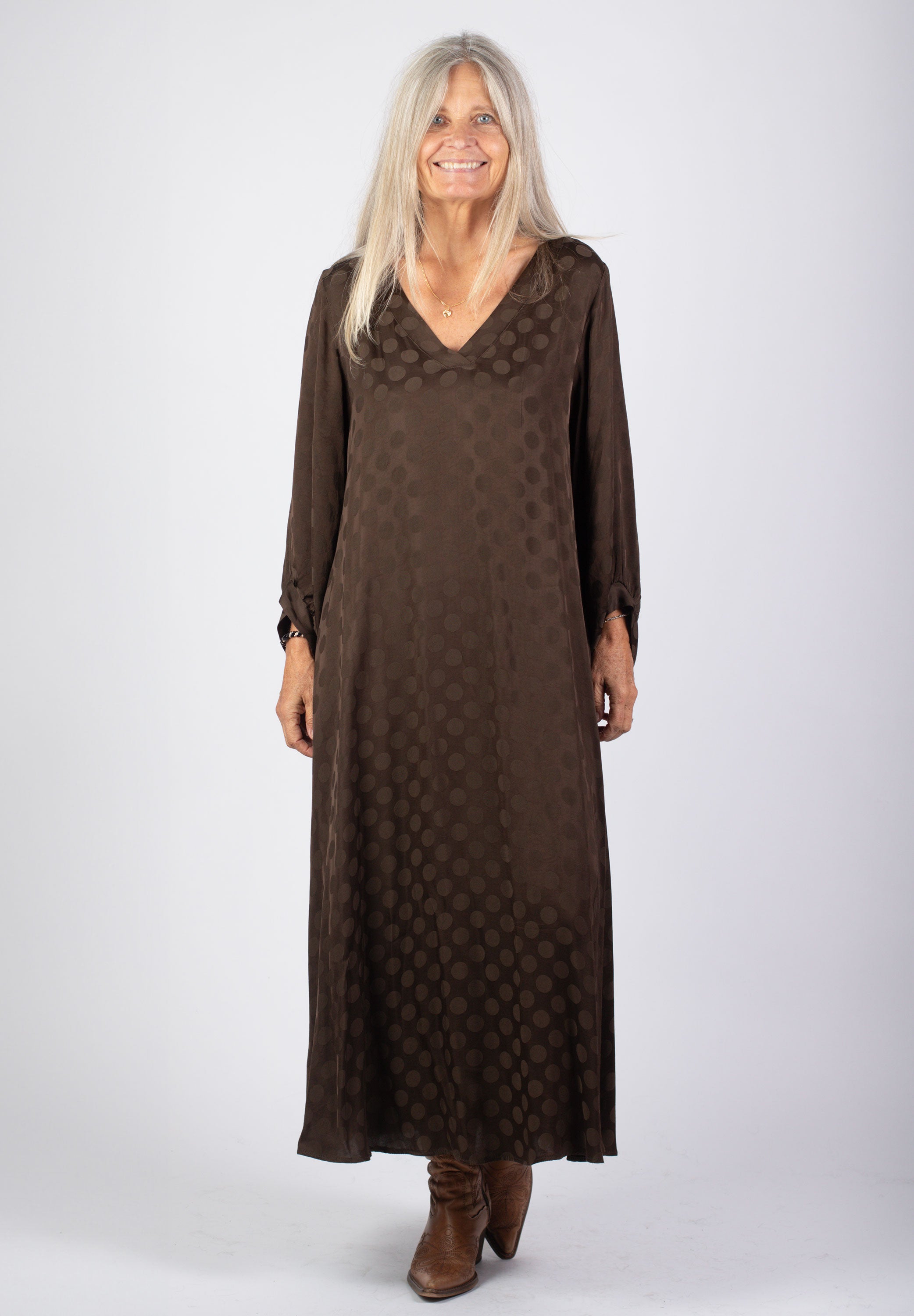 Klänningen är oversized och lätt a-linjeformad med v-ringning. Dolda fickor i bägge sidor. Ballongärm med manschett.