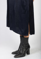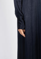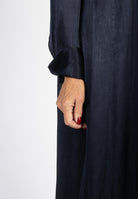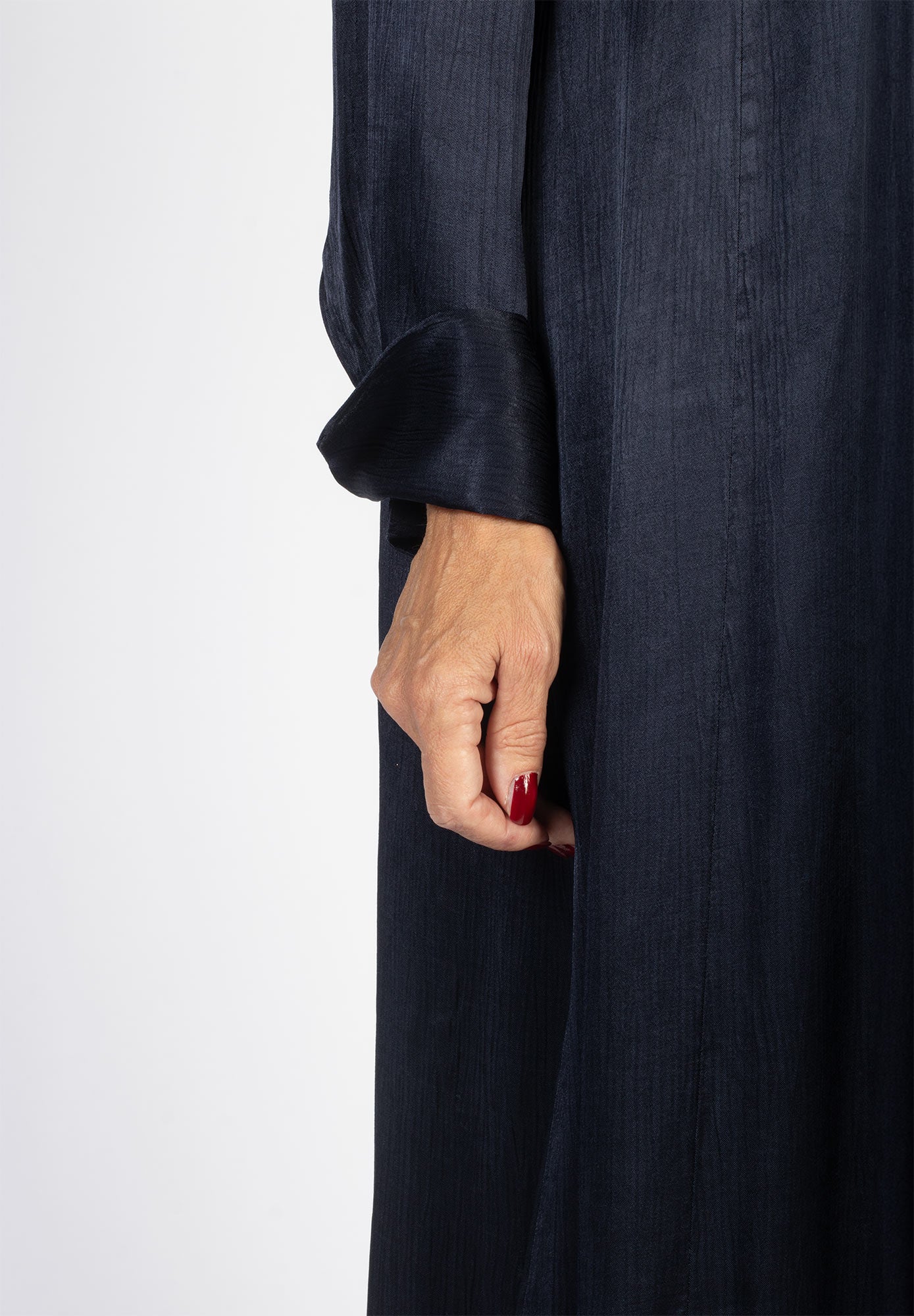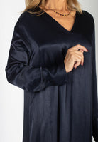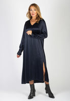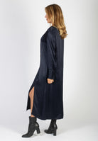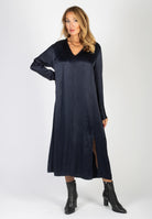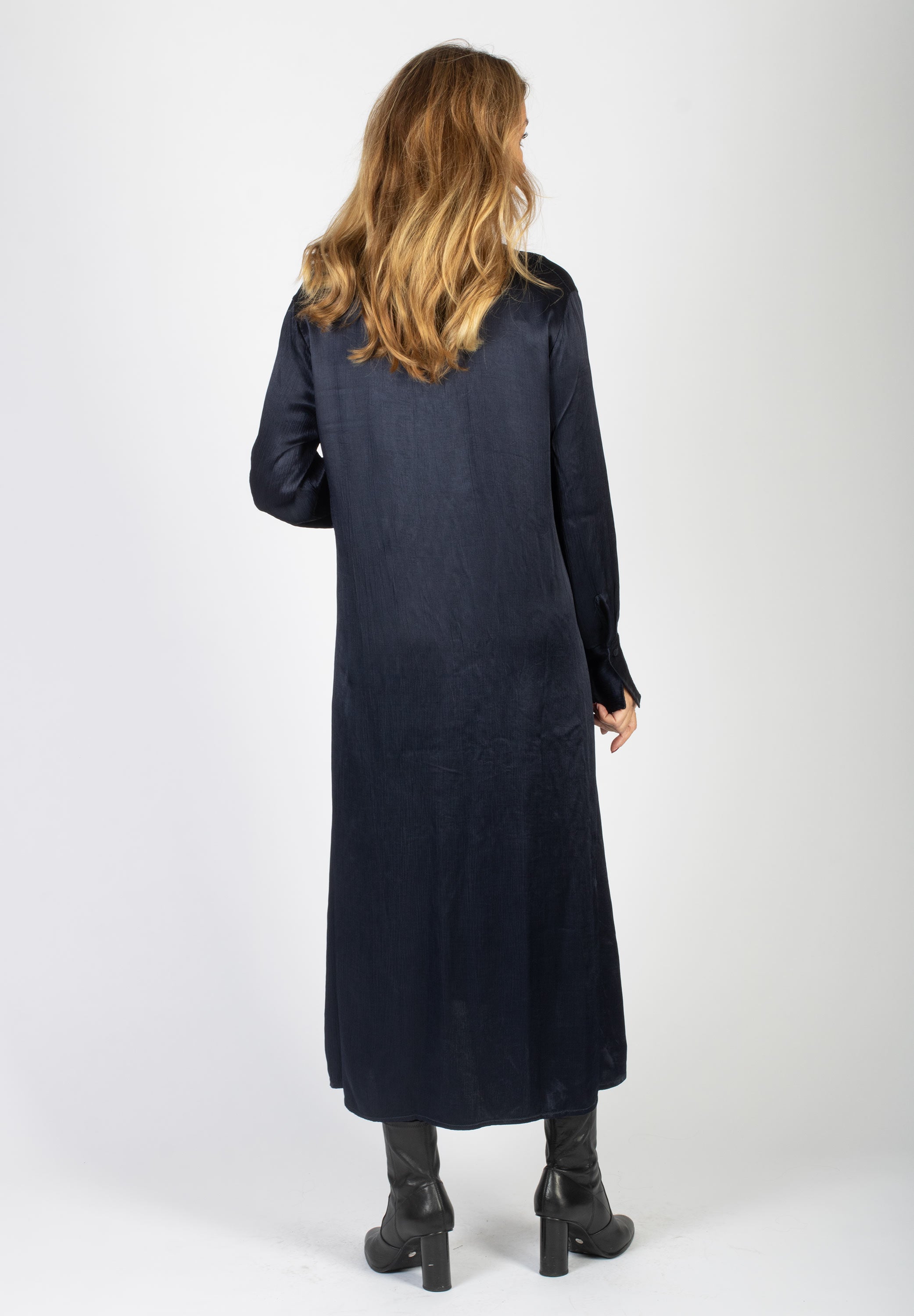 V-ringad midiklänning med långa ärmar med manschetter. Klänningen har en slits i vänster sidsöm. Skuren i en avslappnad, bekväm silhuett.