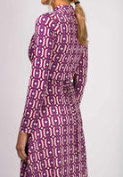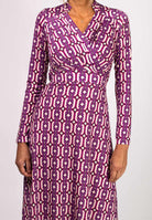 Midi-klänning med kedjemönster i rosa och lila nyanser.