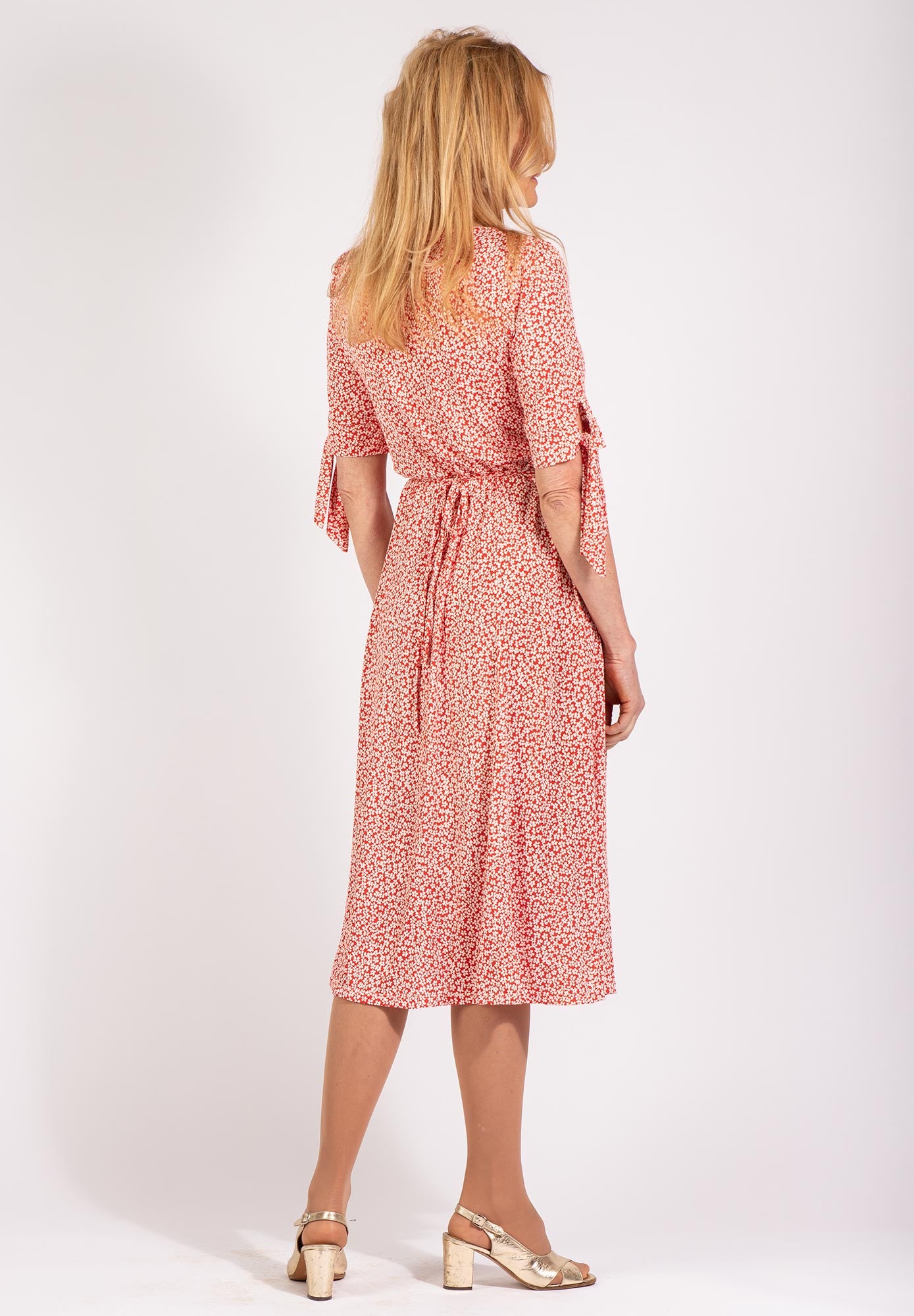 Vad-lång klänning med djup v-ringning, formsydda kupor och markerad midja. Dekorativa knappar framtill. Kort ärm med knytdetalj. Smalt band som knyts bak i ryggen. Går ej att öppna.