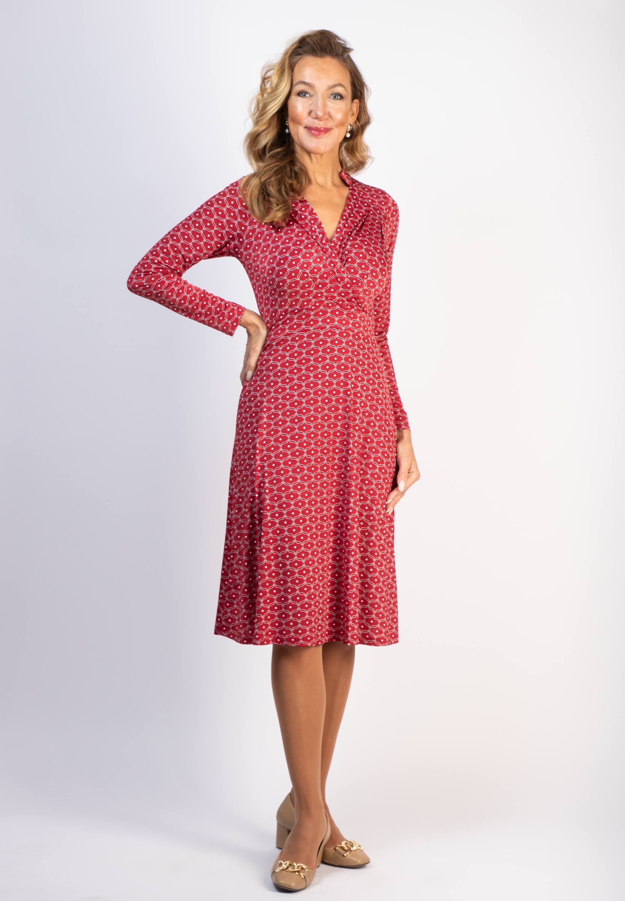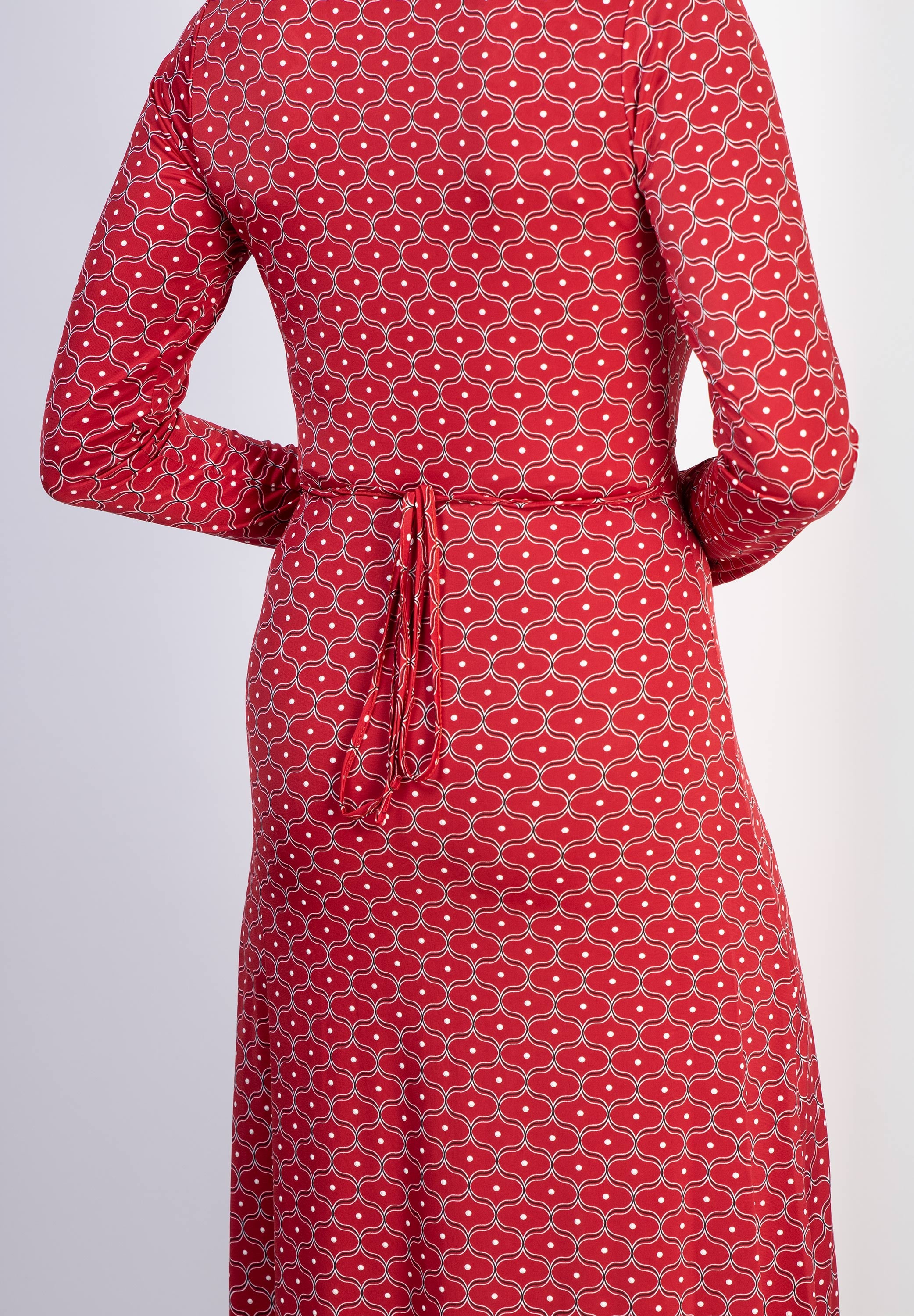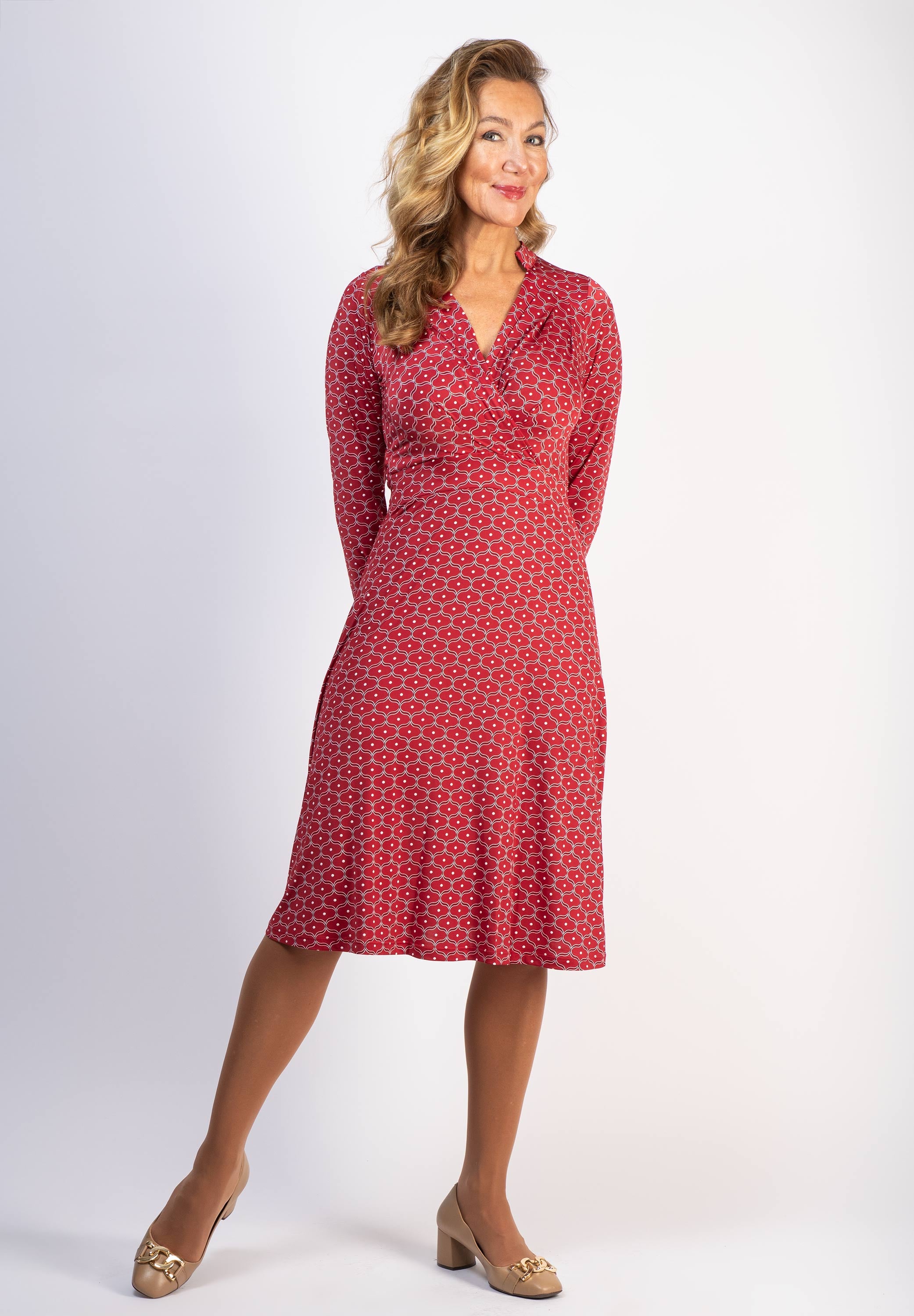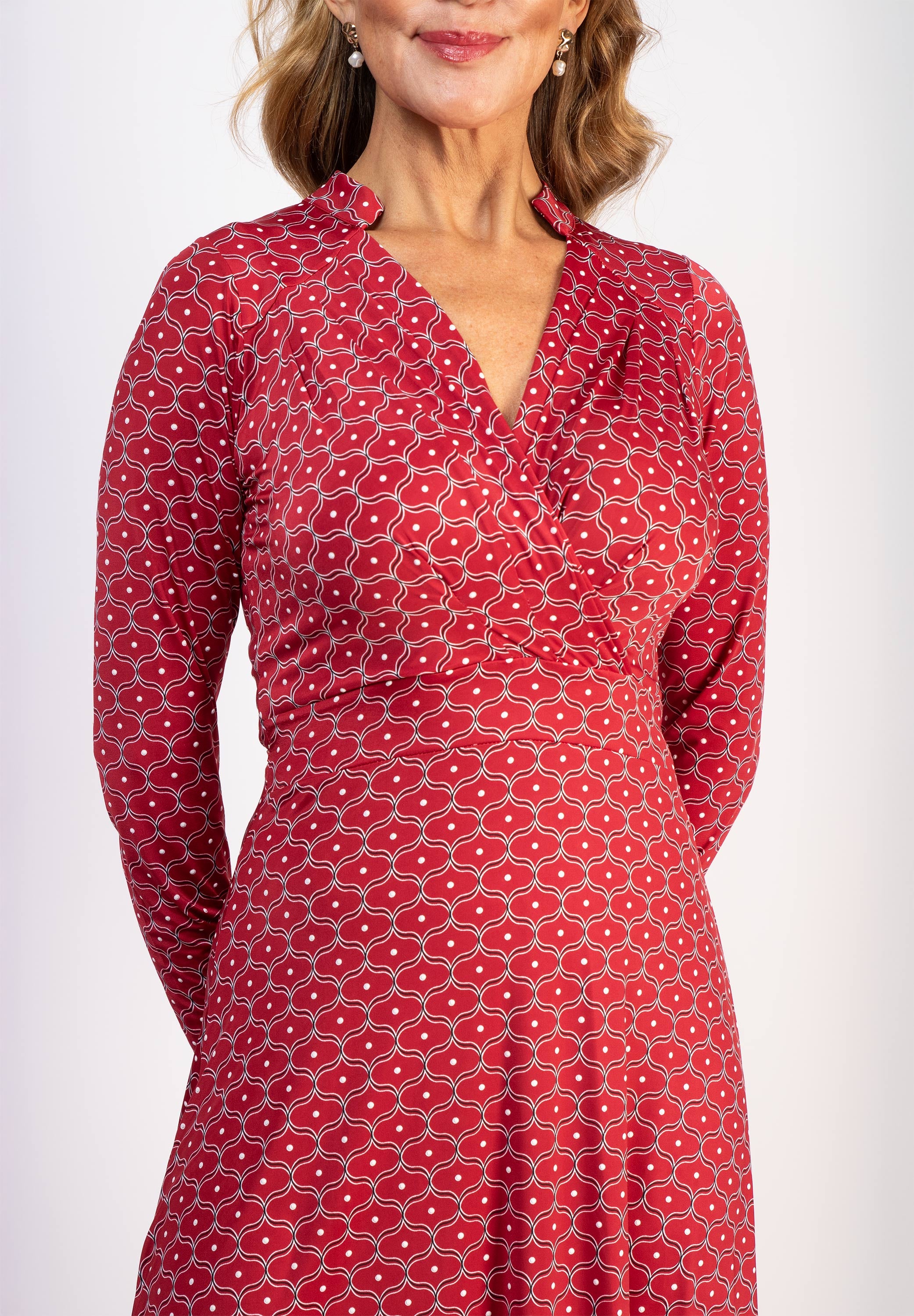 Klänningen har en figurnära överdel som ger en smickrande siluett och lång ärm. V-ringning med en stående krage. Avskuren i midjan med ett smalt band som knyts bak i ryggen.