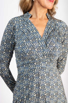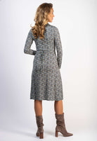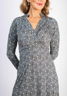 Klänningen har en figurnära överdel som ger en smickrande siluett och lång ärm. V-ringning med en stående krage. Avskuren i midjan med ett smalt band som knyts bak i ryggen.