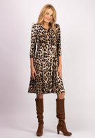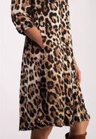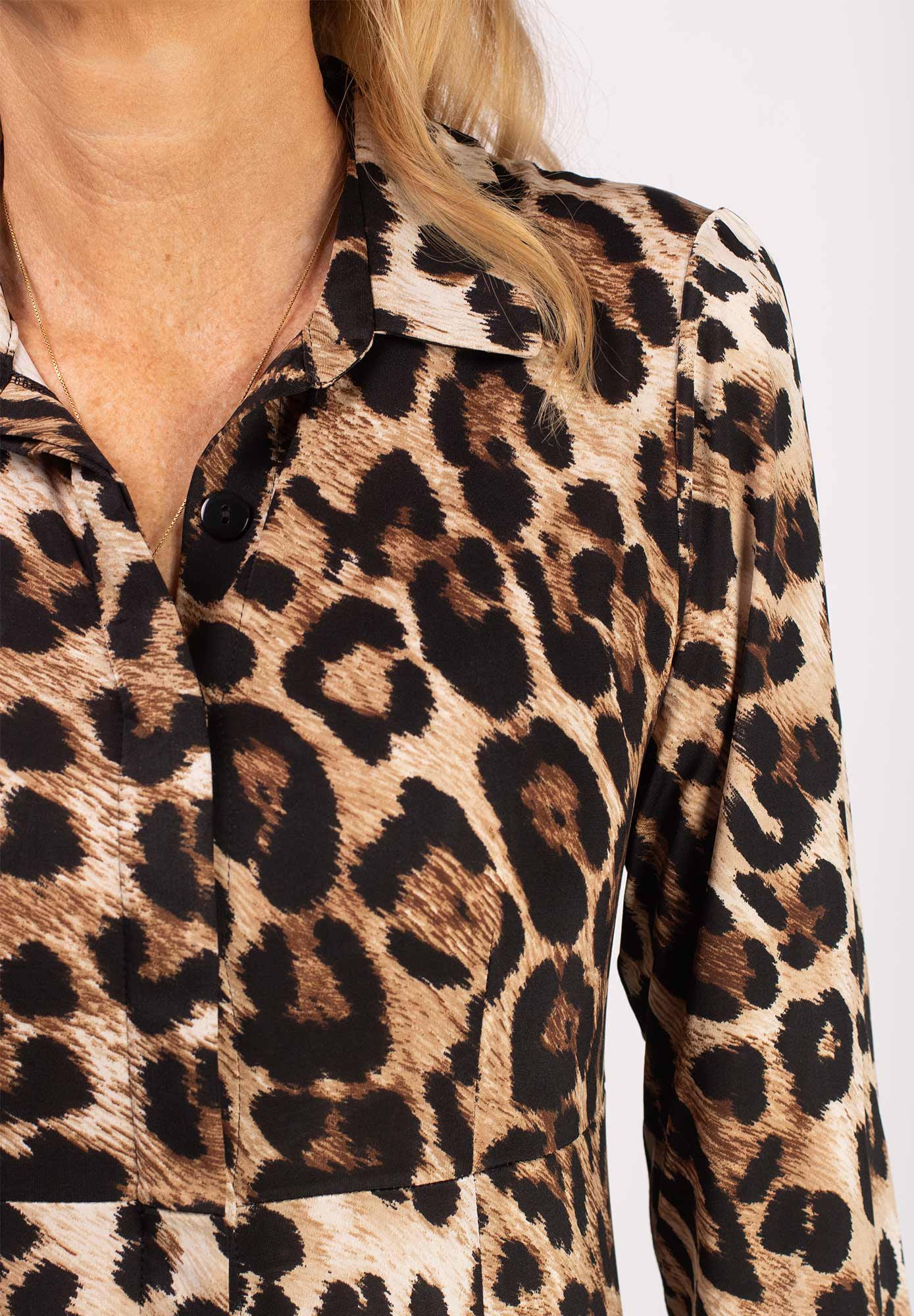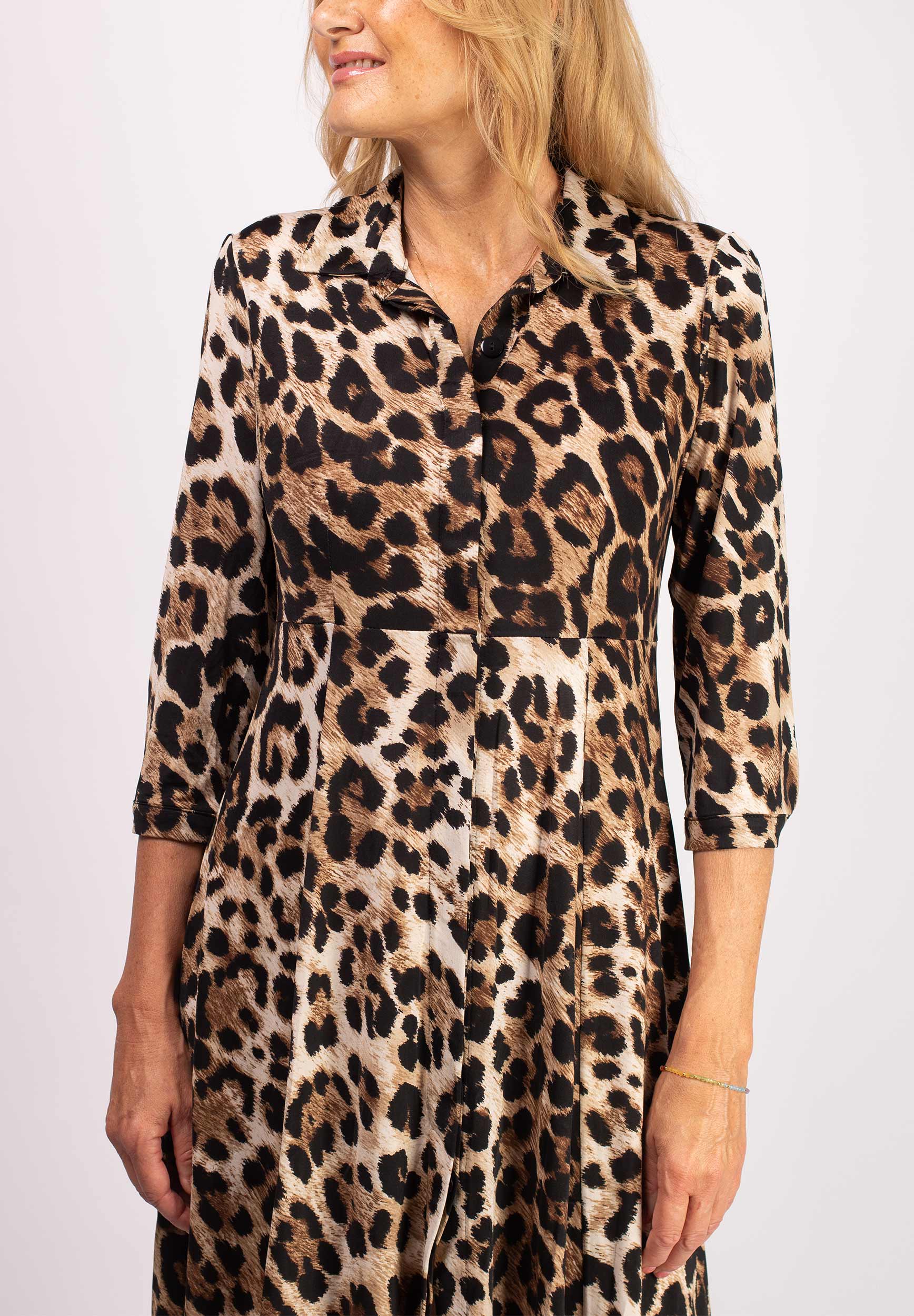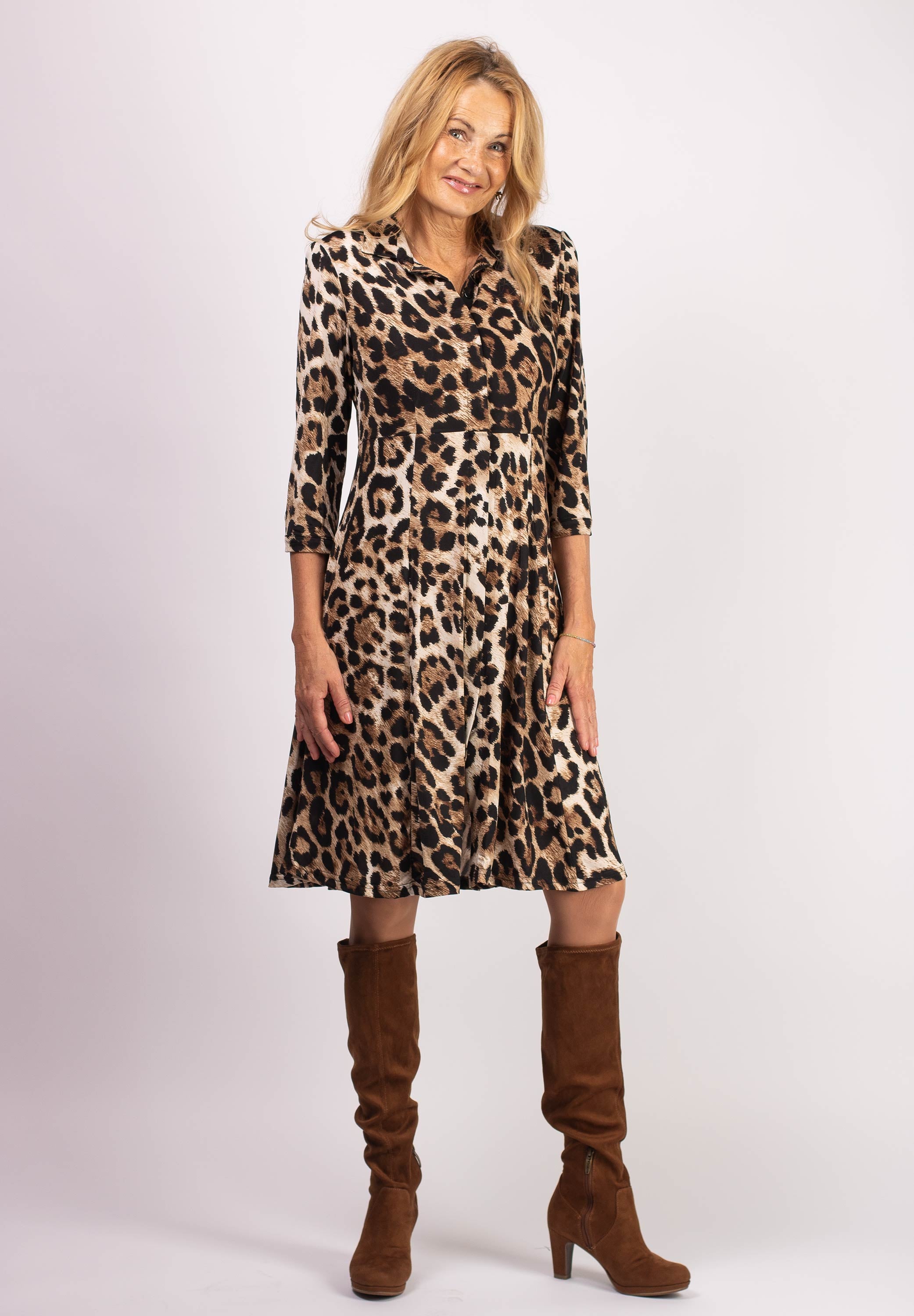 Kort skjortklänning med dold knäppning. Avskuren vid midja med utställd kjol med fickor. Snygg att bära både stängd och öppen.