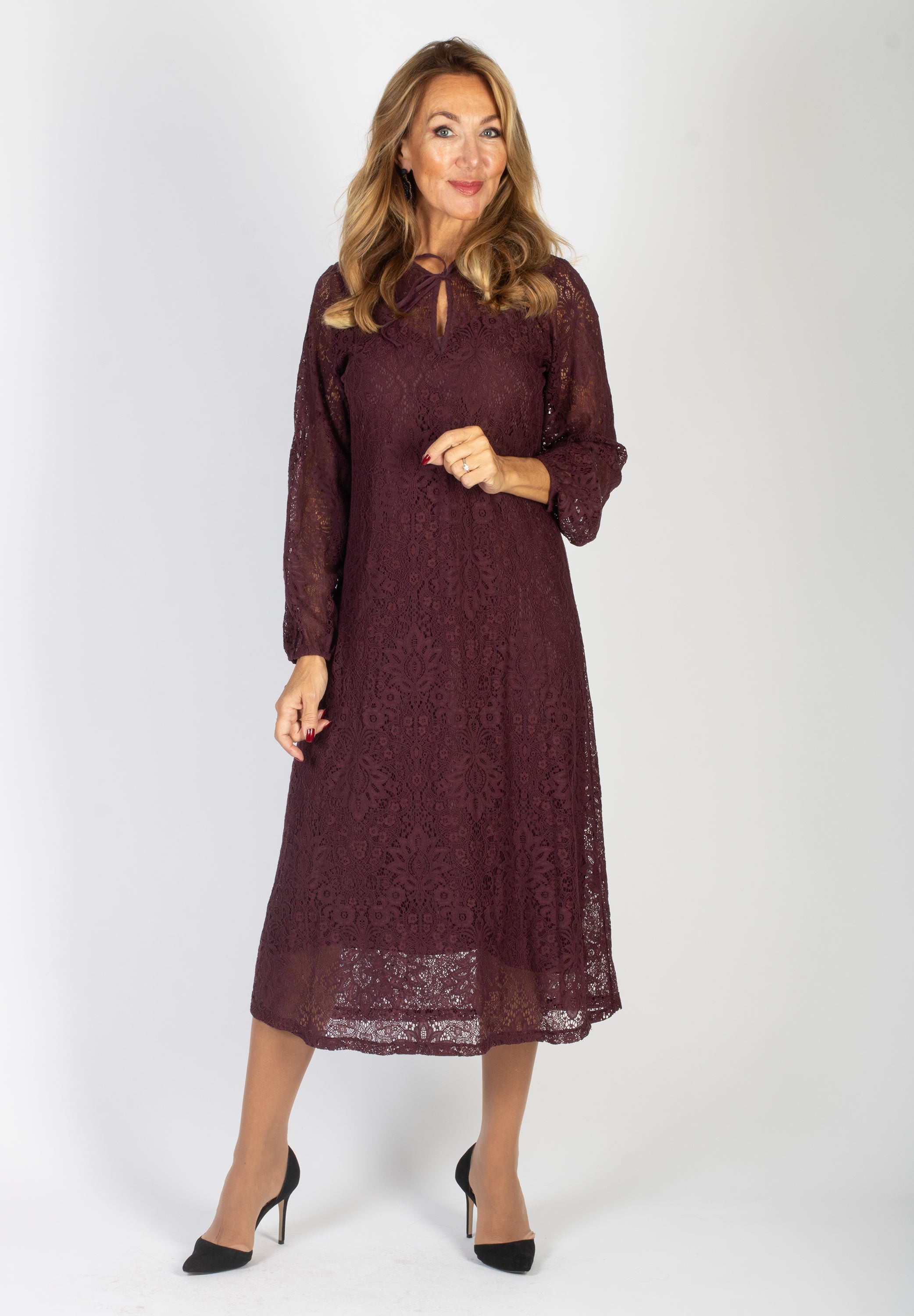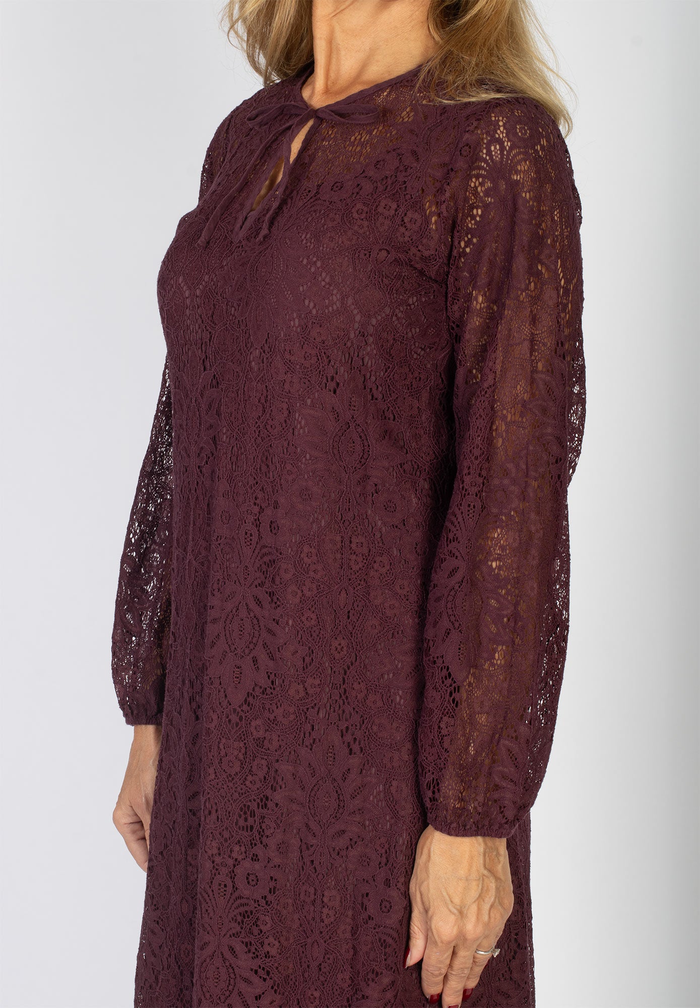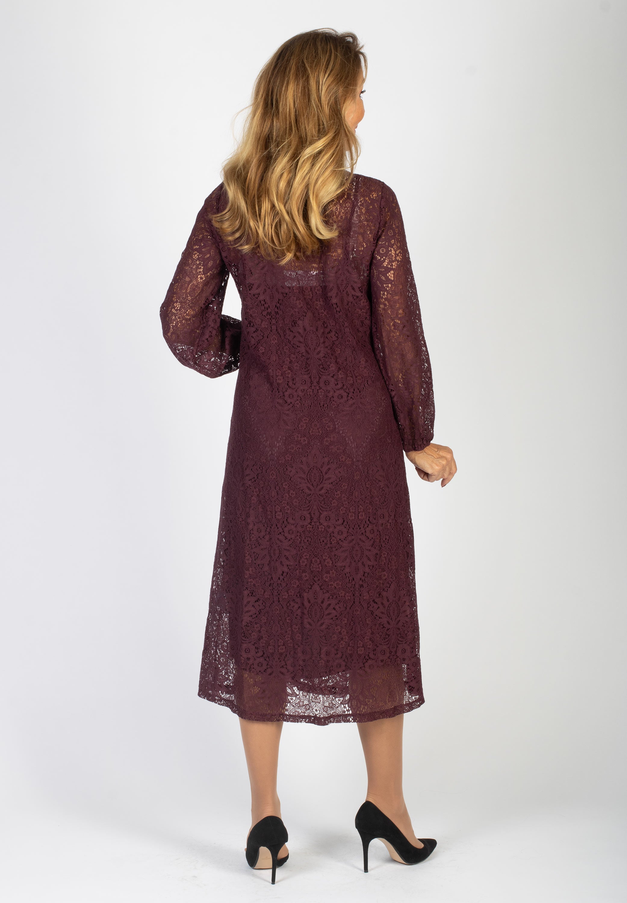 En tidlös spetsklänning med figursmickrande A-linjeform. De långa ärmarna är lätt genomskinliga med resår i ärmslut – en vacker kontrast till den mjuka, täckande underklänningen som ger både komfort och extra täckning. V-ringad hals med diskret knytband framtill för en feminin, stilren finish.