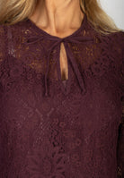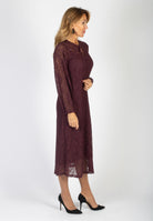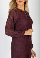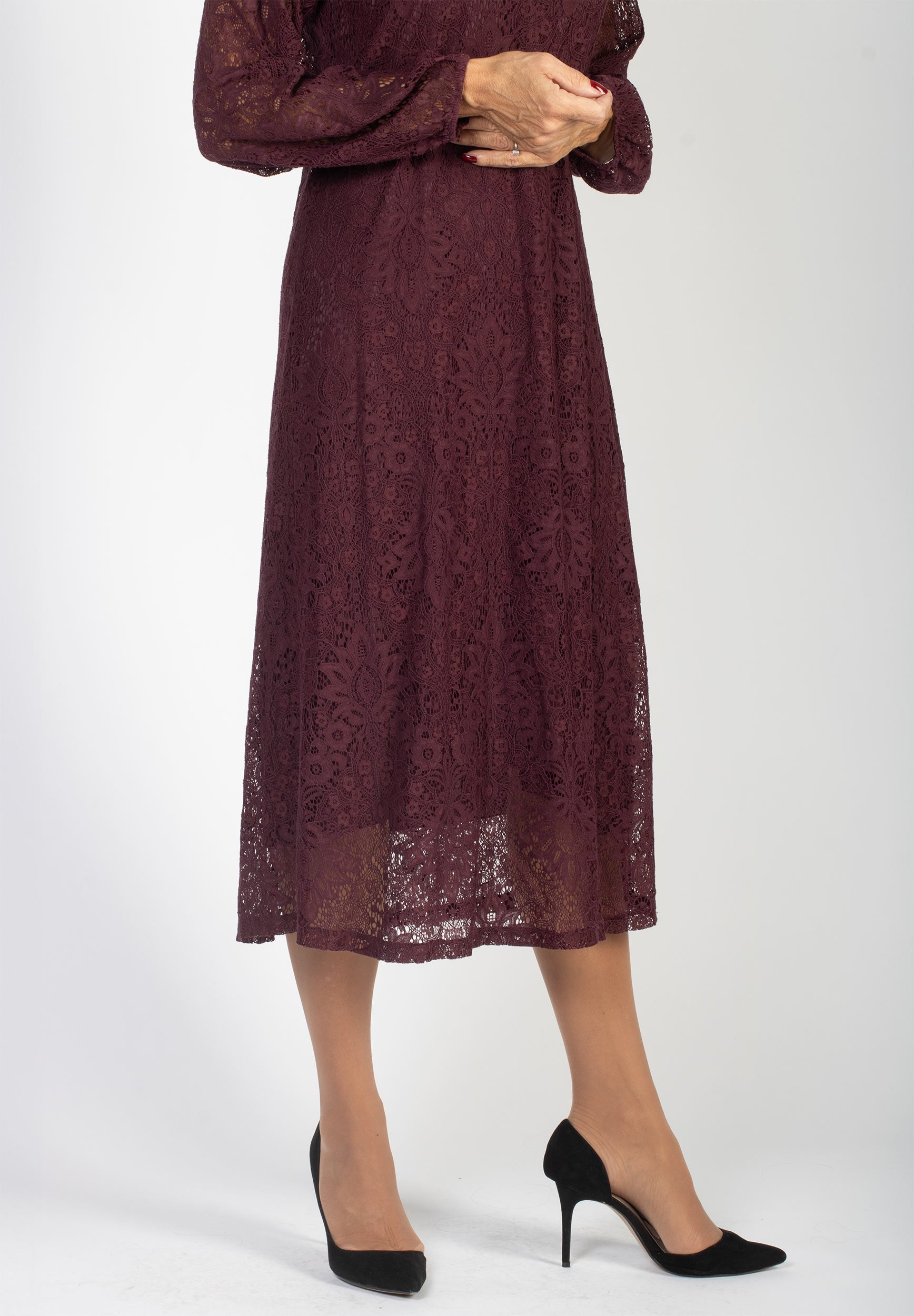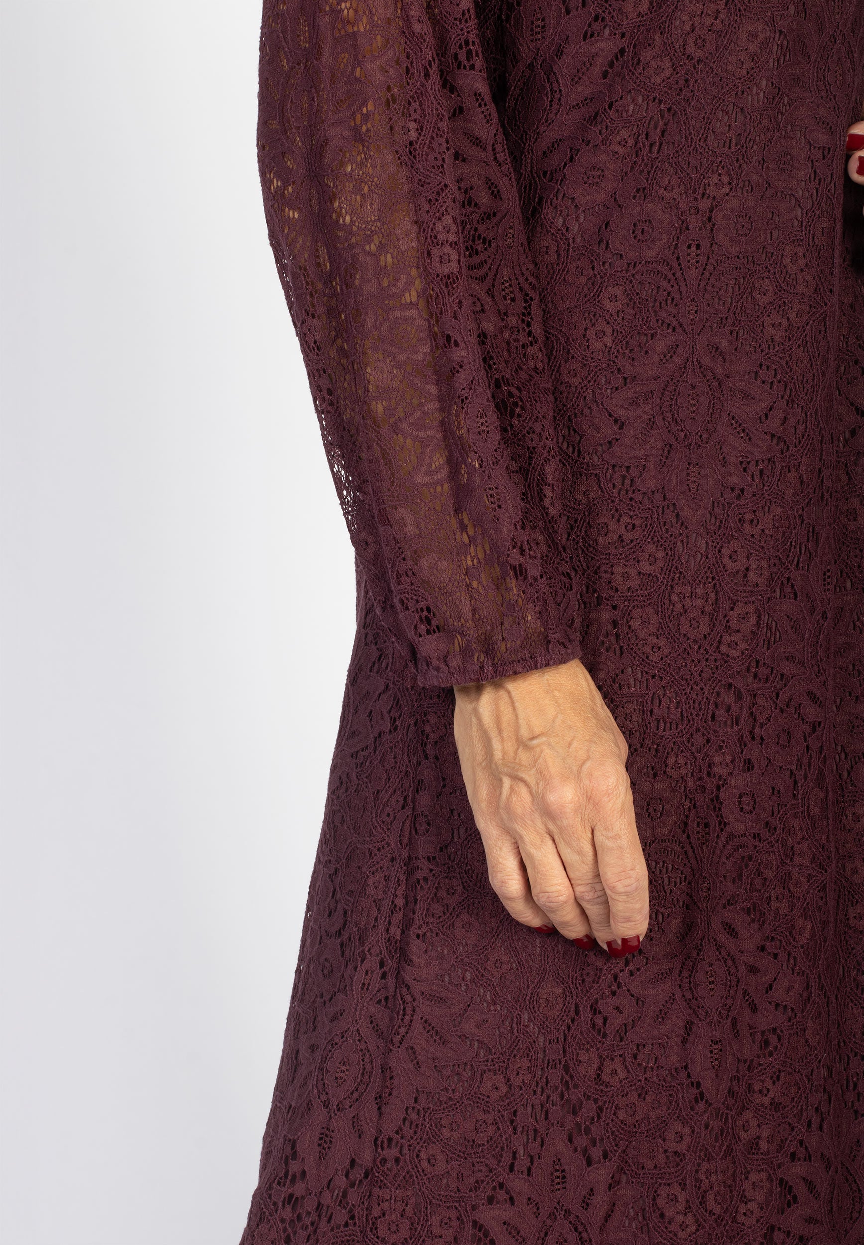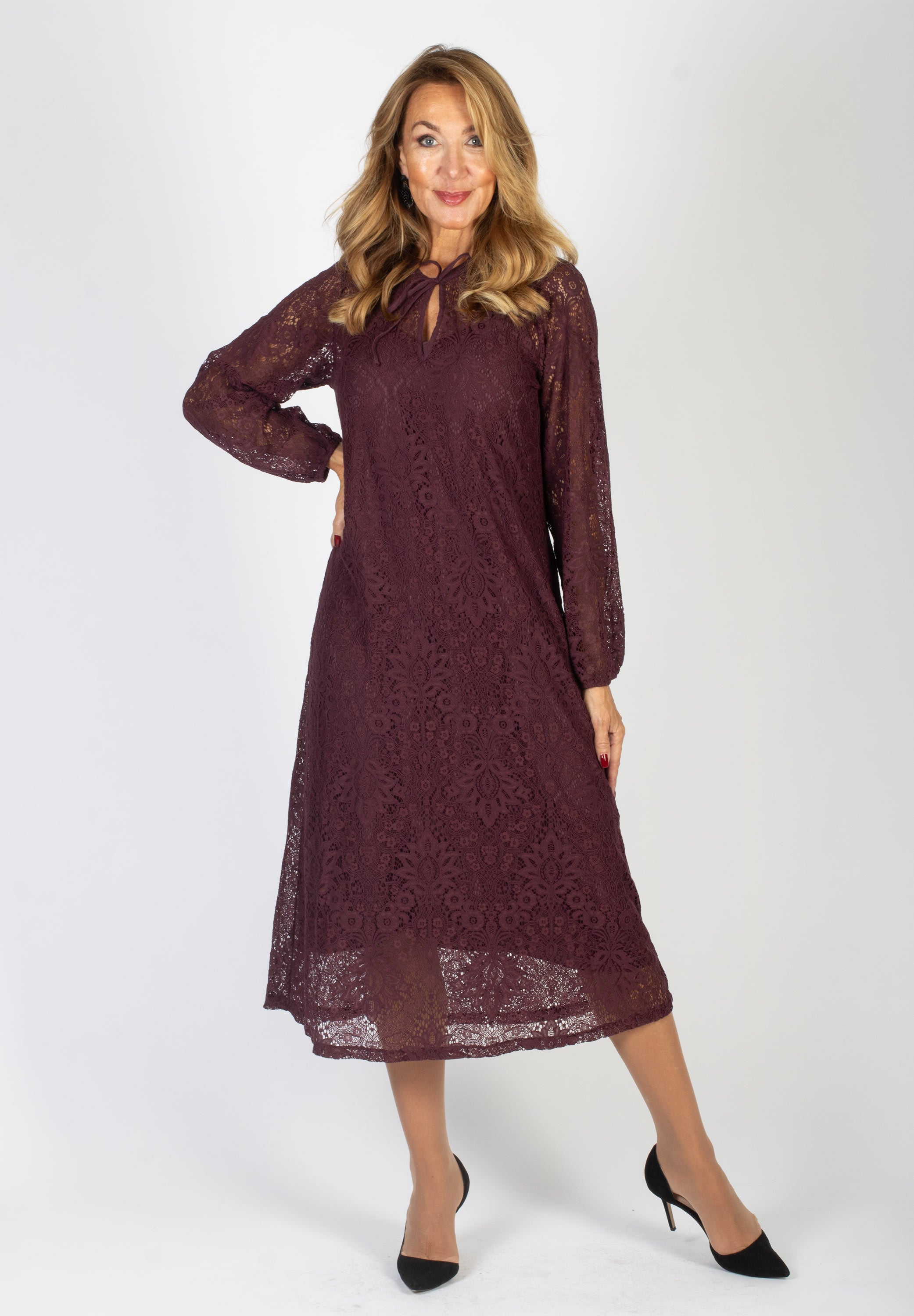 En tidlös spetsklänning med figursmickrande A-linjeform. De långa ärmarna är lätt genomskinliga med resår i ärmslut – en vacker kontrast till den mjuka, täckande underklänningen som ger både komfort och extra täckning. V-ringad hals med diskret knytband framtill för en feminin, stilren finish.
