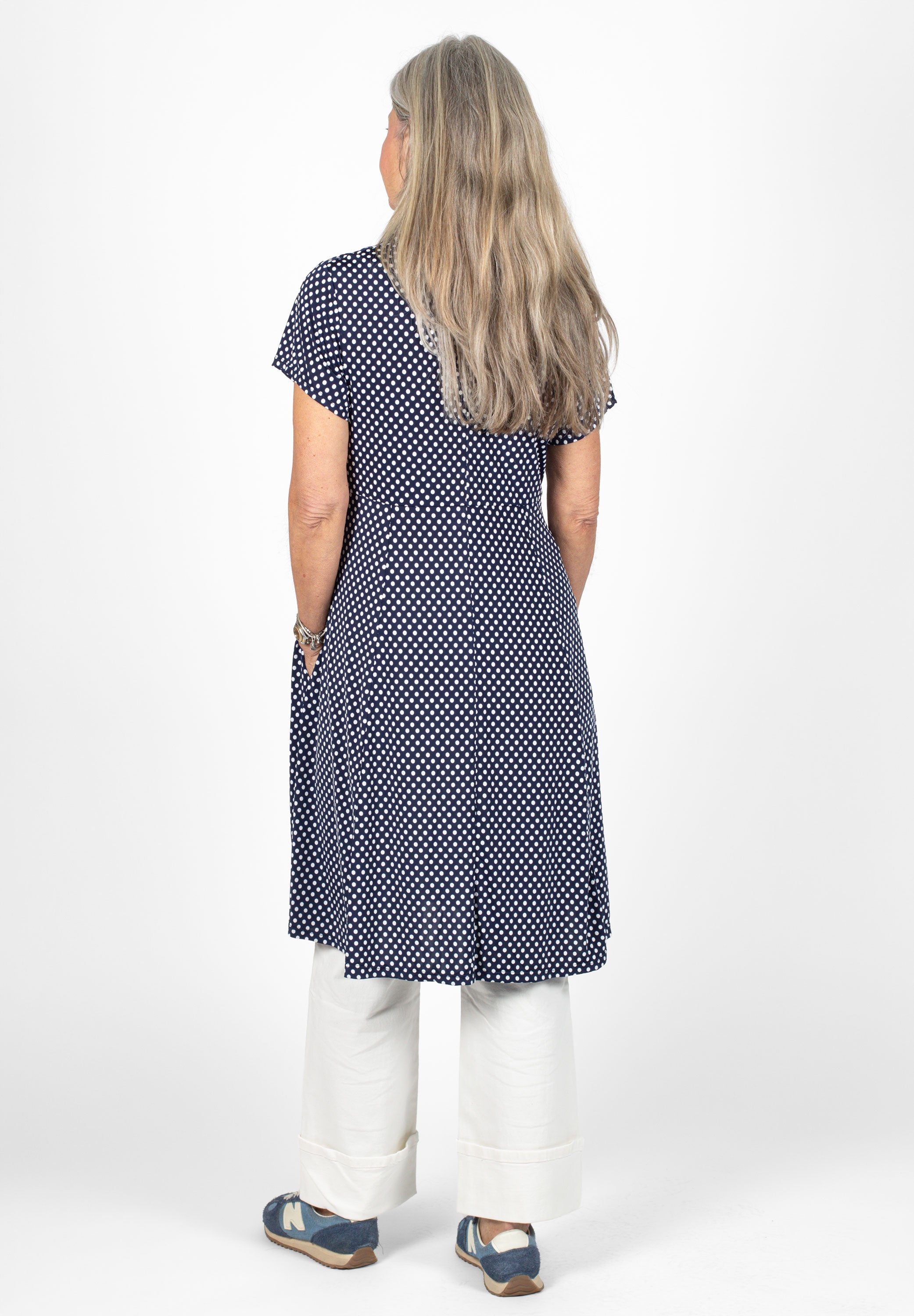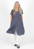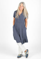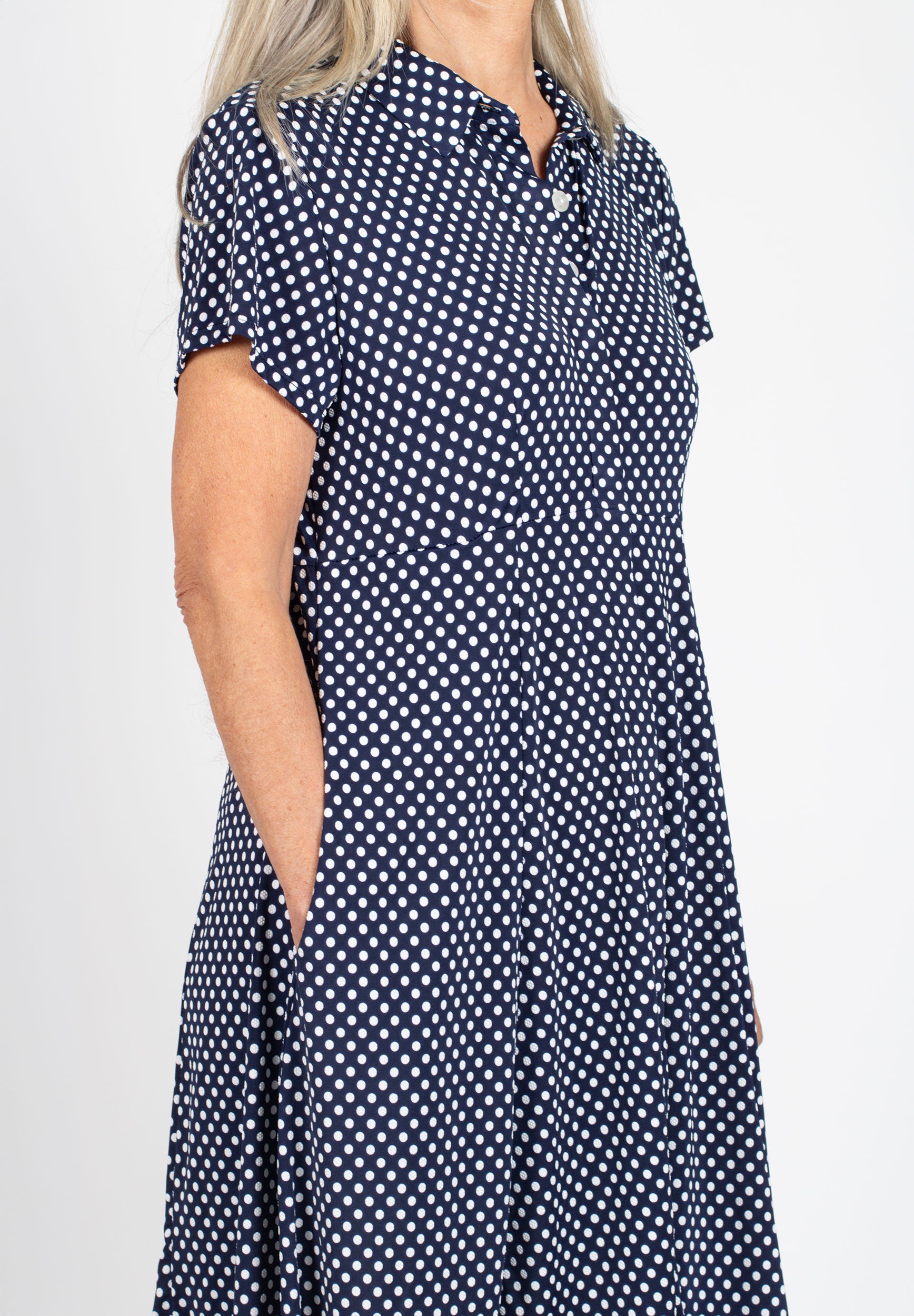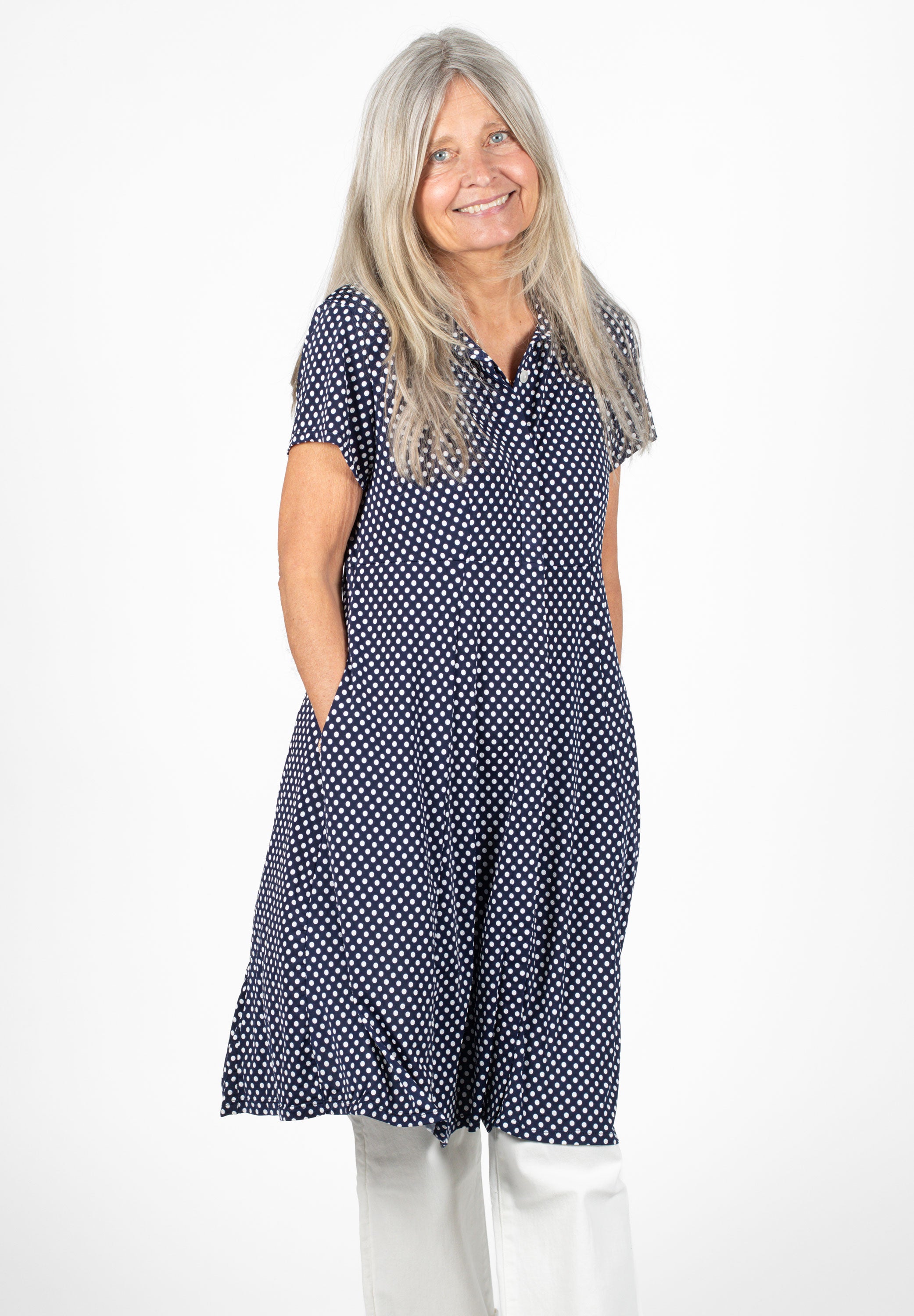 Kort skjortklänning med dold knäppning. Avskuren vid midja med utställd kjol med fickor. Snygg att bära både stängd och öppen.