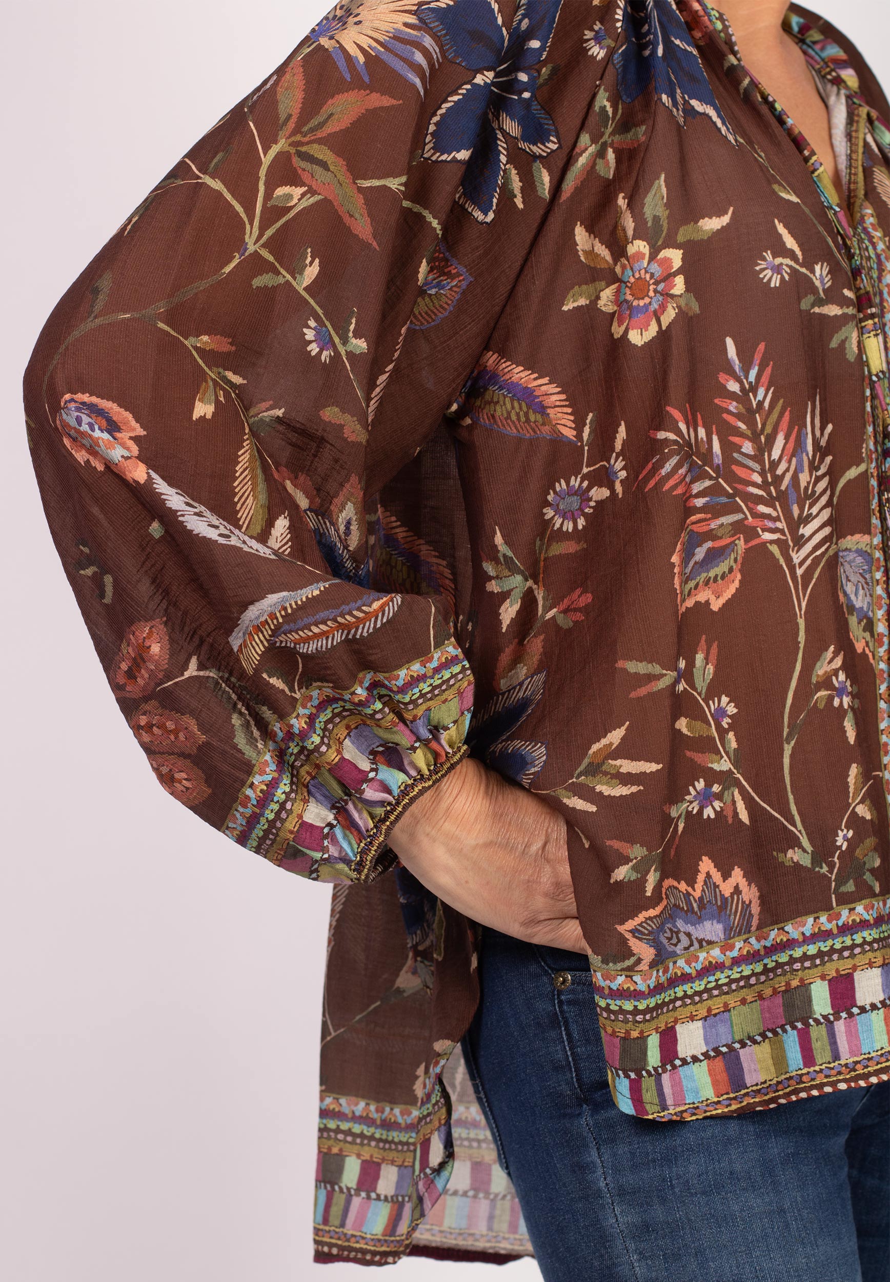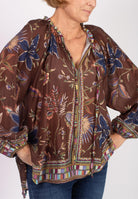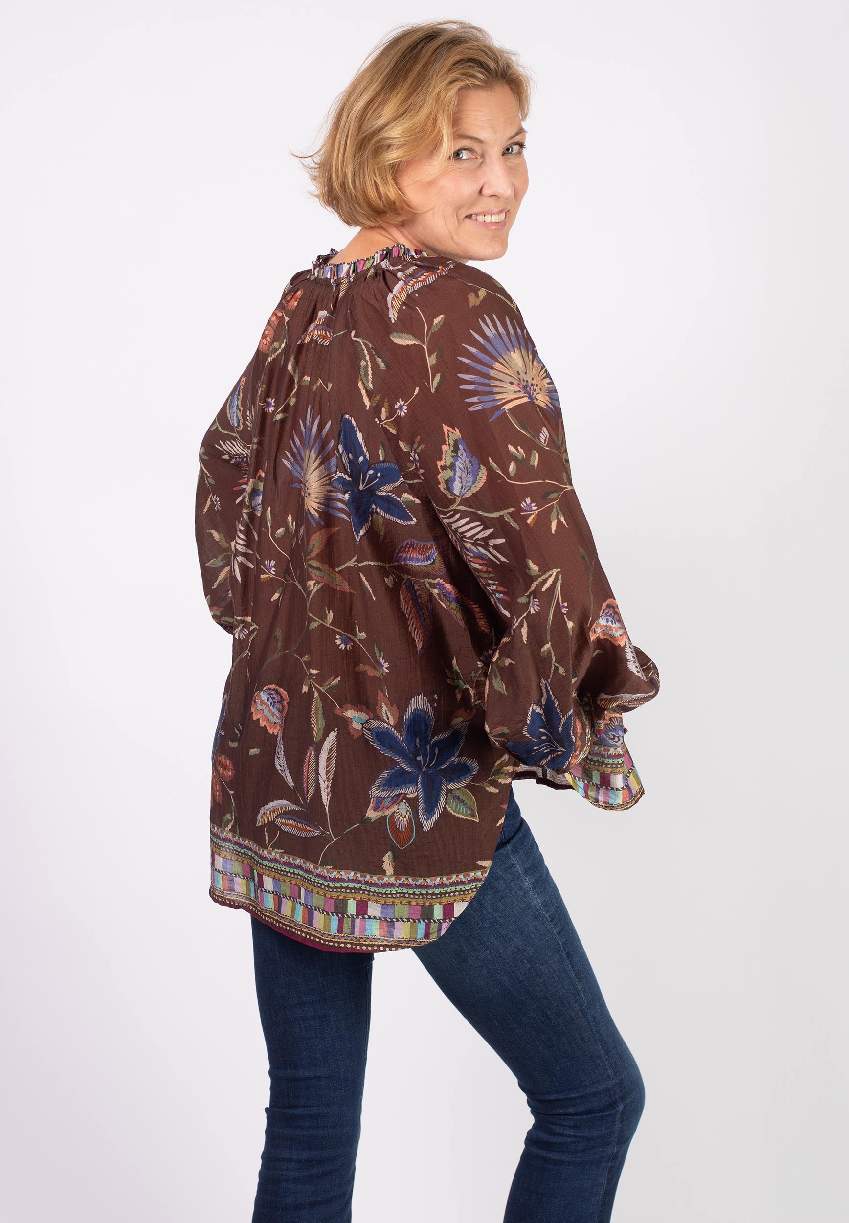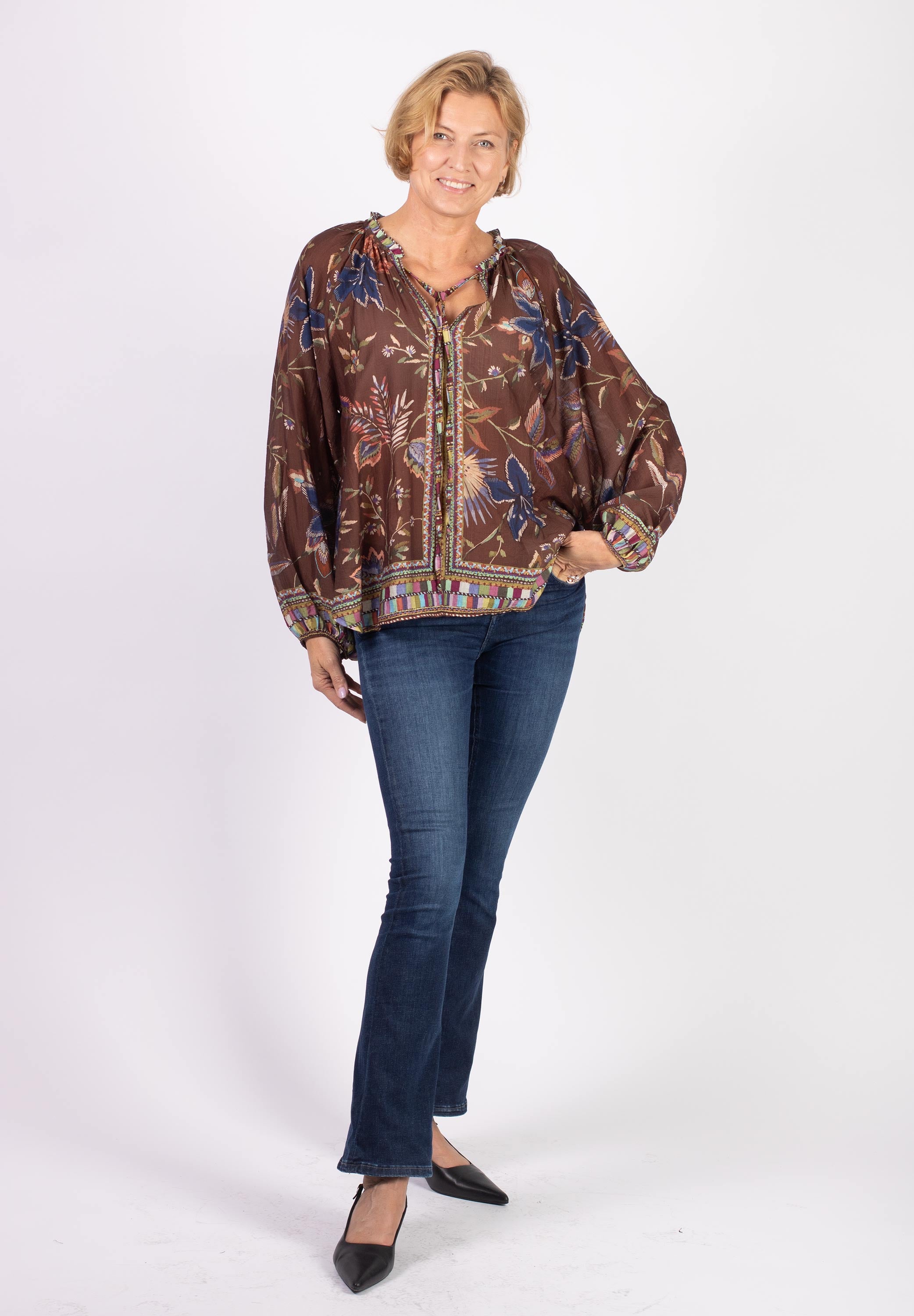 Blus med v-ringning och lång ärm med resår i ärmslut. Blusen har en avslappnad passform. One size