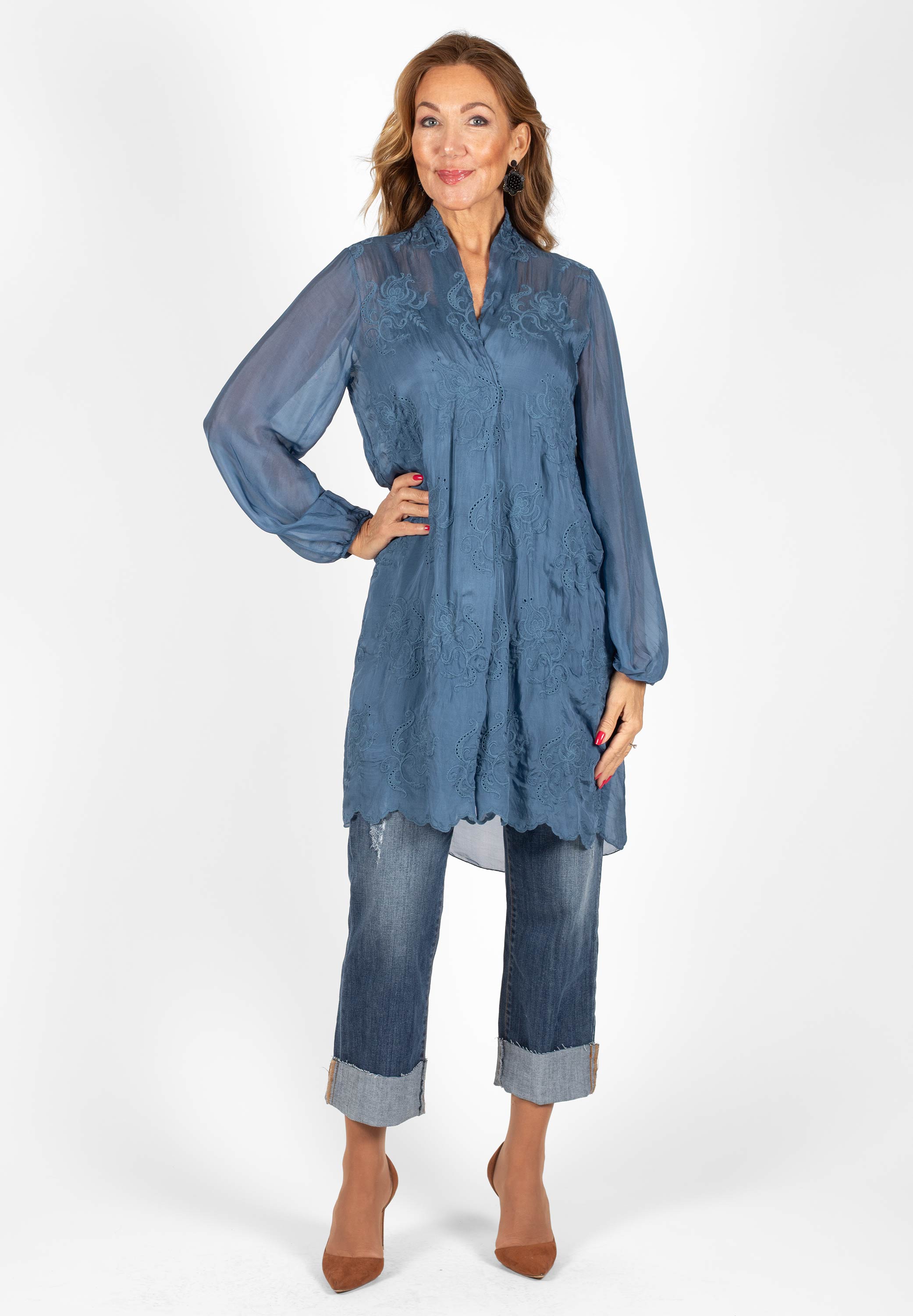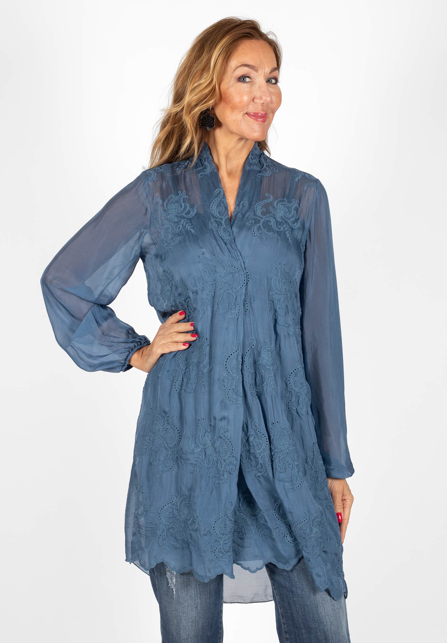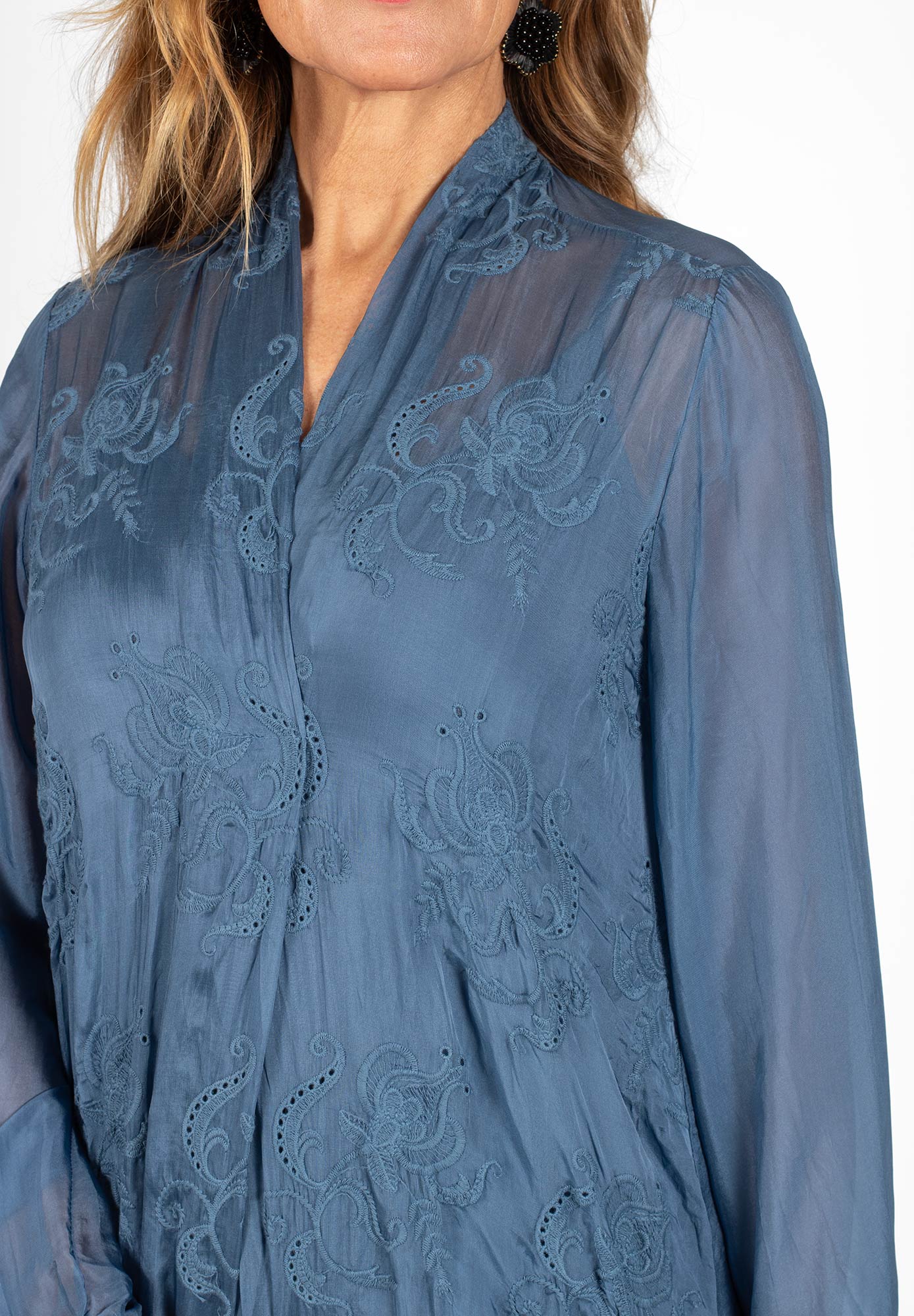 V-ringad tunika med broderade detaljer. Tunikan är lätt transparent och levereras med ett matchande underlinne för en bekväm och täckande passform. Lång ärm med resår i ärmslutet.