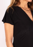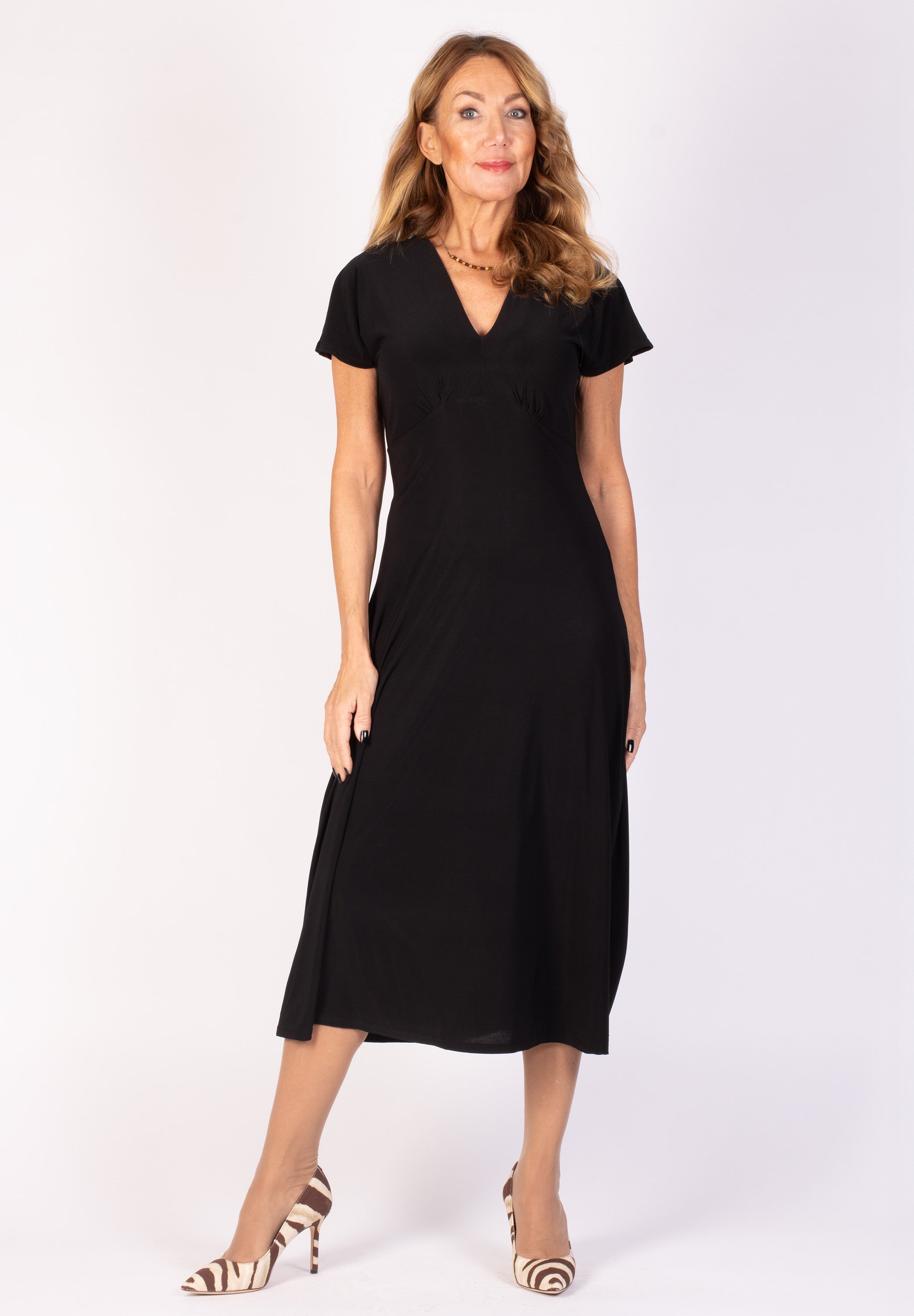 Freja är en midiklänning med V-ringning och formsydda kupor. Den är avskuren under bysten och har en kort holkärm.